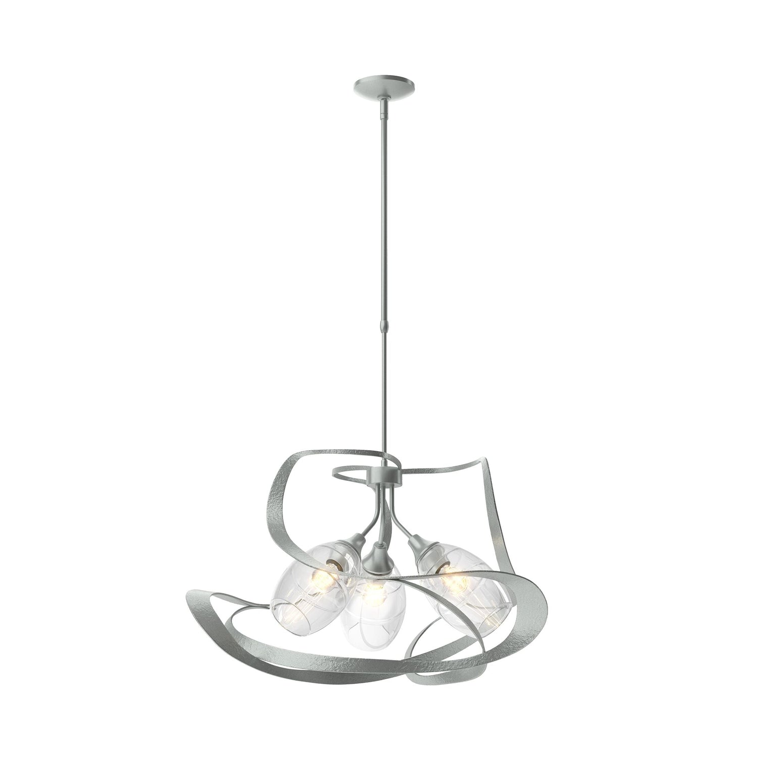 Sculptural steel lends itself to the free-flowing style of the Nest Pendant. Every angle provides a graceful organic composition. Three thick blown-glass shades, with contoured detailing, cast a soft ambient light over a wide area.