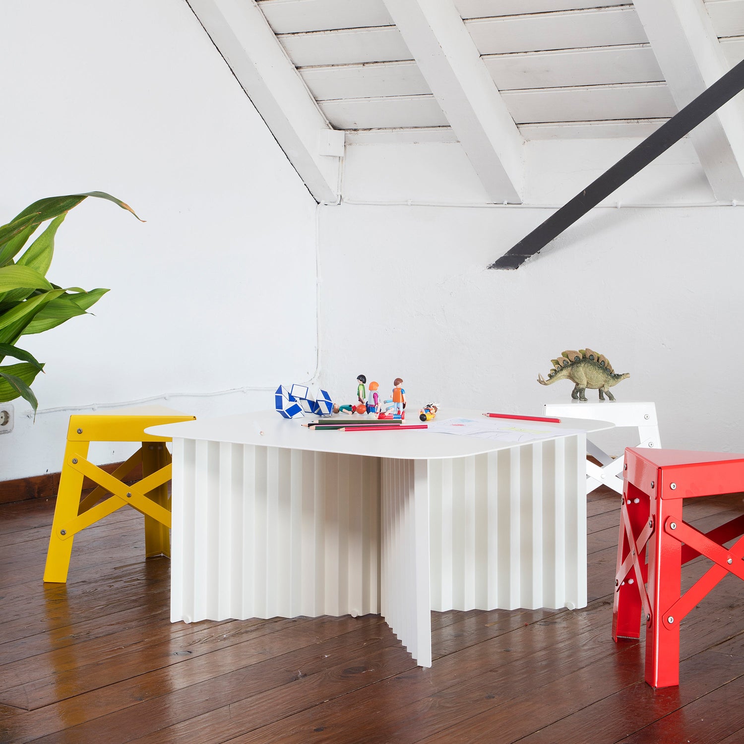 The Plec family is made of steel which is thought of as a tough, strong, heavy and totally stable material. In its sheet format, steel is both malleable and flexible. A feature that allows us to mold it and give it such peculiar shapes as the folds of the Plec table.