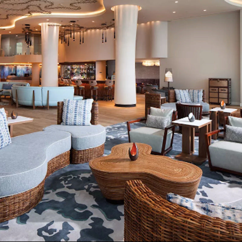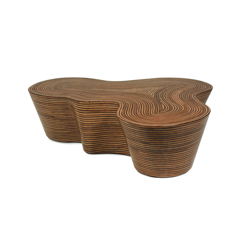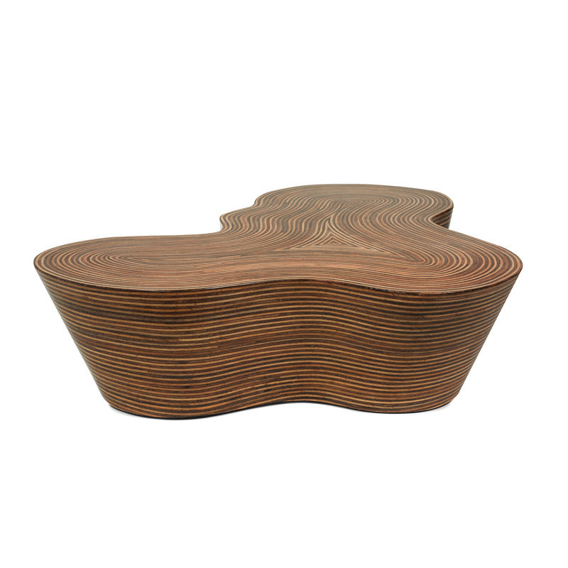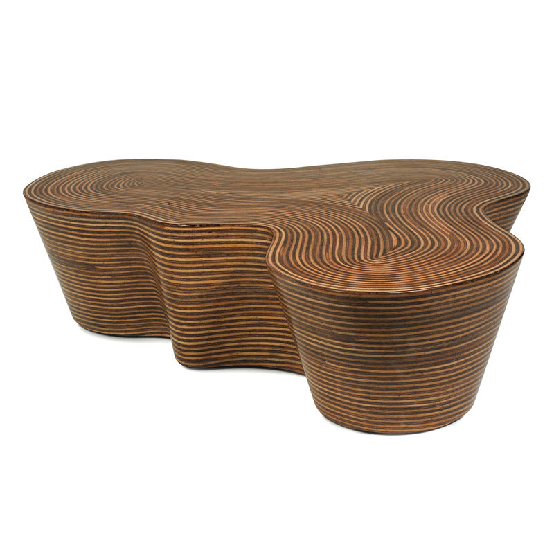 Natural materials and inorganic shapes combine to create the visually appealing Showtime Cocktail Table from Oggetti. Crafted from a combination of rattan strips and coco twigs inlaid side by side, then covered with resin, repeated sanding and more resin give this table a lustrous finish that is unusual and much coveted. With a unique shape and visible grain, this cocktail table is perfect in a coastal living space surrounded by woven rattan furniture pieces and rich blue textiles. Abstract in shape, this table makes an impression in any space its in from lounge, master bedroom, to living room.