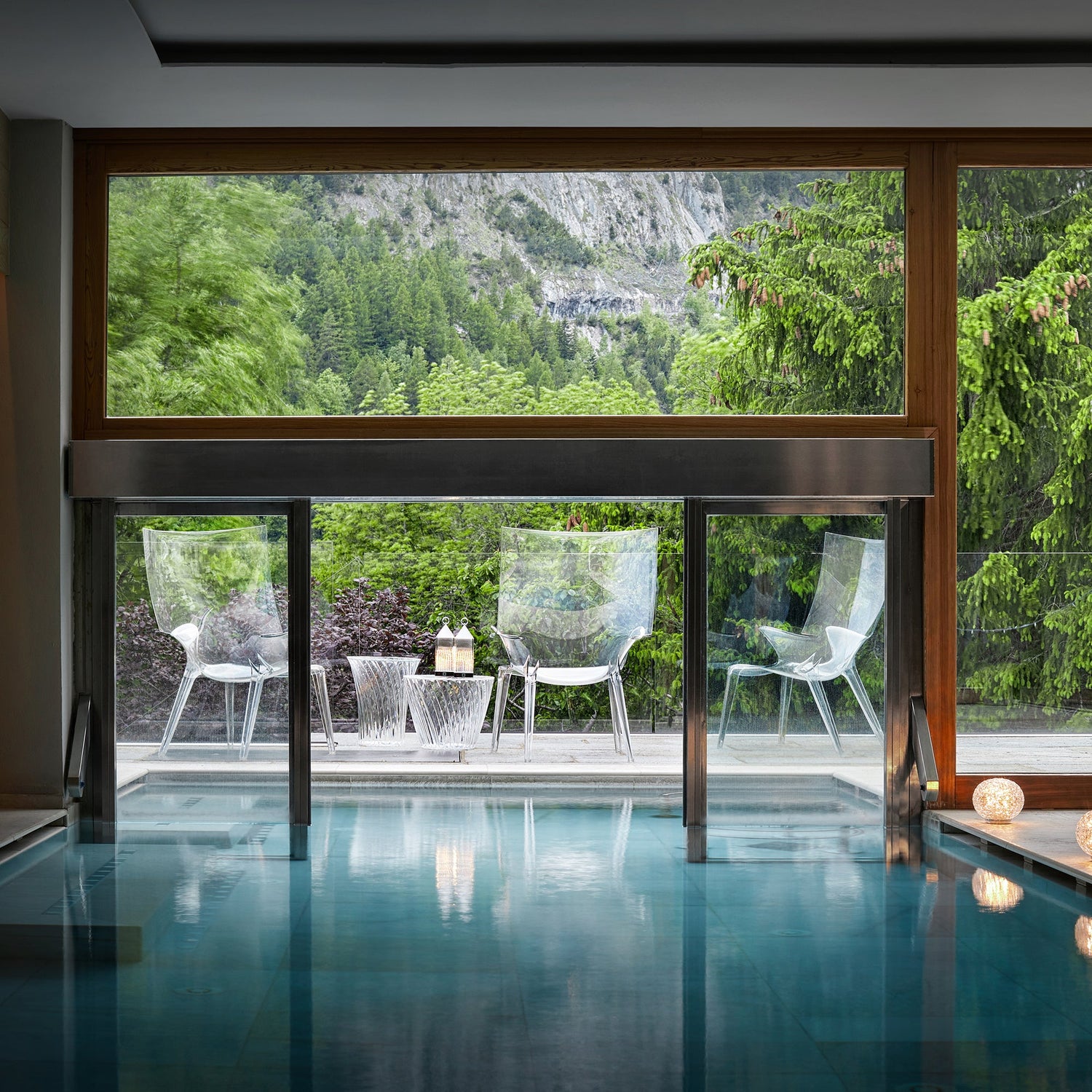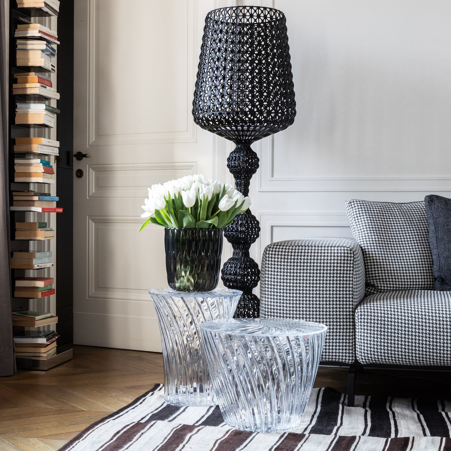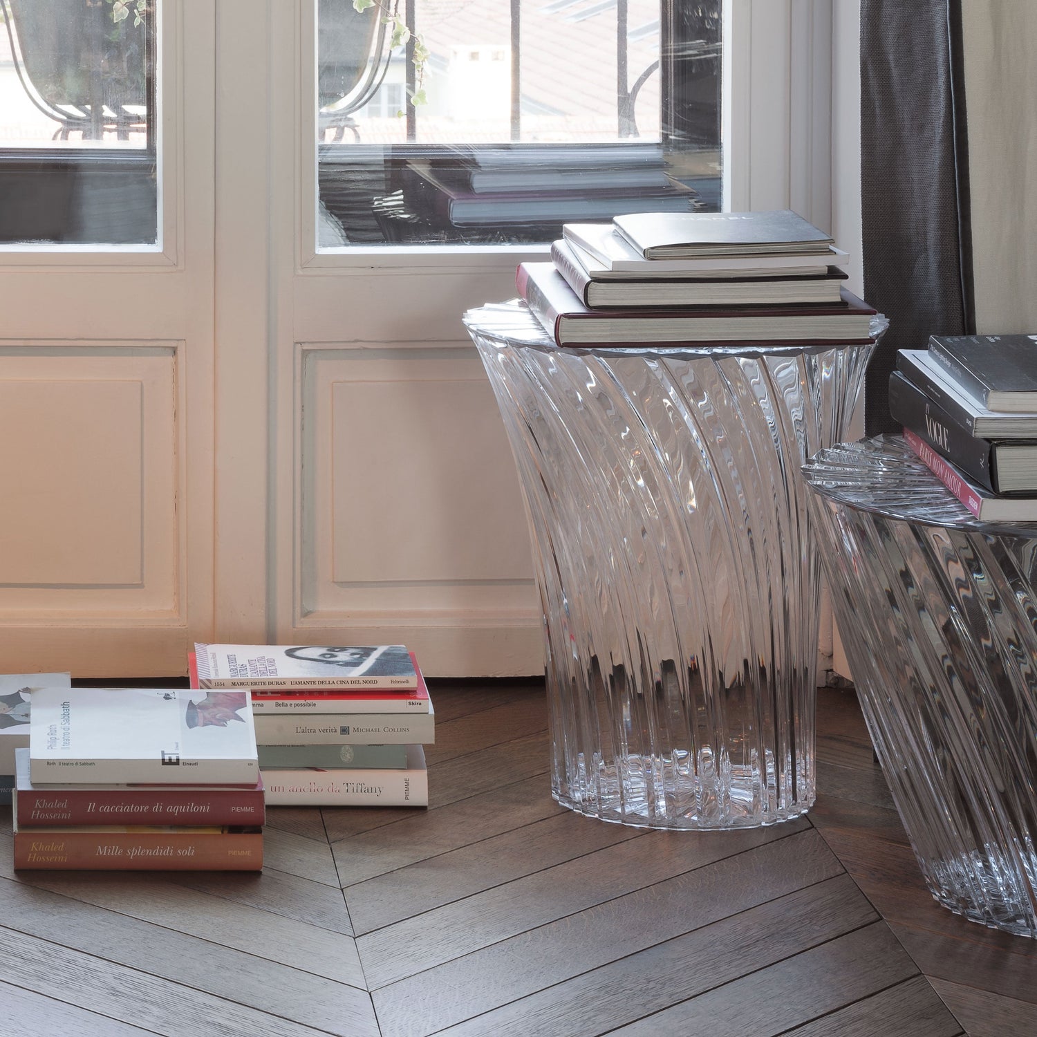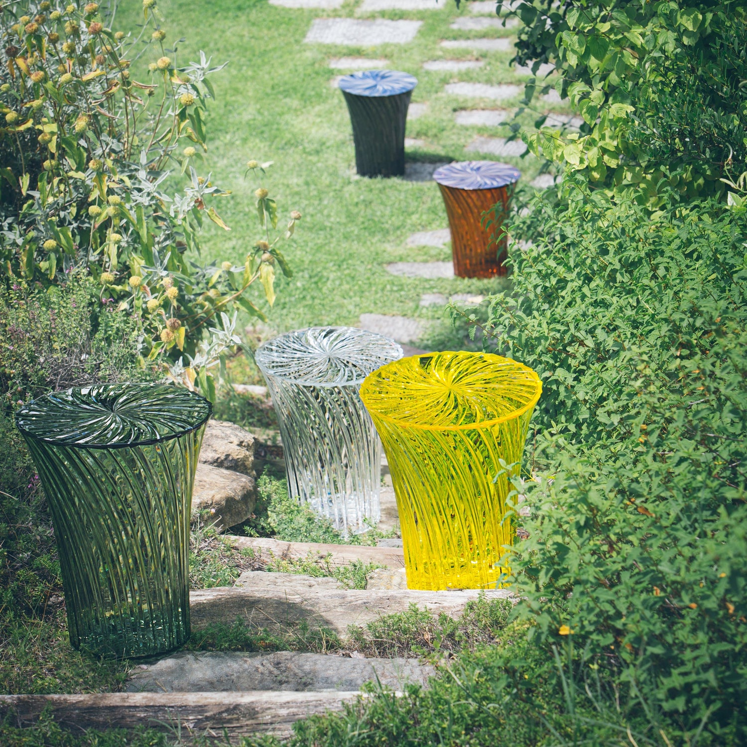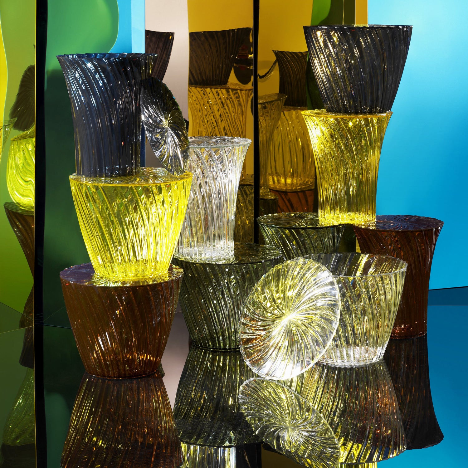 Tokyjin Yoshioka's new Sparkle stool and table collection are as striking as a brilliant ray of sunlight. The plastic's unique pleating (both inside and out) is reflected in the end result: two new jewels for the home, that look like precious gems... diamonds or sapphires, emeralds, topaz or rubies, depending on the color chosen. Can also be used outdoors and are scratch and impact-resistant.