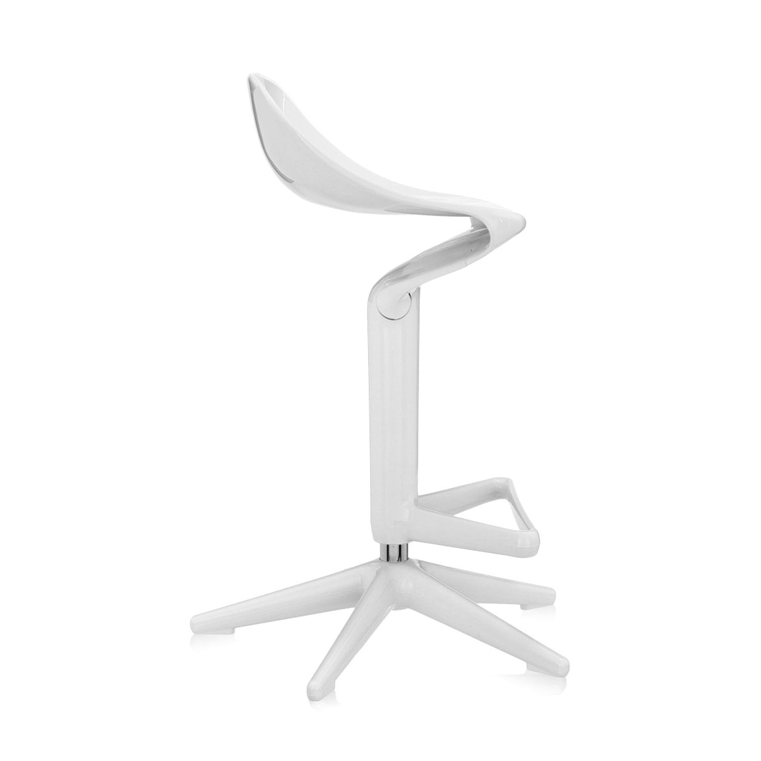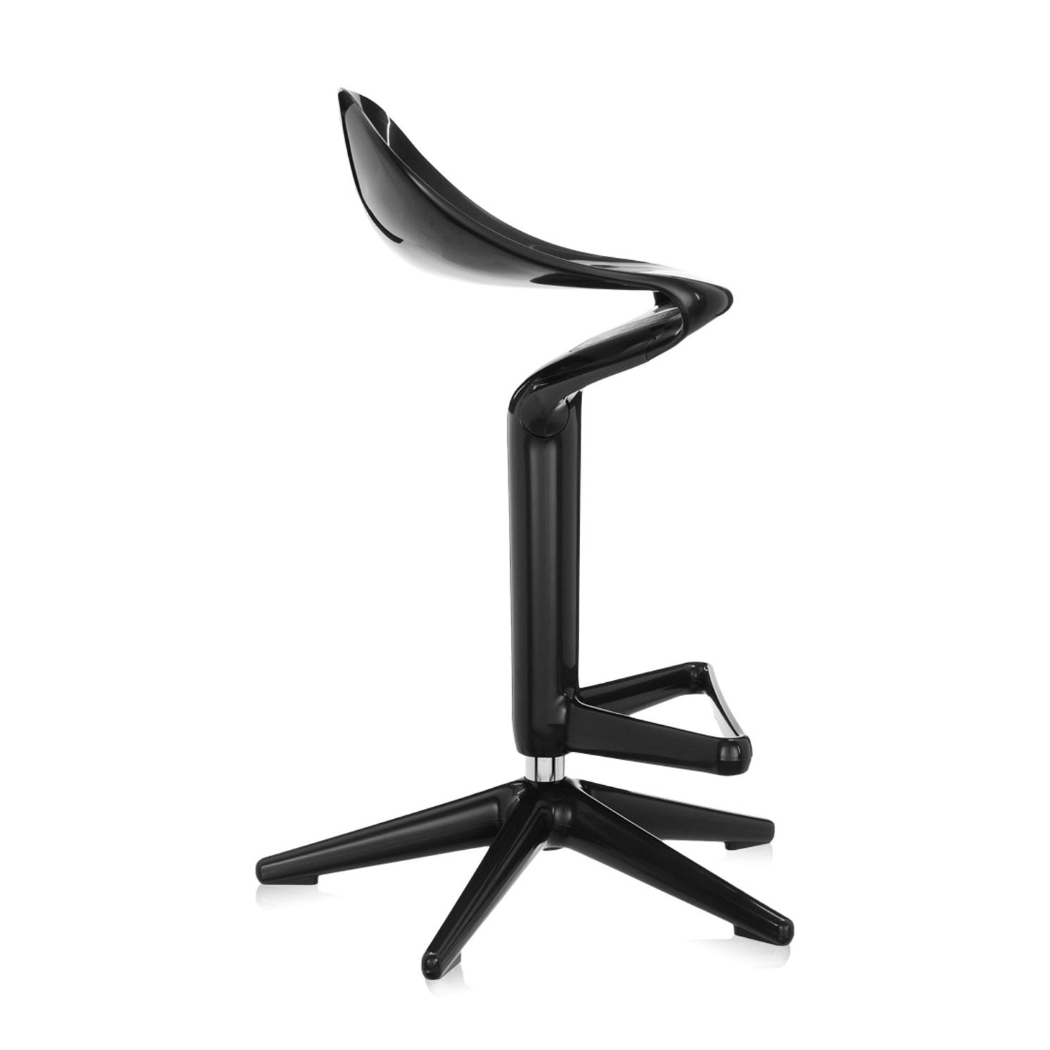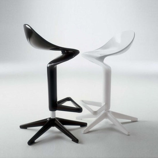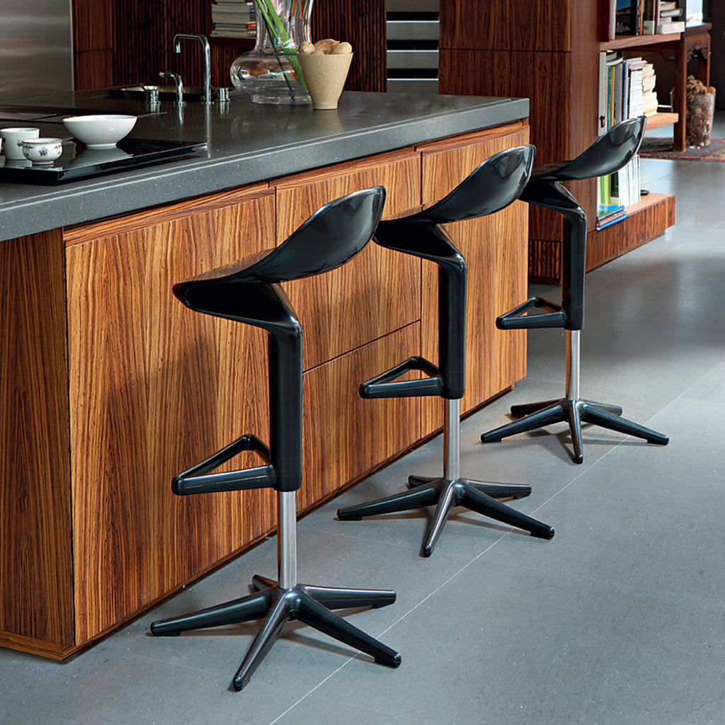 An original stool that is equally functional. The innovation of Spoon consists mainly in attaching the seat to a central support with a specially reinforced curve that guarantees flexibility and comfort. Furthermore, because of a sophisticated design solution, the gas lift pump adjusts to heights between 22 1/3 and 30 inches and is perfectly inserted into the stem. In the same ingenious fashion, the handle that regulates this mechanism is perfectly concealed inside the seat. Spoon lends itself to any surrounding: kitchens, bars and restaurants.
