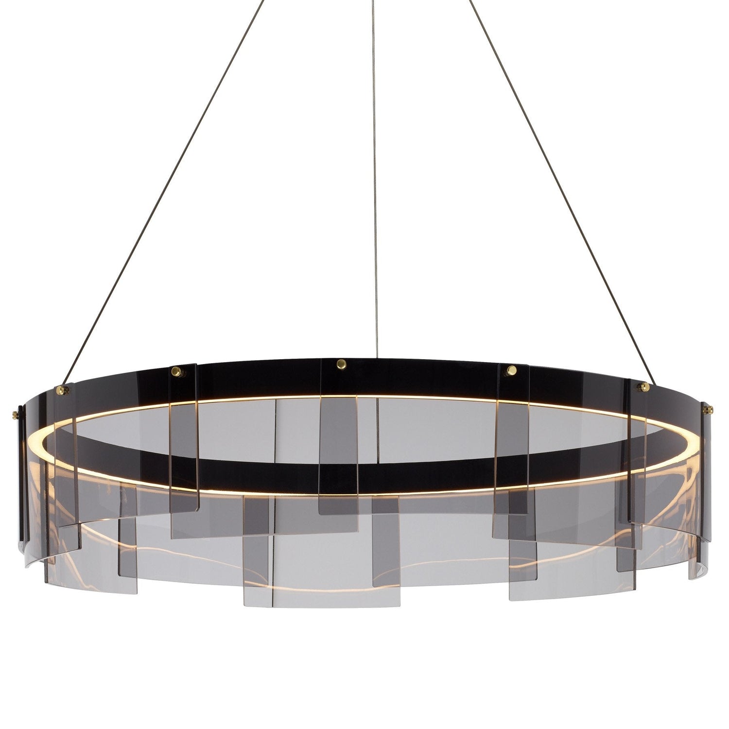 The overlapping panes of gently curved glass instantly define the Stratos LED chandelier from Tech Lighting. The collection of slumped transparent or frosted glass combine to create a shade which surrounds a smoothly diffused, fully dimmable LED source, all within an ultra-slim profile. One diameter option of 30 in, plus a coordinating Stratos wall sconce light enable this modern lighting collection to be scaled from residential dining room lighting, kitchen island lighting and media room lighting applications to commercial hospitality lighting and corporate lighting applications.