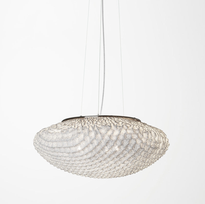 Painted stainless steel mesh and thread. Arturo Alvarez takes materials out of their usual context, exploring their possibilities up to the point of achieving surprising results. He begins with an apparently cold steel mesh or thread, that he folds, curves or embroils, forming organic elements. He transforms it with these crafting techniques in warm and pleasant forms... bringing it to life. A whole universe of designs develops from this way of working. They all radiate a subtle elegance and delicacy, full of movement, and shine an intense light through them. Painted stainless steel is a compact and resistant material, that won't wear out as time goes by.