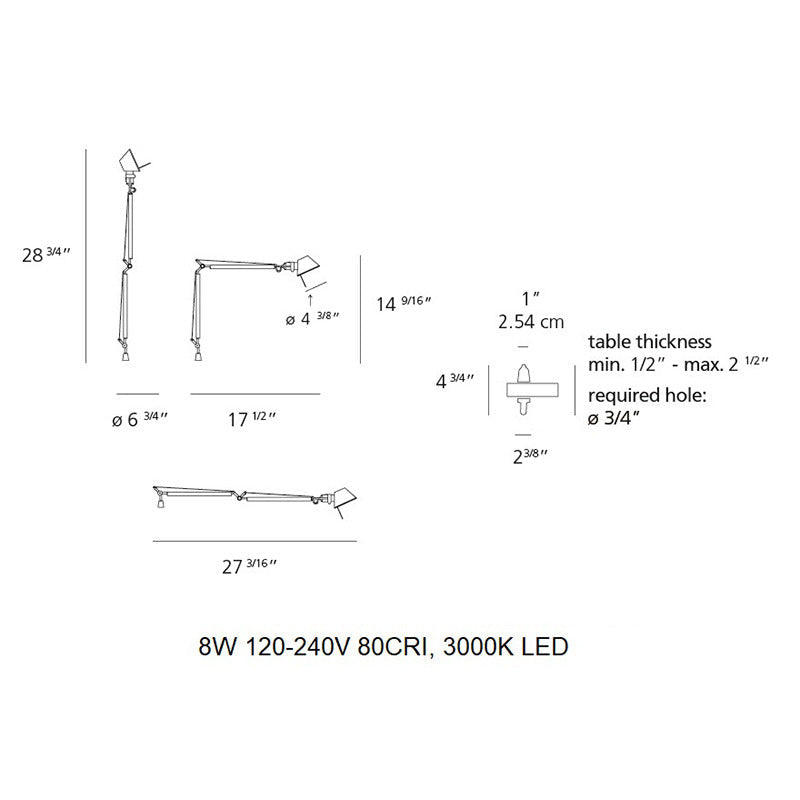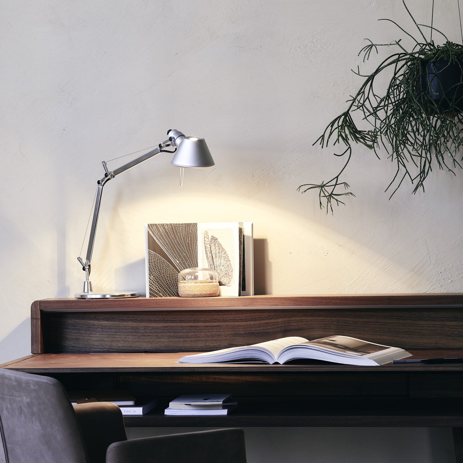 Table standing luminaire for adjustable, direct task, LED lighting. Maintaining the reduced dimensions of the diffuser of the Tolomeo micro, it increases the power to 9W and extends the dimensions of the structure and arms enabling it to be used on work tables and desks.