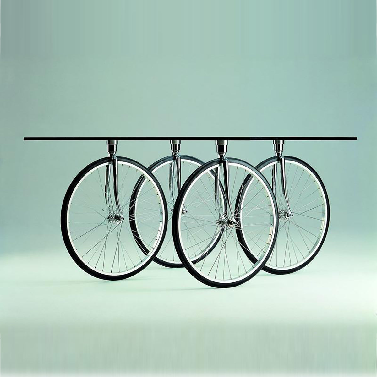 Tour is the evolution of the Table with Wheels. Again with wheels, but in this case taken from bicycles, it was a surprising piece. The beveled float glass top, 0.6 in thick, rests on 4 pivoting wheels attached to four stainless steel plates. The forks are chromed and the wheels are covered in rubber.