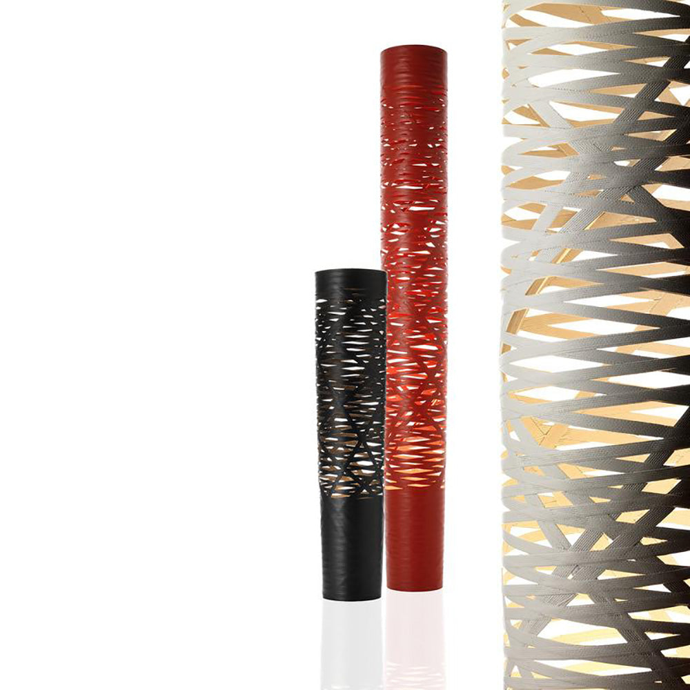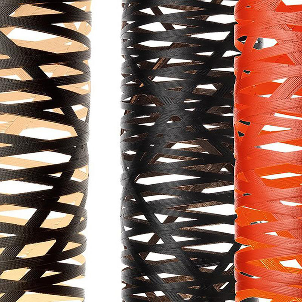 The seduction of a woman's tress was the initial inspiration for the Tress family of lamps. This design-come-true by Foscarini was achieved through the development of a completely original technological process, involving a fiberglass and resin tape woven with orderly casualness to become the structure and aesthetics of the lamp. Tress changes personality according to its color: it is light and discrete in white, strong and decisive in black and volcanic and totemic in red, which makes the contrast between the interior and the exterior even more evident. In the floor version the weave includes the power cables and acts at the same time as the structure, decoration and screen, a never before seen interplay of full and empty spaces, light and shadow. The light spread through the lamp produces a particularly attractive effect, thanks to two separate light sources: the one in the lower position completely illuminates the interior and highlights the graphic presence of the weave, while the upper light produces an illuminated reflection towards the ceiling.