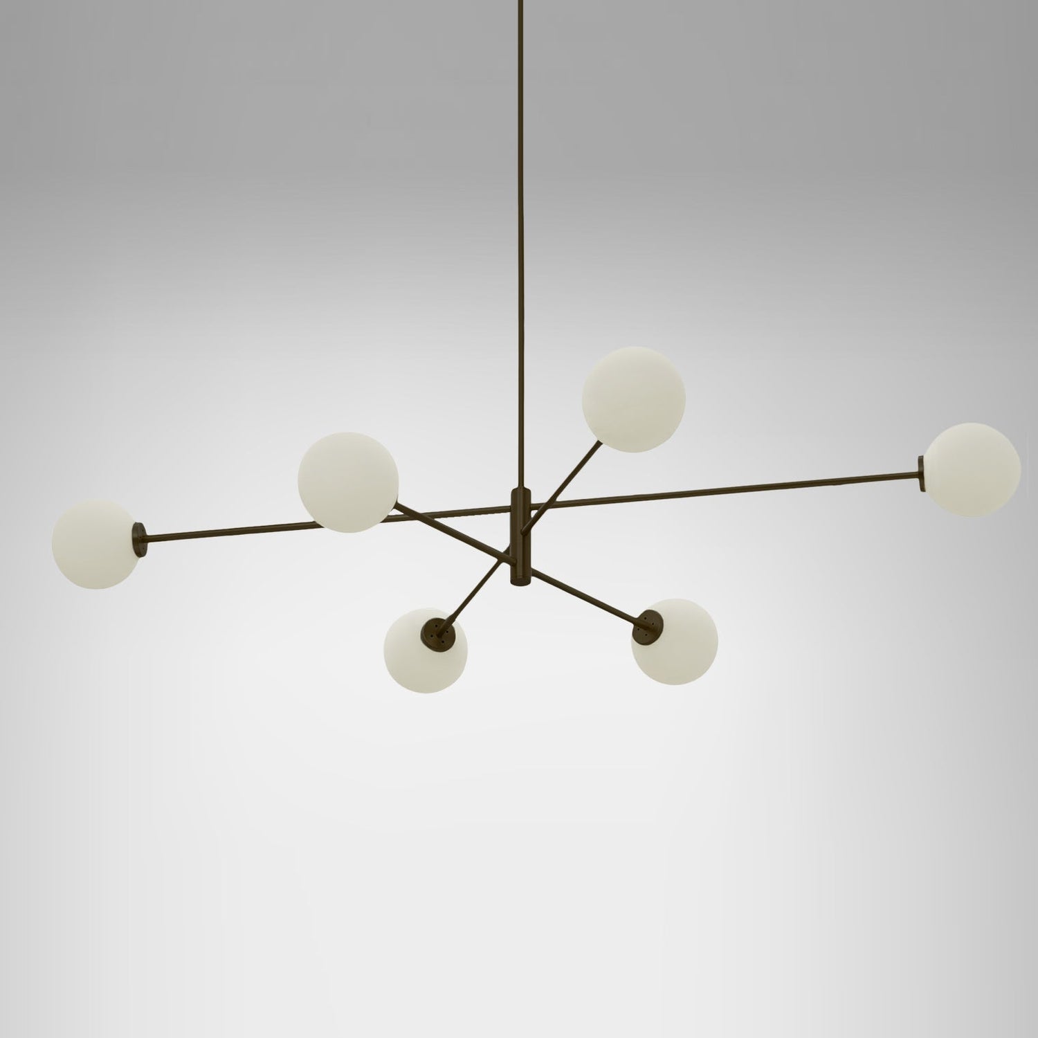 Inspired by the famous fountain at the Piazza di Trevi, the junction of 3 roads which marks the terminal point of an aqueduct. The arms of the Trevi pendant provide a perfectly balanced composition where the lines meet and extend at the precisely formed central pillar. Illuminated with either 3 or 6 glass shades, this contemporary centerpiece has satin brass or bronze finishes with matte opal glass shades.