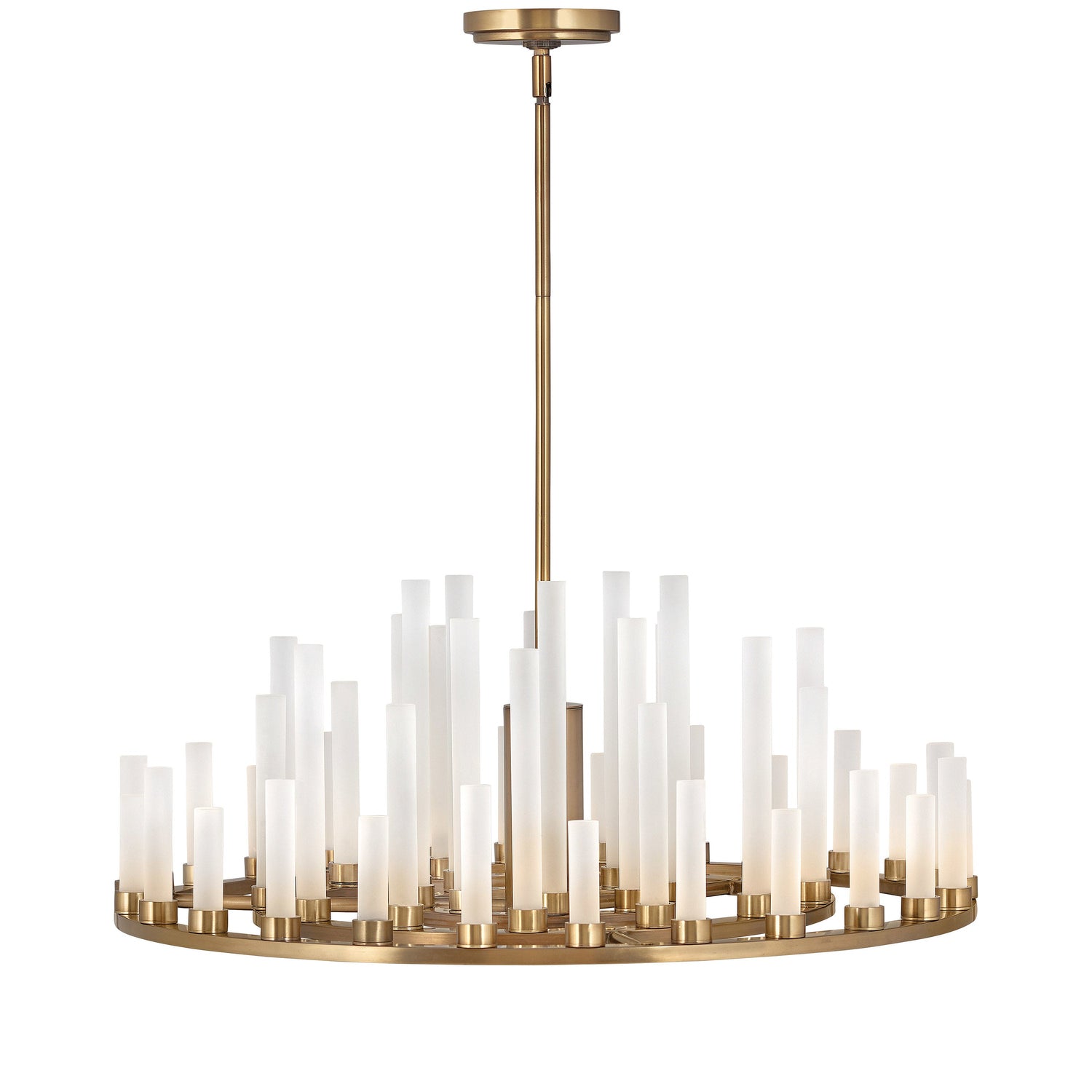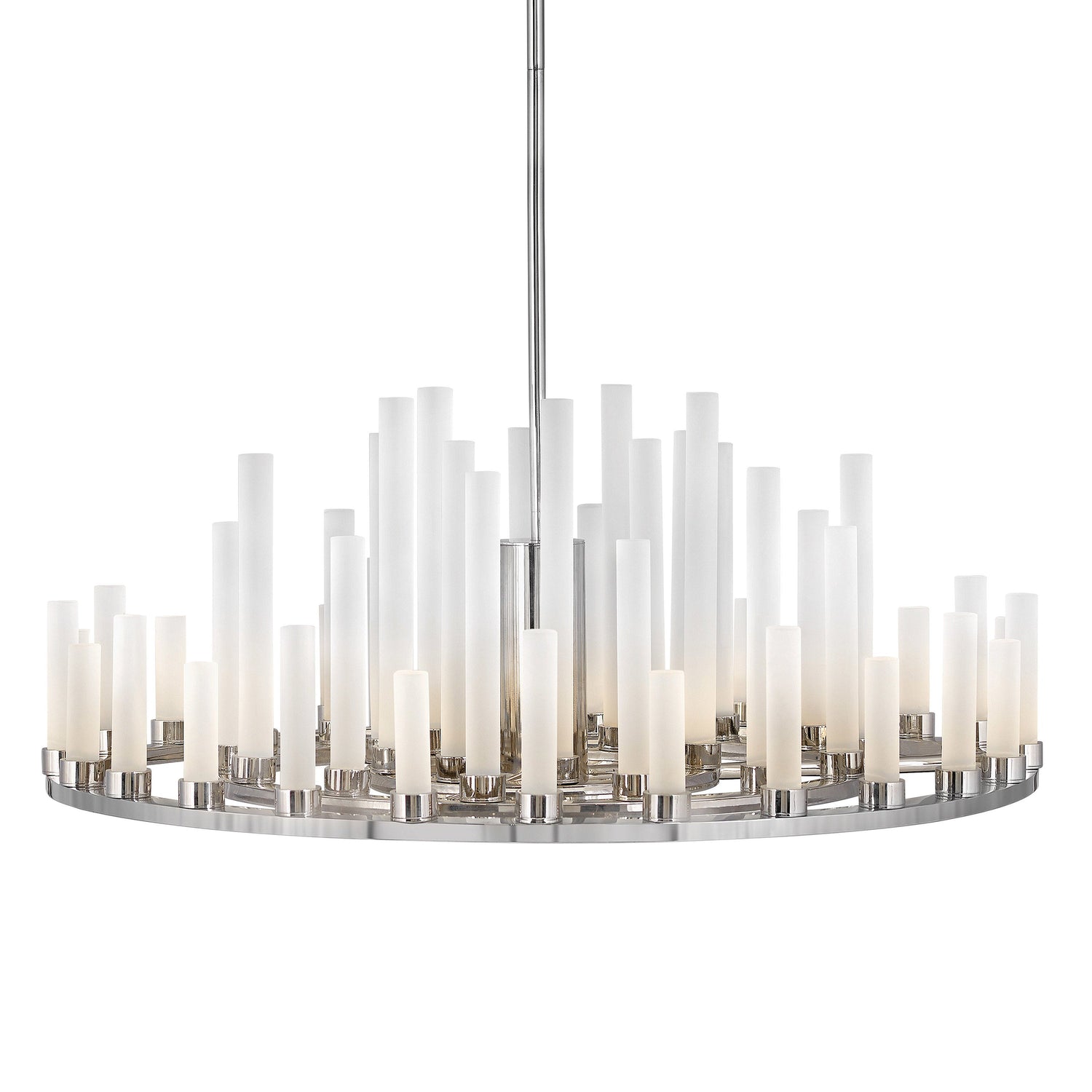 This stunning silhouette suggests rows of candles burning at different rates as in days of old, yet Trinity is modern in every aspect. Each frosted glass column is evenly lit with integrated LED, producing multiple points of light in undulating fashion along the Polished Nickel or Heritage Brass frame. The effect is breathtaking, unexpected and completely spectacular.
