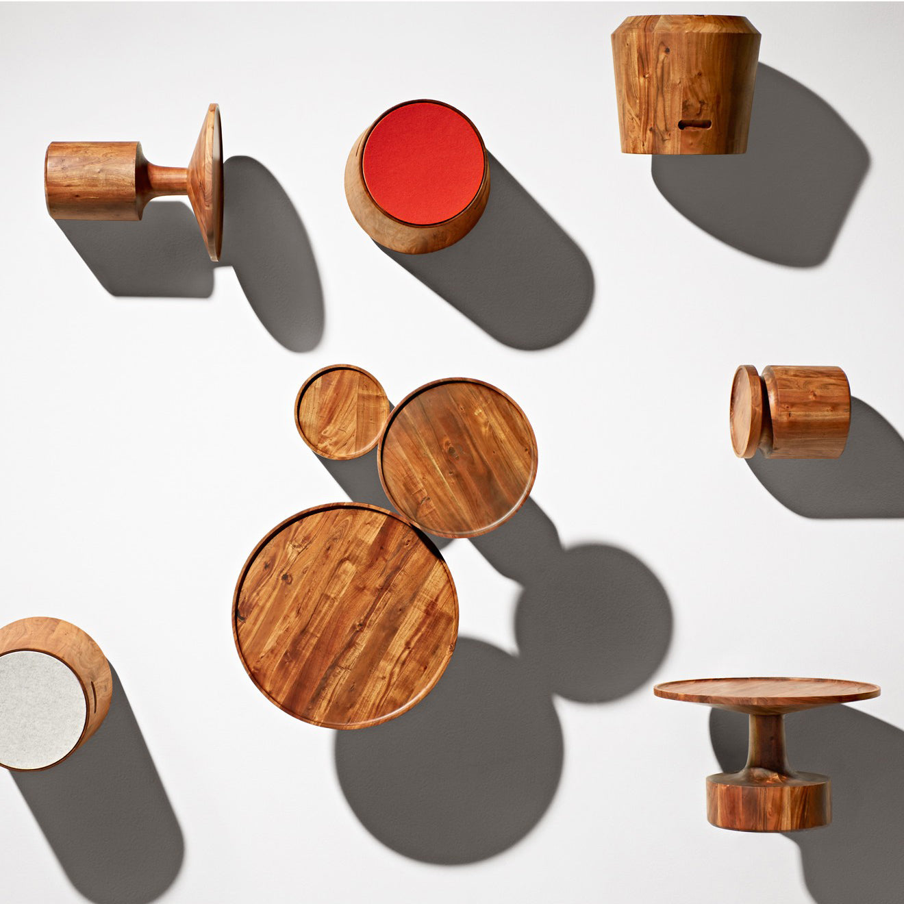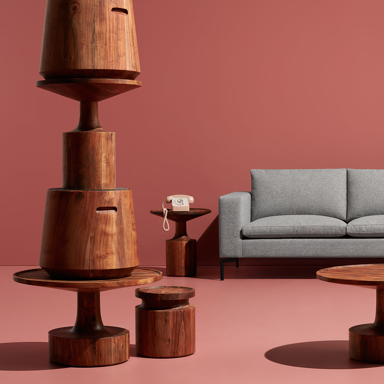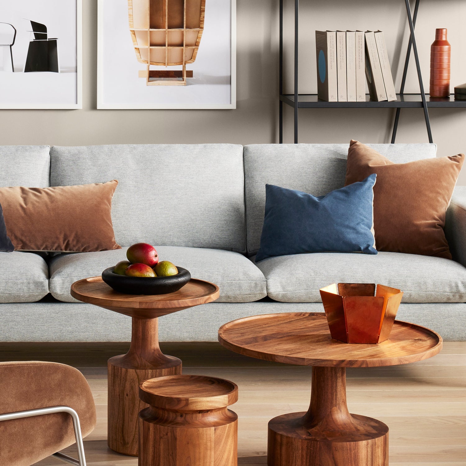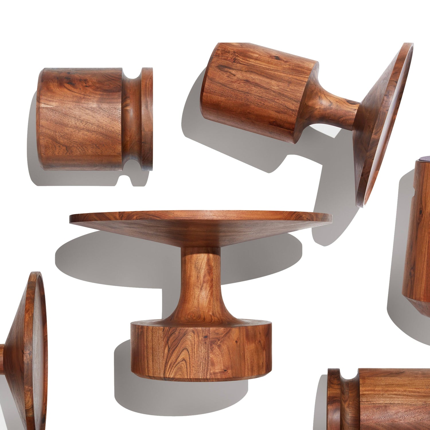 The Blu Dot Turn Coffee Table is a striking modern table made of solid acacia wood. Visually distinctive and versatile, this round coffee table's rustic finish makes an attractive counterpoint to angular modern furniture, providing the ideal surface for cocktails, magazines, flowers and laptops. Note that because solid acacia reacts to temperature and humidity, this Blu Dot table may swell and crack in tandem with environmental conditions.