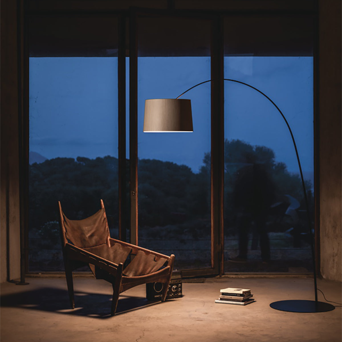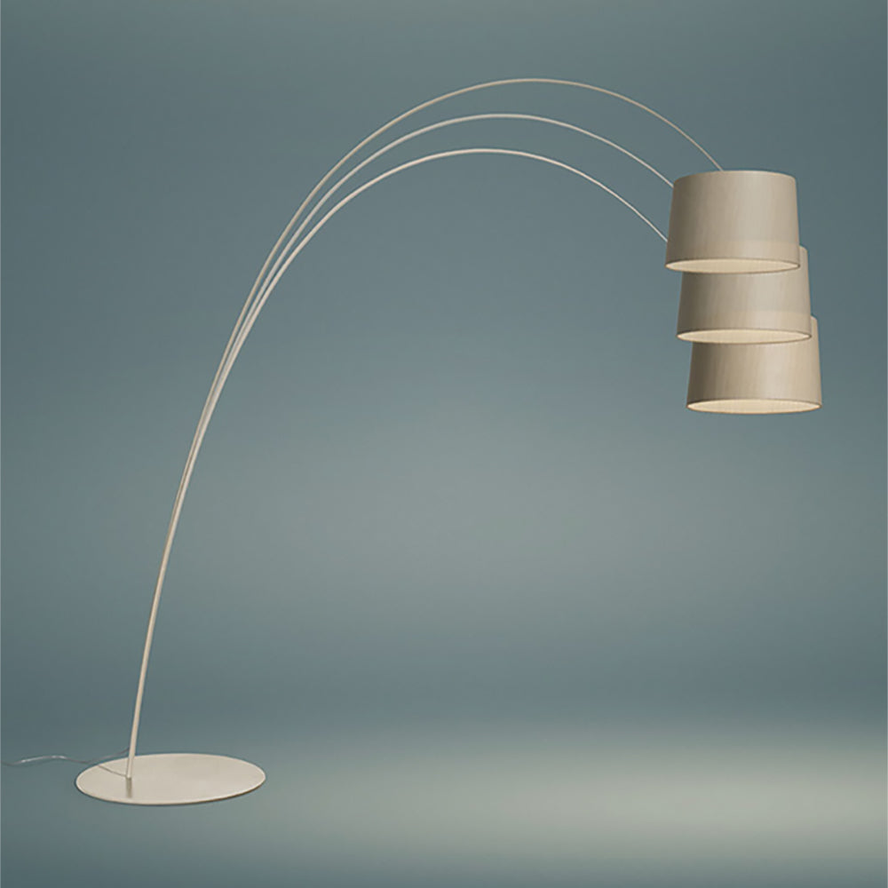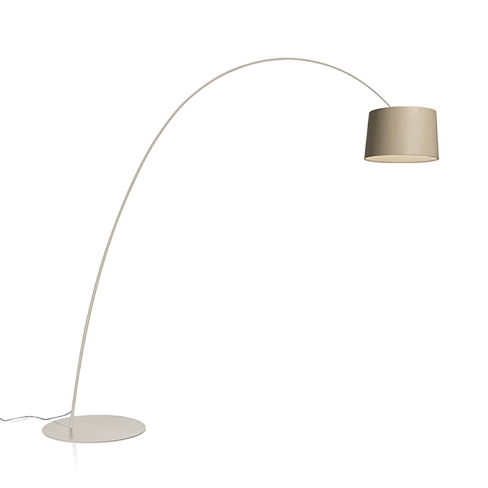 Floor lamp with direct and indirect light. Diffuser and rod made of fibreglass-based composite material and liquid coated. Translucent polycarbonate upper diffuser disc, opaline white PMMA lower diffuser disc with satin finish. Epoxy powder coated metal round base. Supplied with 4 counter-weights to be inserted in the purpose-provided seat above the diffuser to adjust its height. The double-sided LED board was purpose-designed by Foscarini to achieve a superior level of color rendering (CRI) and retaining the same color temperature as a halogen light source (degrees Kelvin). The LED board is installed on an aluminum disc, which is protected at the top by a small PMMA disc. The transparent cable is fitted with a dimmer which can be used both to adjust the level of luminous intensity gradually or as the ON/OFF switch.
