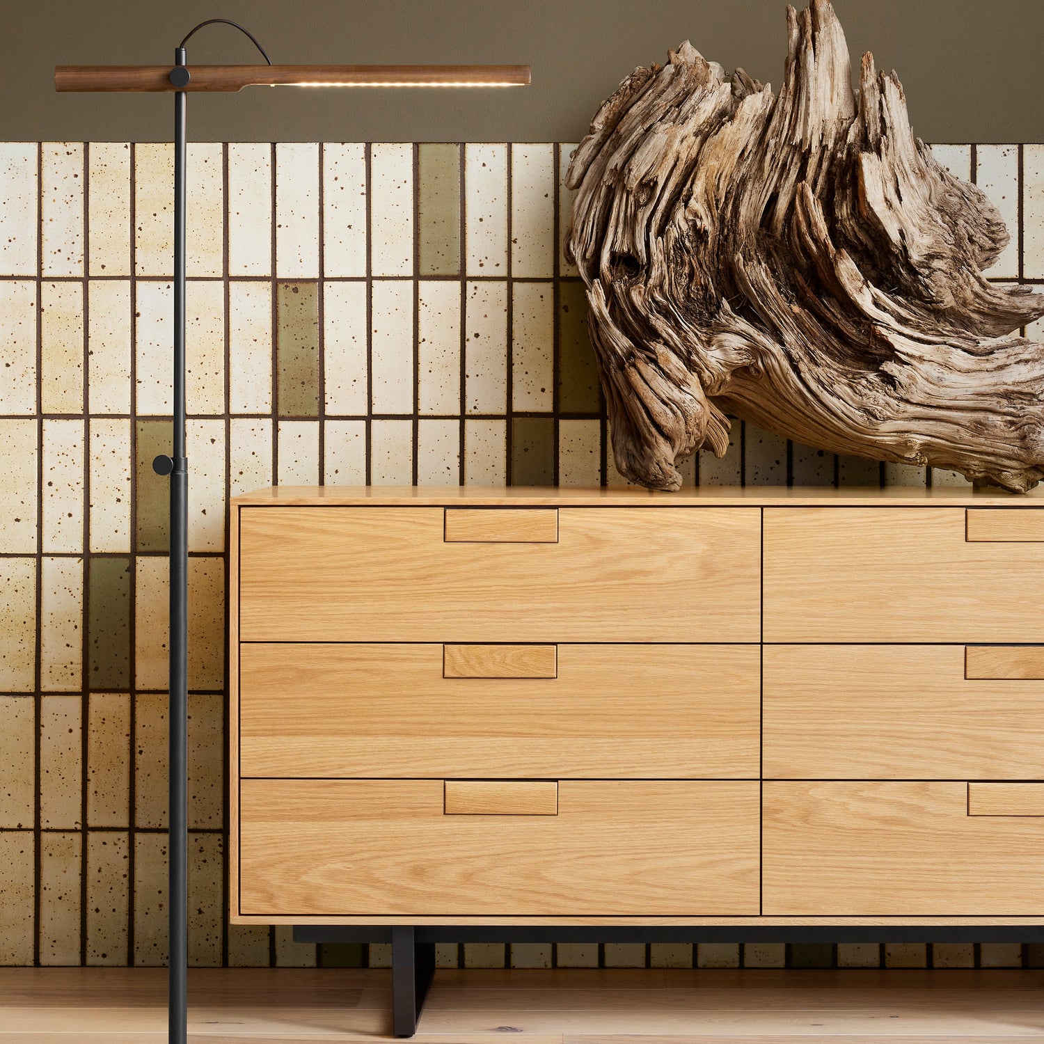 - Solid walnut or white oak arm with integrated LED lighting