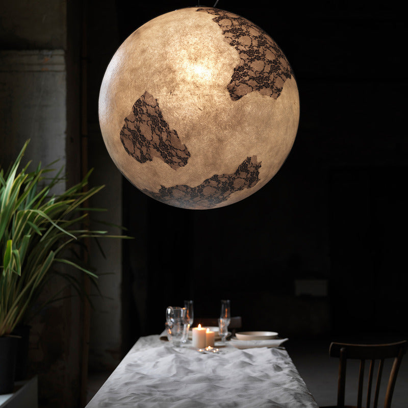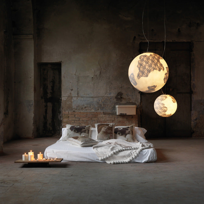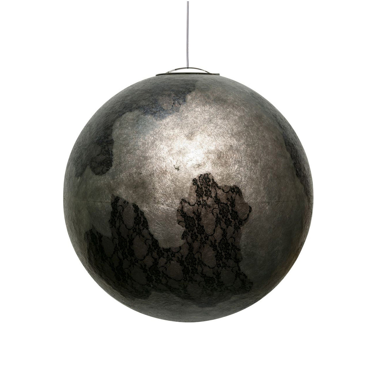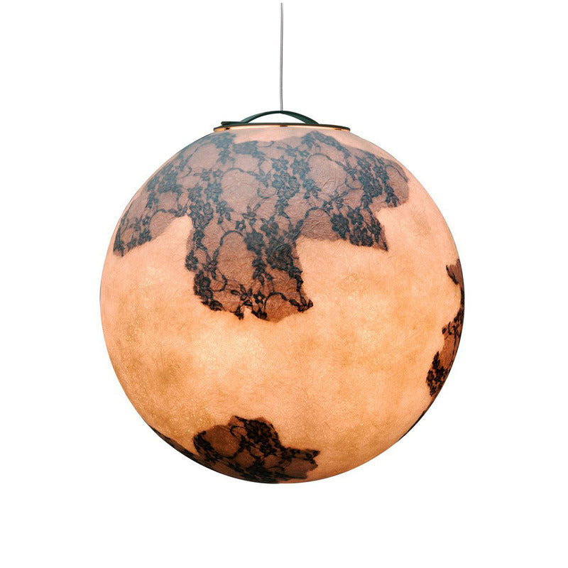 Might we say you'll be over the moon for the Ulula large Pendant Light designed by Matteo Ugolini? The fiberglass globe is embedded with lace for a continental serving of textural beauty. These planetary personalities are 29.5 in diameter and there are two color combinations with only subtle differences: the one that appears to have a candlelight glow is painted white and the one that appears a purer white is painted gray¡ªthink of them as the moon's illumination to the earth's shadow.