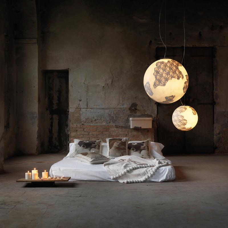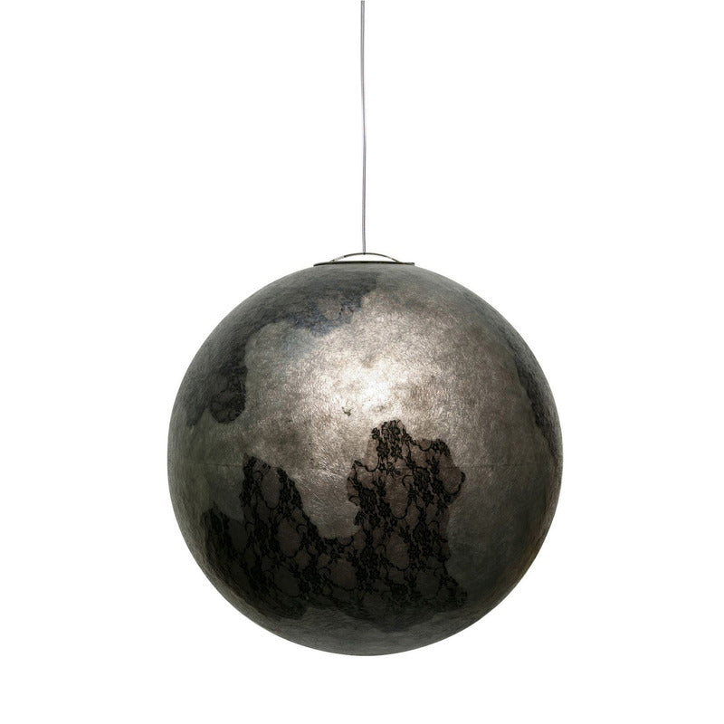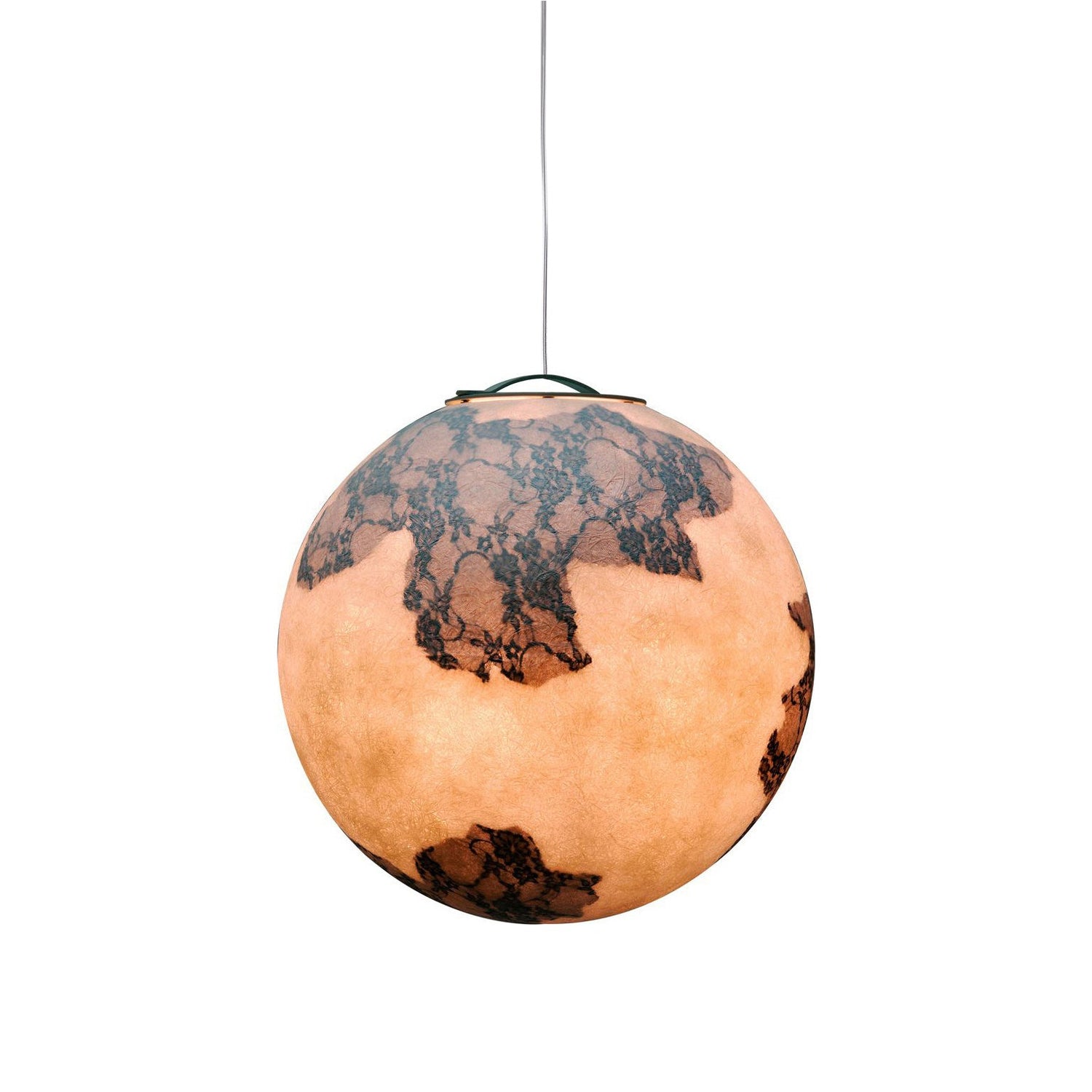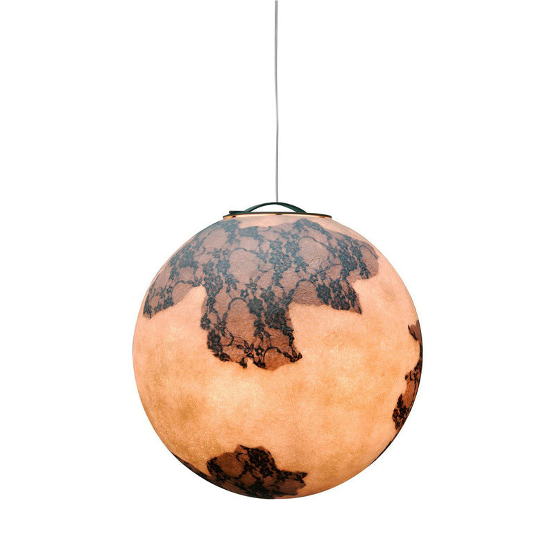 Might we say you'll be over the moon for the Ululi small Pendant Light designed by Matteo Ugolini? The fiberglass globe is embedded with lace for a continental serving of textural beauty. These planetary personalities are 17.75 in diameter and there are two color combinations with only subtle differences: the one that appears to have a candlelight glow is painted white and the one that appears a purer white is painted gray¡ªthink of them as the moon's illumination to the earth's shadow.