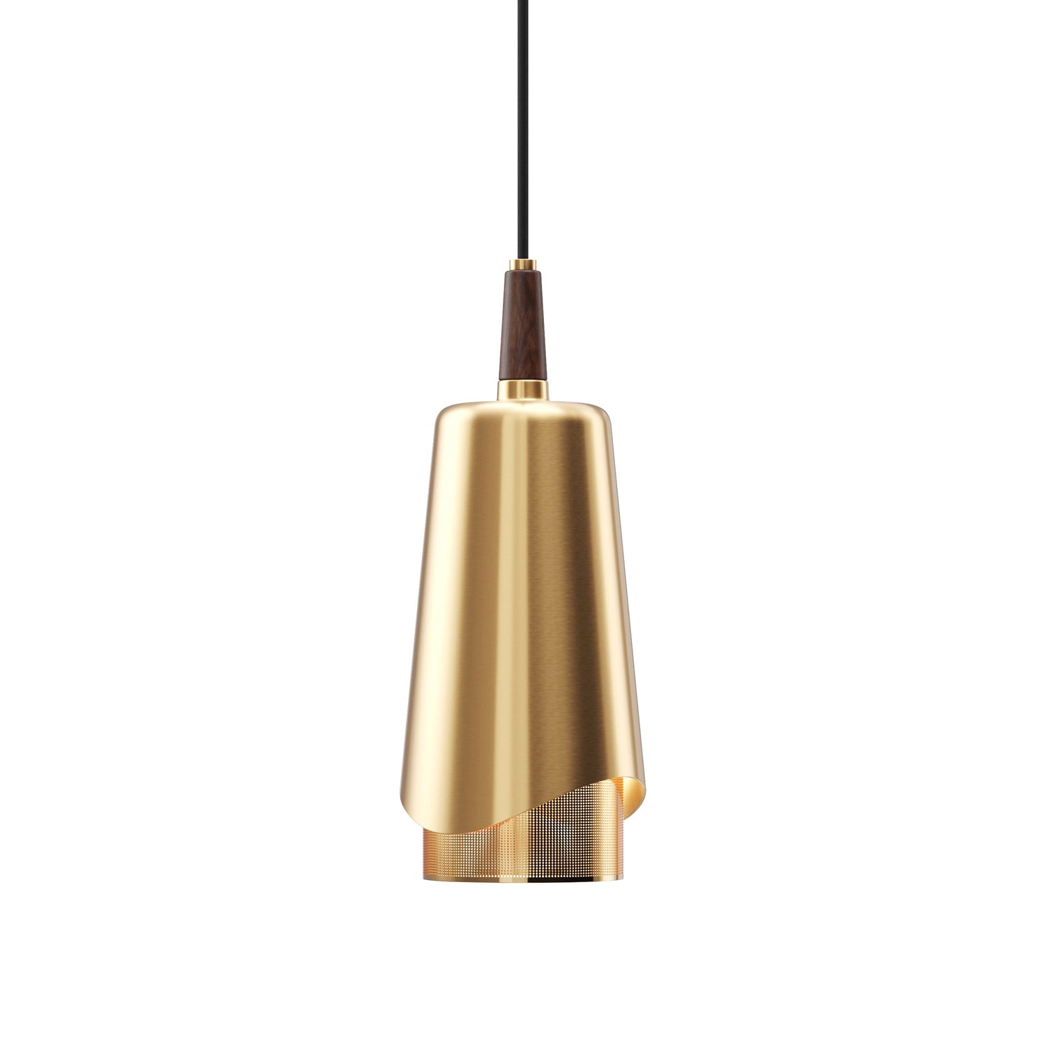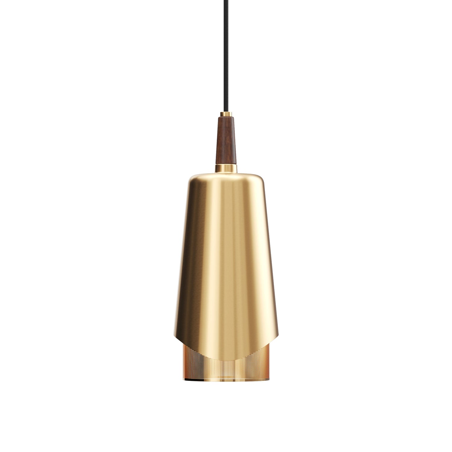 Designed by Arthur Umanoff, this eponymous pendant light shines a light on the contrasts created when perfectly symmetrical, geometric brass and walnut wood components meet. The suspended design emits downward light to illuminate surfaces with its soft and cozy glow.
