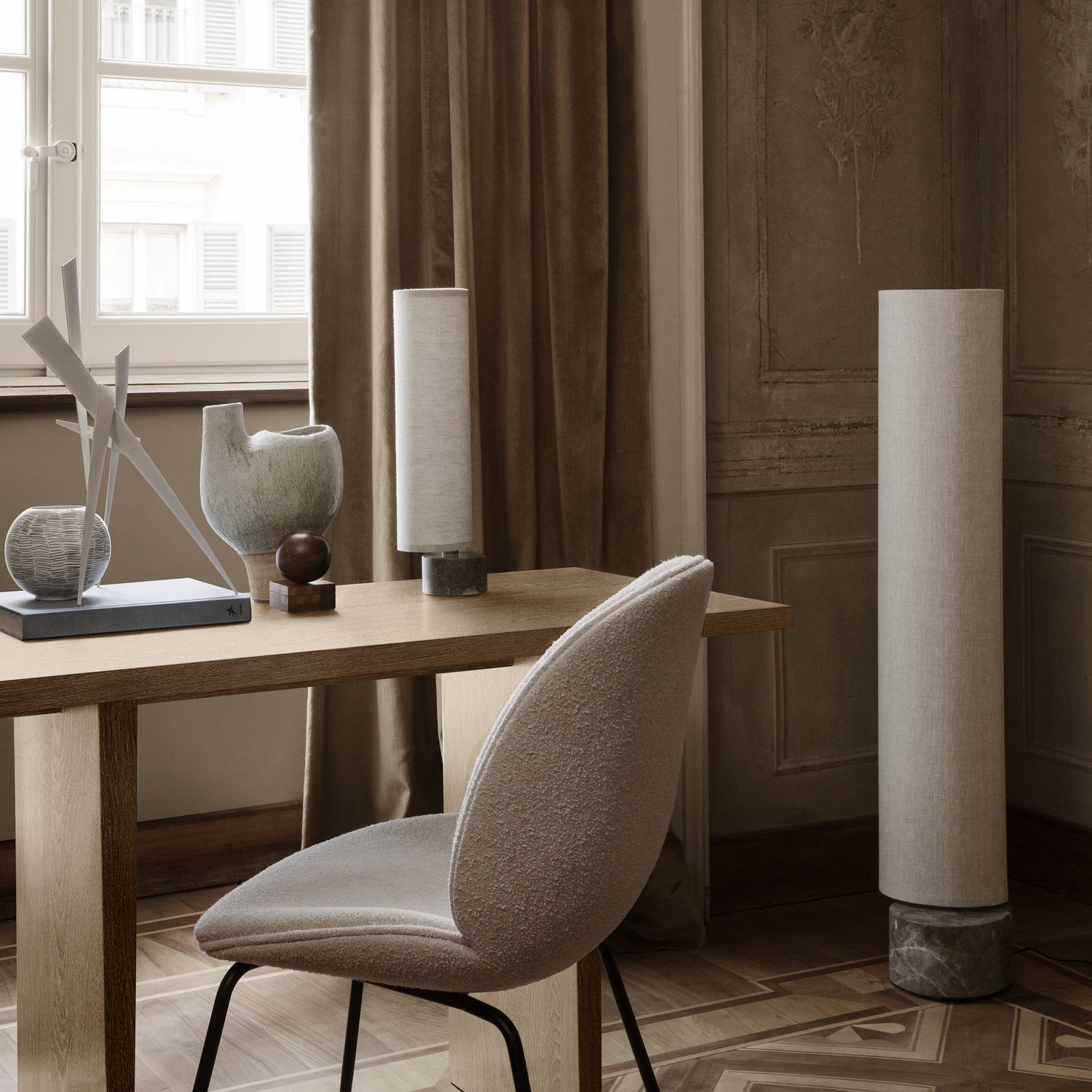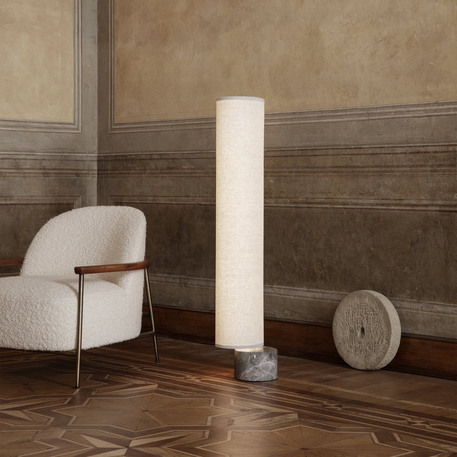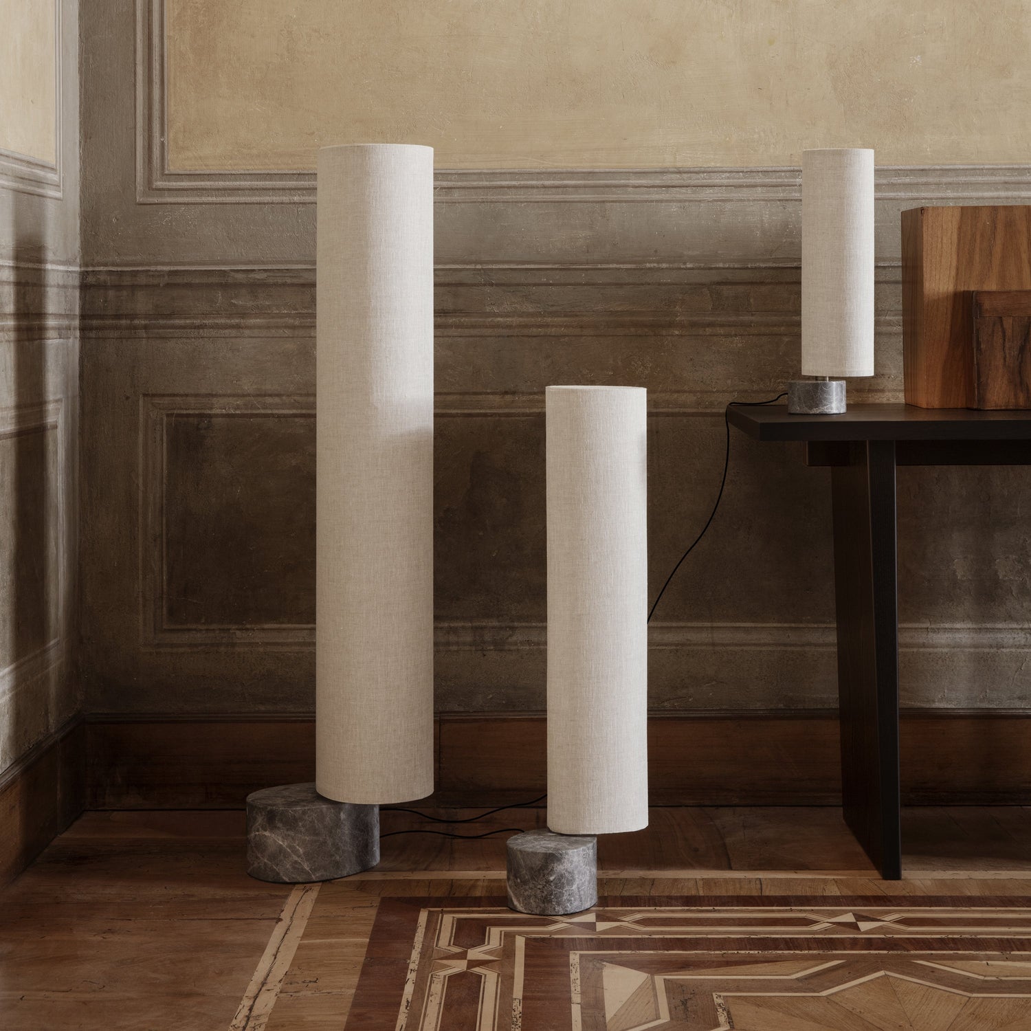 Playful, poetic and pared back, Space Copenhagen's design team have reimagined the traditional lantern with the calming and characterful Unbound Floor Lamp. With the teardrop-shaped marble base acting as an anchor, the white linen or natural canvas shade can be effortlessly rotated around it, as though it were a sail, gently billowing. Its dark antique brass 'mast' supports an array of dimmable LED lights within the shade that create a soft, diffuse and evenly distributed light. The largest of the Unbound Floor Lamps, it can be used to create a bold, standalone statement, or it can be paired with the medium and small versions to create a sculptural cluster. Changing the angles of the 'sails' to each other makes a calming, floating and dynamic sculpture, even when switched off. This balance of character and sophistication make the Unbound Floor Lamps destined to grace both the private home and grand projects alike.