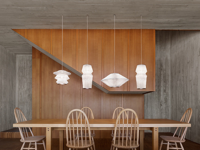 Ura is handcrafted through delicate folds that originate recognizable shapes from nature. They can be combined freely, and together they create a harmonious game of volumes that shrink and expand, while individually they convey a subtle lightness. The collection is made of painted stainless steel mesh.