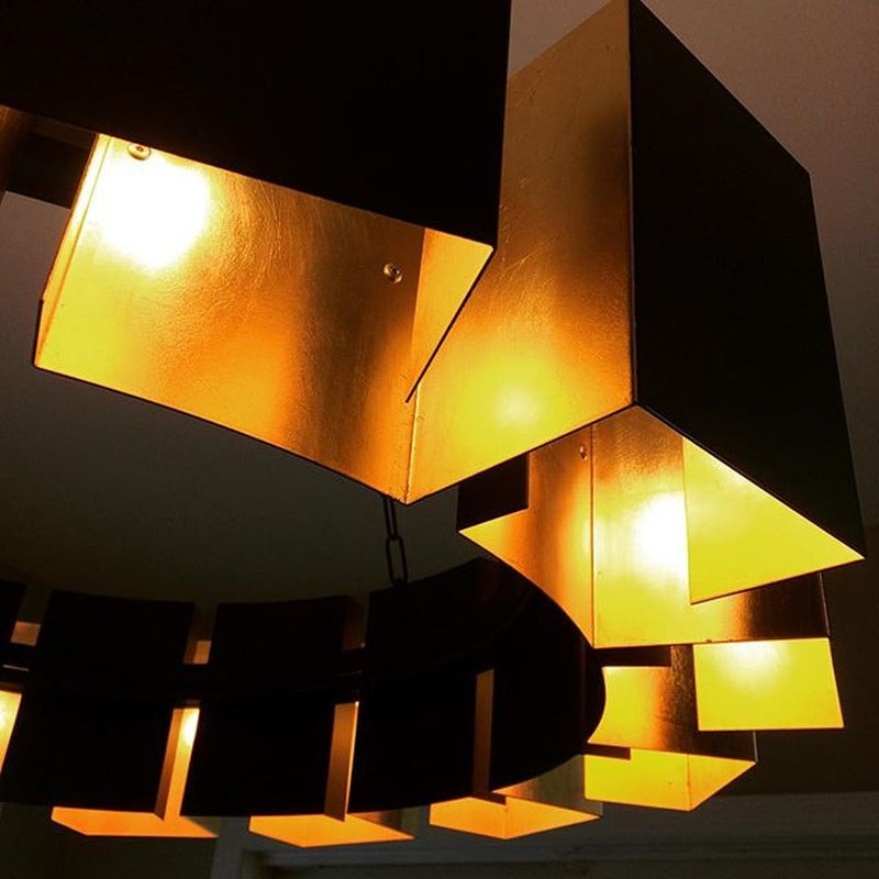 Ring shaped 14-light iron pendant light creates a glowing luminaire effect with each light in open bronze finished box. Approved for use in covered outdoor areas.