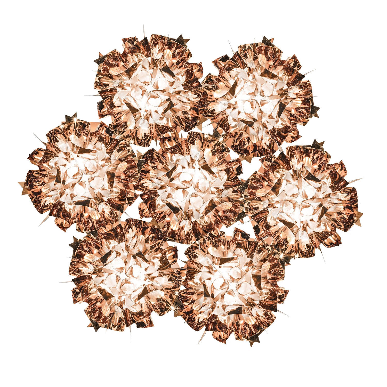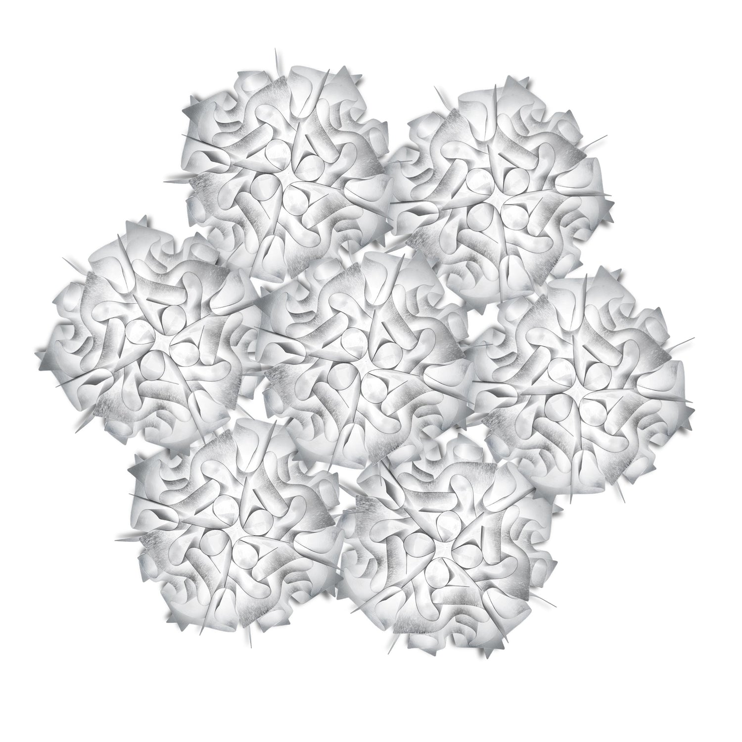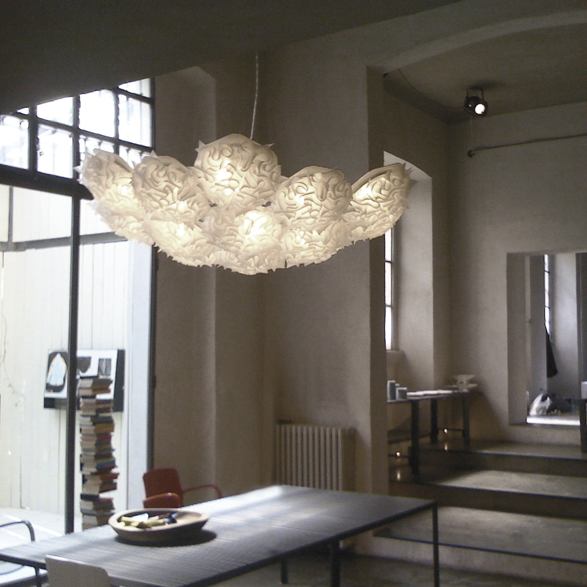Like a tailor-made dress, this piece is assembled entirely by hand. When installed it gently 'clothes' and 'amplifies' the light. The magnetic base and its range of colors and sizes makes it extremely versatile. Produced in luminous Opalflex, Metalized version (Gold, Silver, Copper) or in the Prisma version made from the magical Lentiflex.