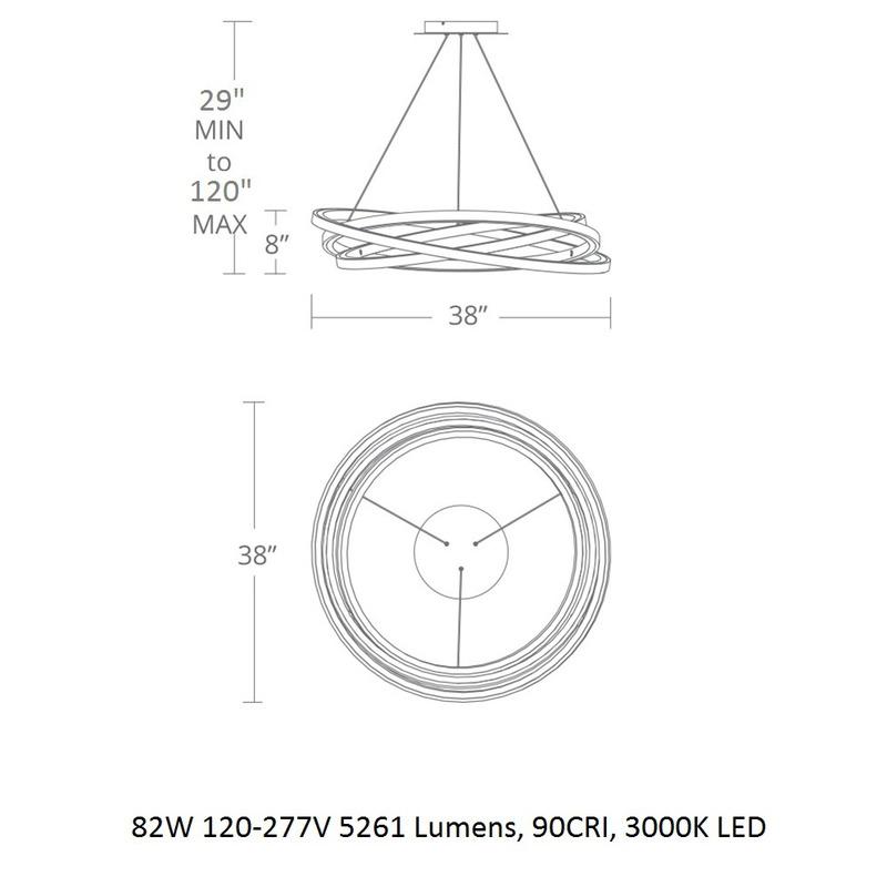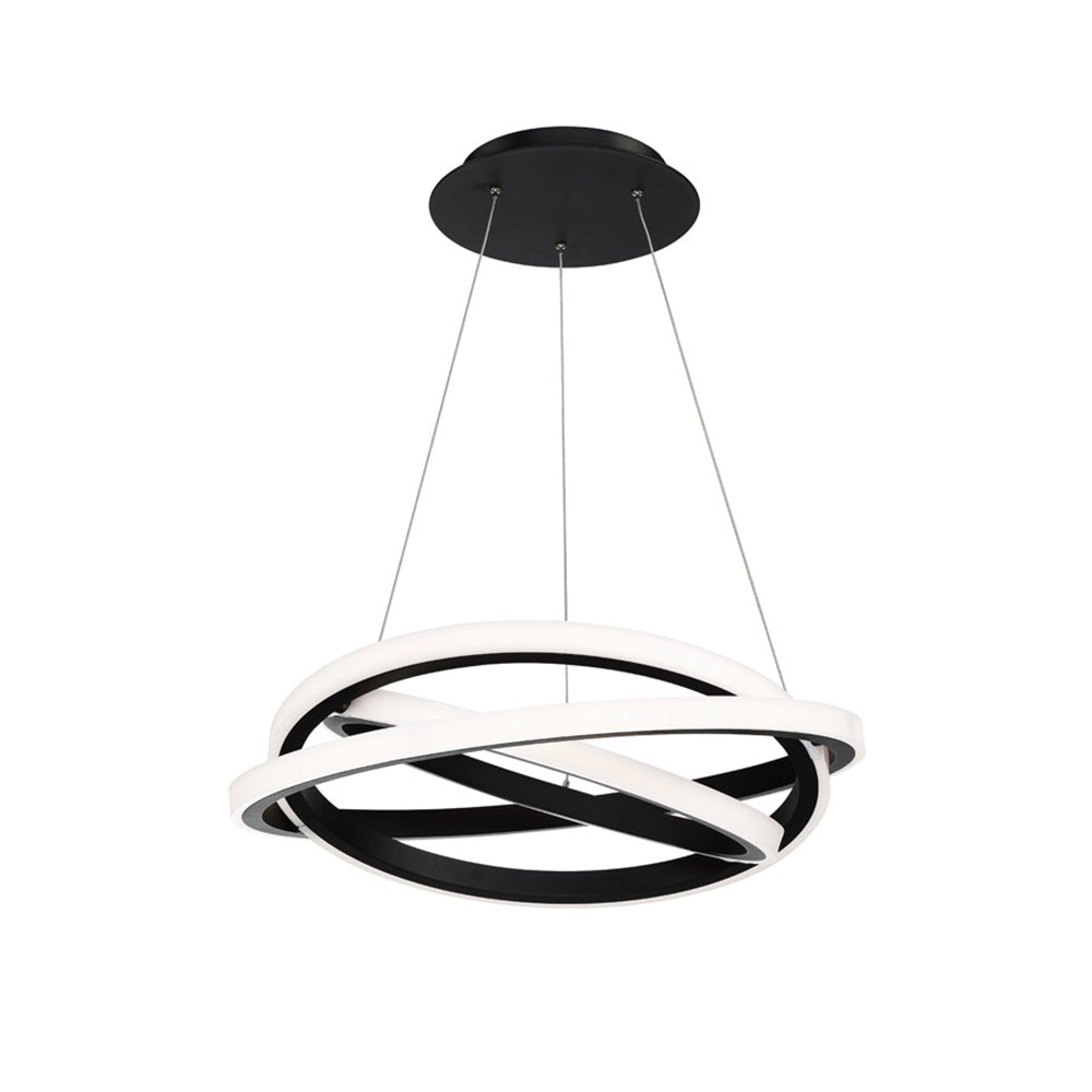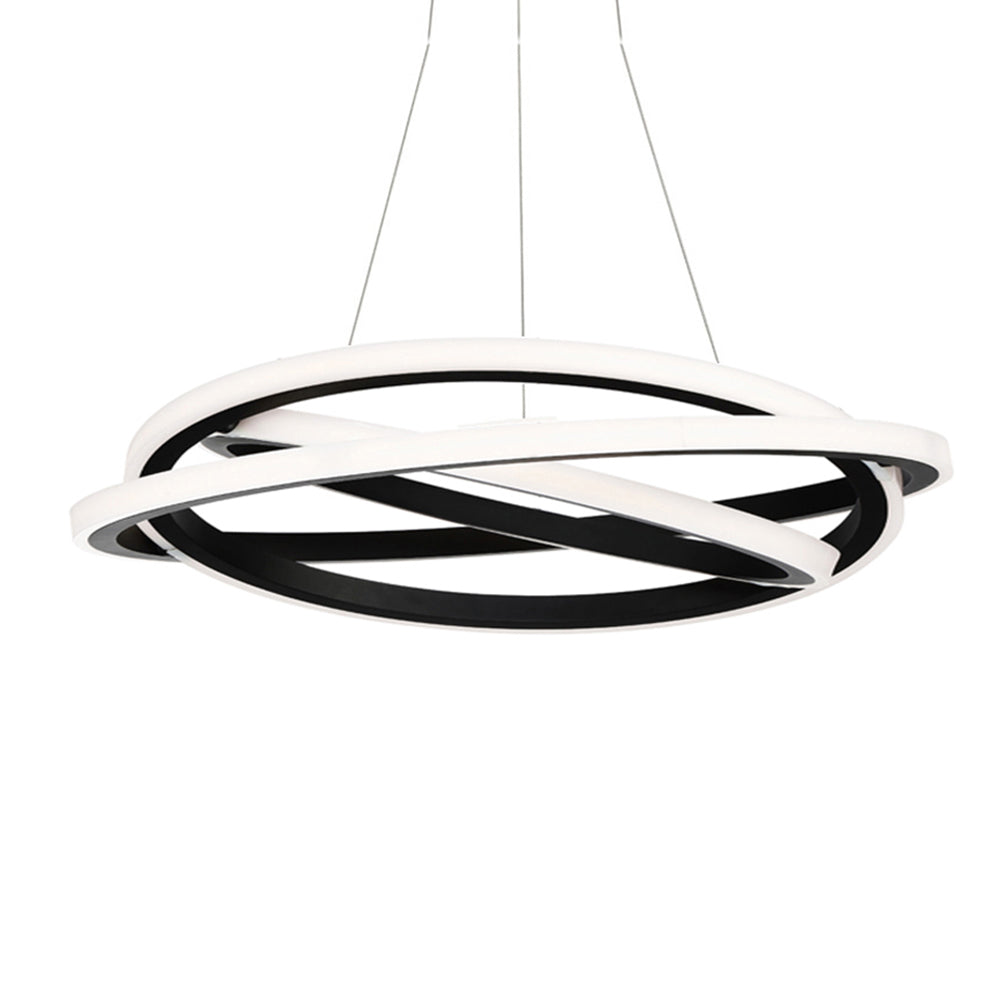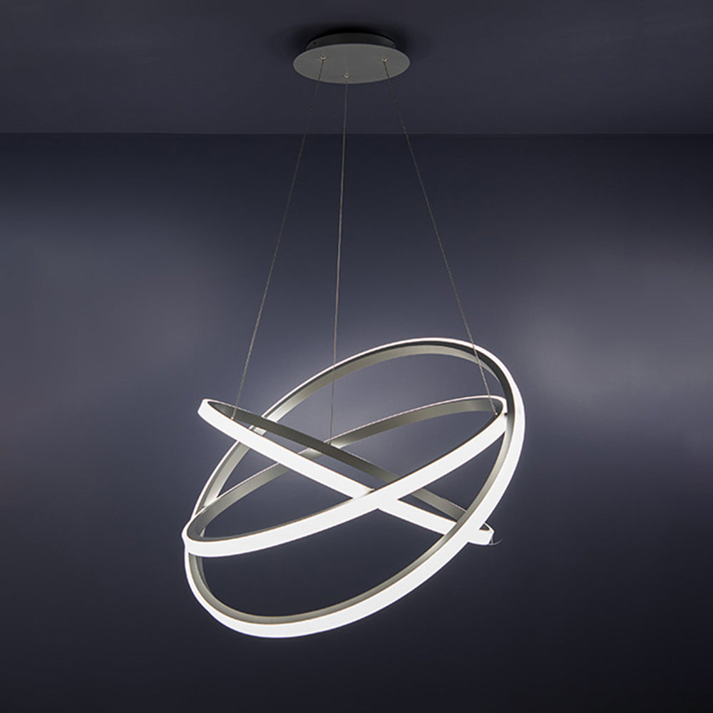 Interlocked bands of metal loop around and around on this simple yet oblique design, a formal puzzle that inspires awe and envy in your guests. Available in black or sleek titanium, Veloce's rings can be adjusted for a more personalized shape. Thin, coated cables maintain a clean, refined look while also delivering power to the design.