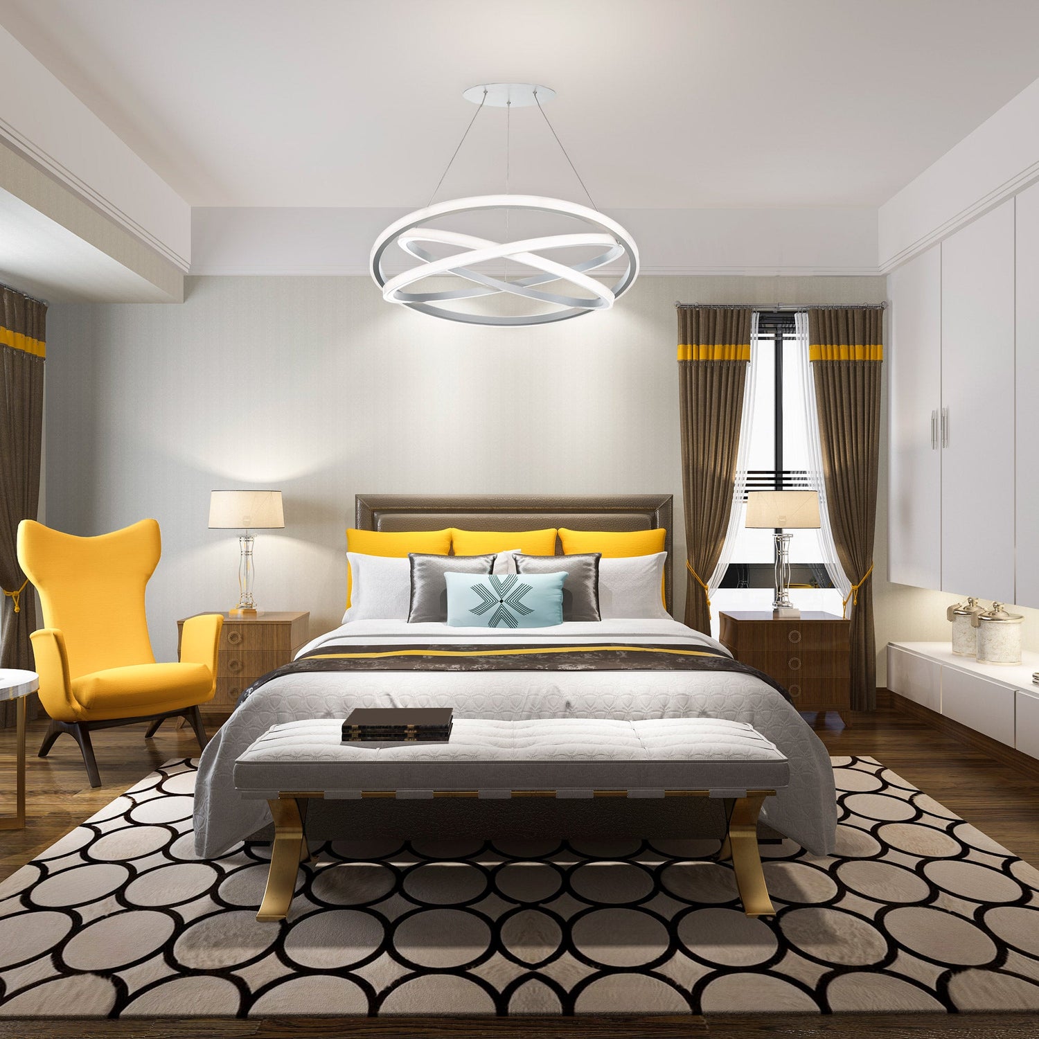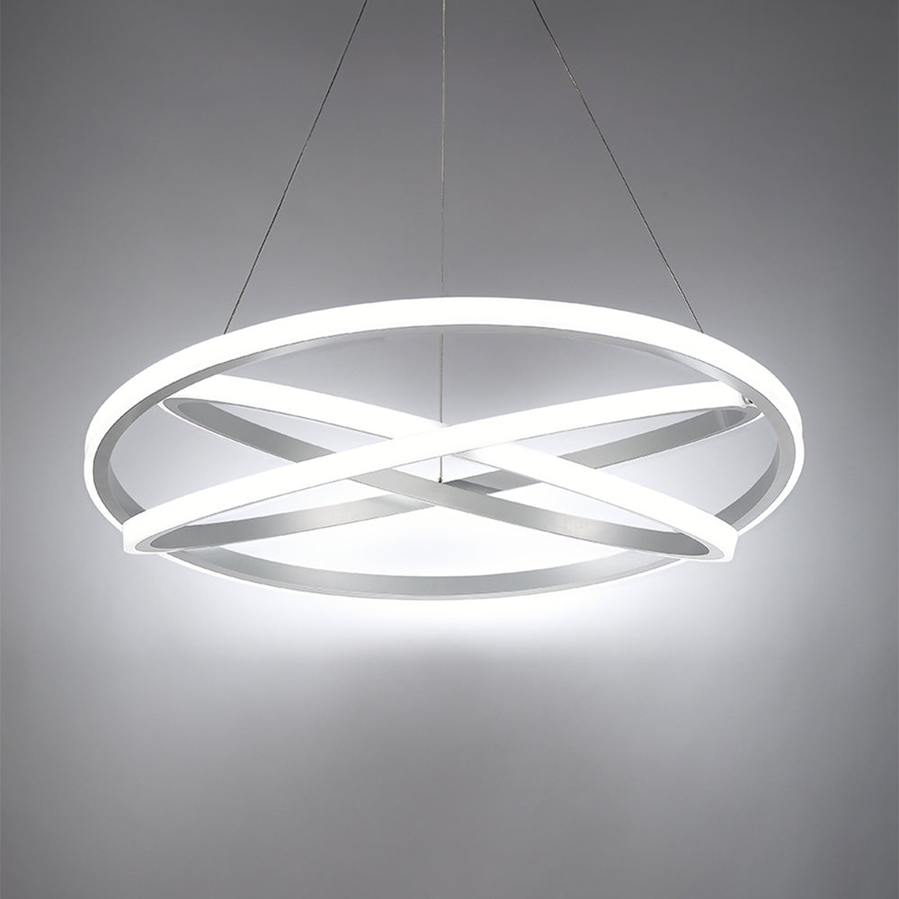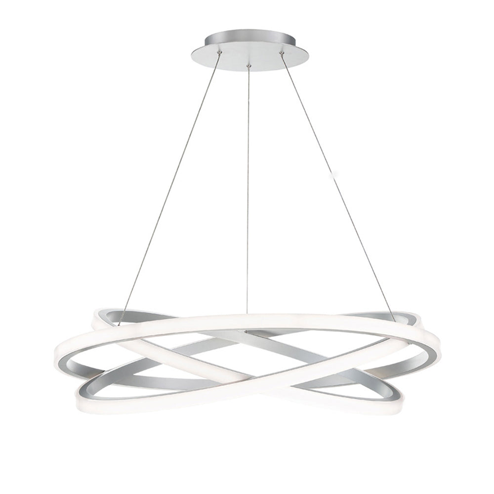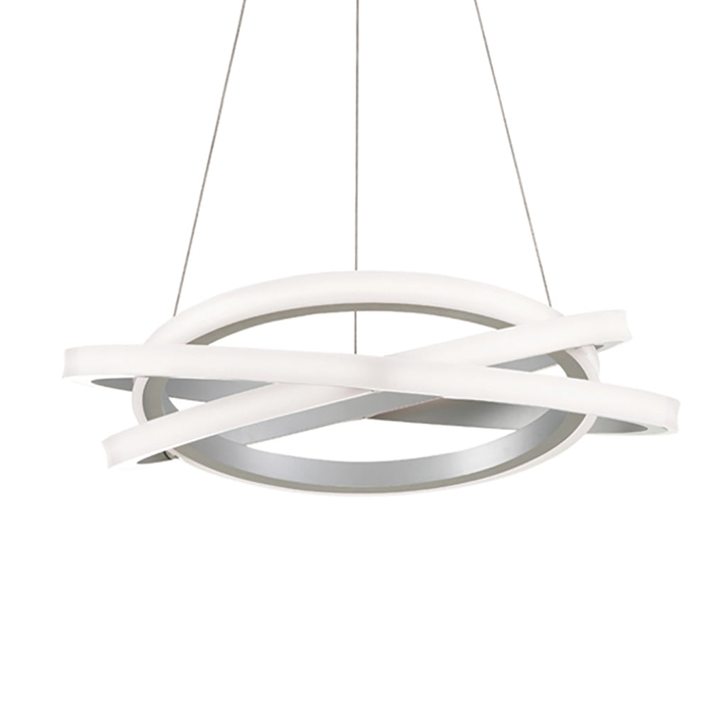 Interlocked bands of metal loop around and around on this simple yet oblique design, a formal puzzle that inspires awe and envy in your guests. Available in black or sleek titanium, Veloce's rings can be adjusted for a more personalized shape. Thin, coated cables maintain a clean, refined look while also delivering power to the design.