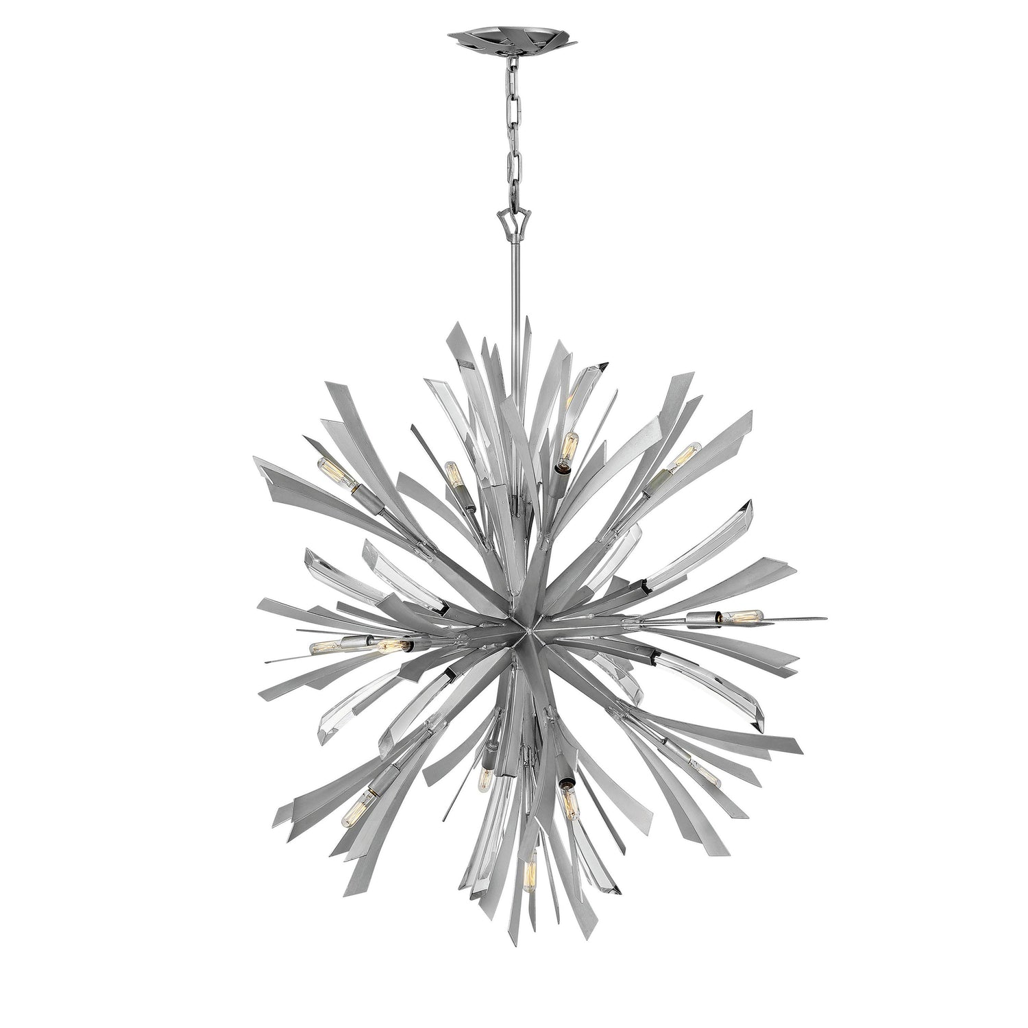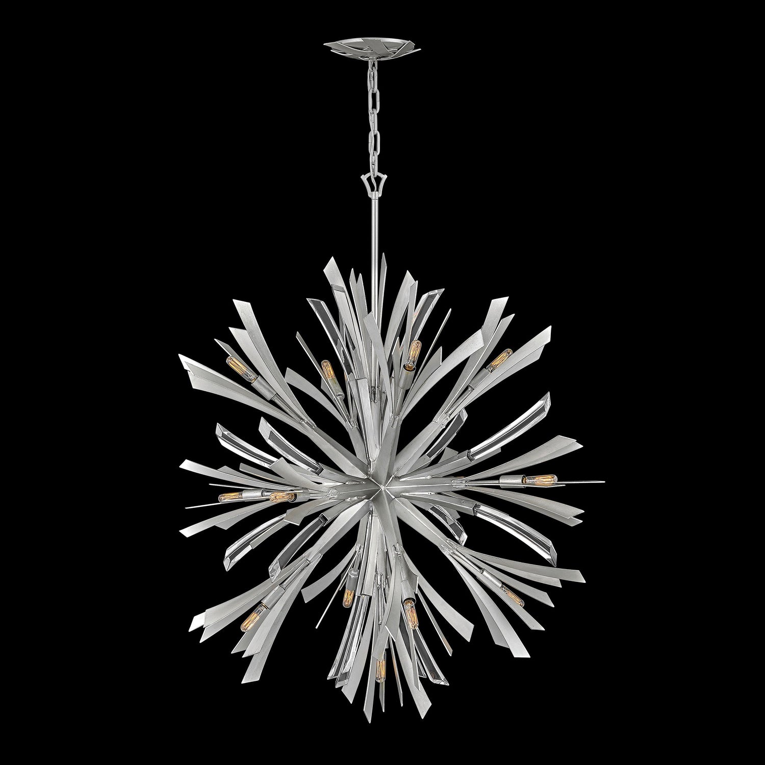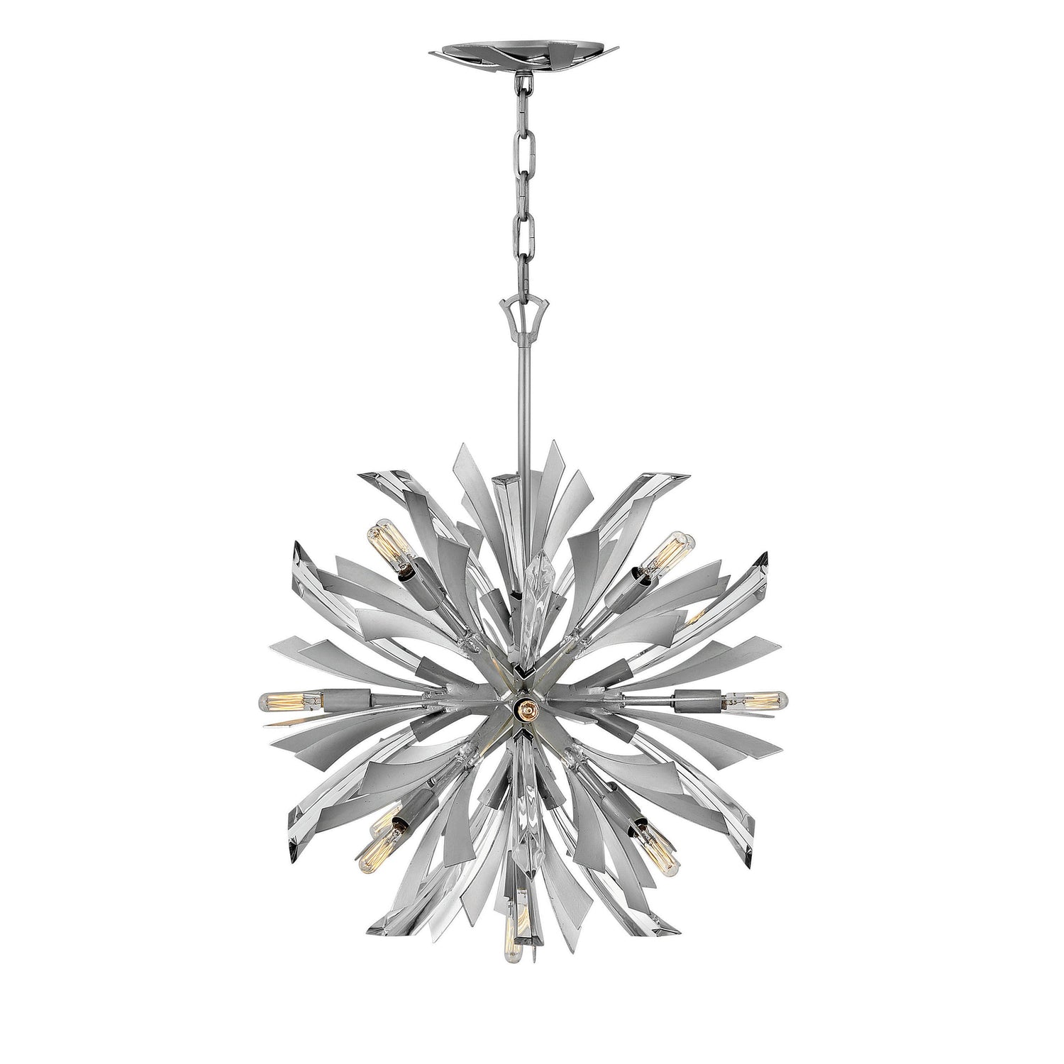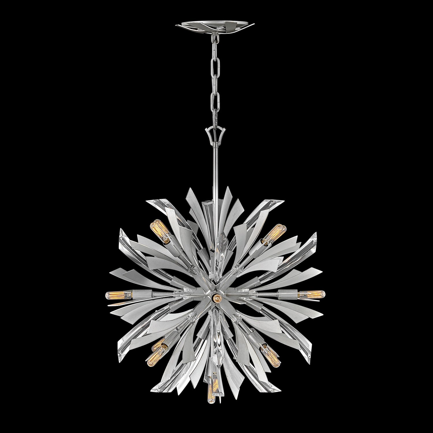 Vida's modern design bursts with a flourishing style that is both highly dramatic and finely sculpted. A statement piece with crystal accents and unique canopy detailing, Vida injects a thrilling dash of contemporary inspiration to its surroundings in a Burnished Gold or Glacial finish.