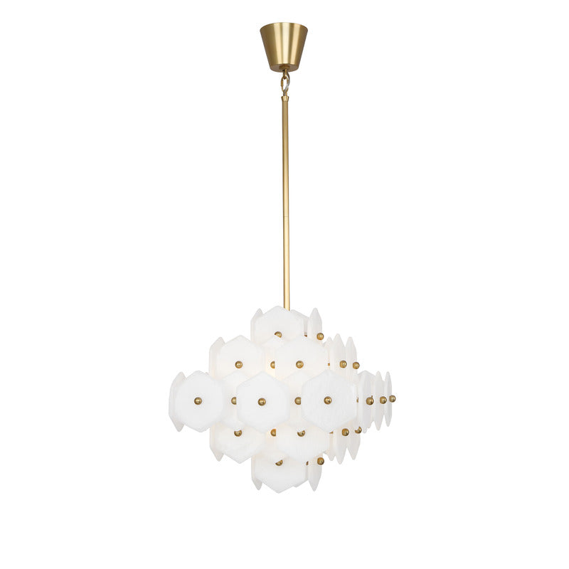 - Available in Individually Hand Blown White Pulegoso glass with Modern Brass finish