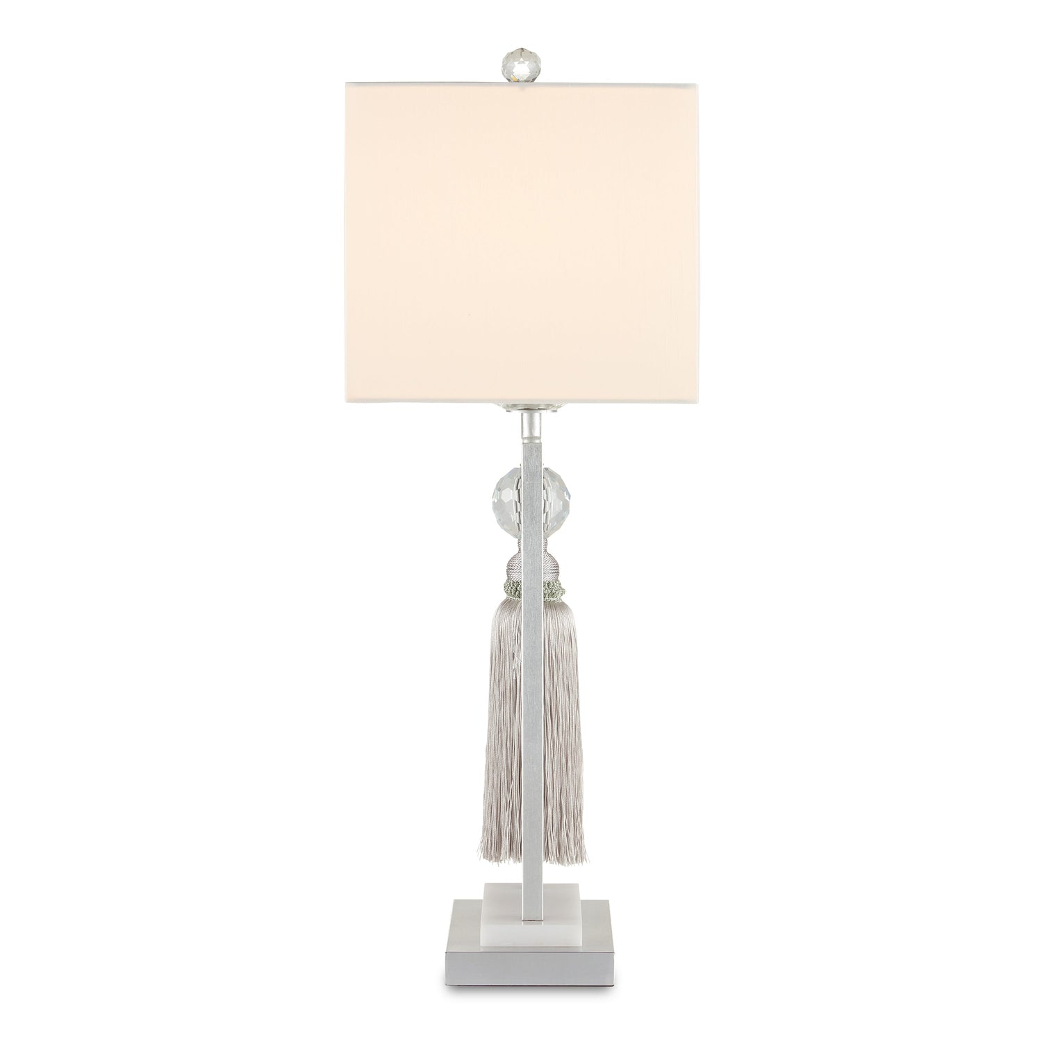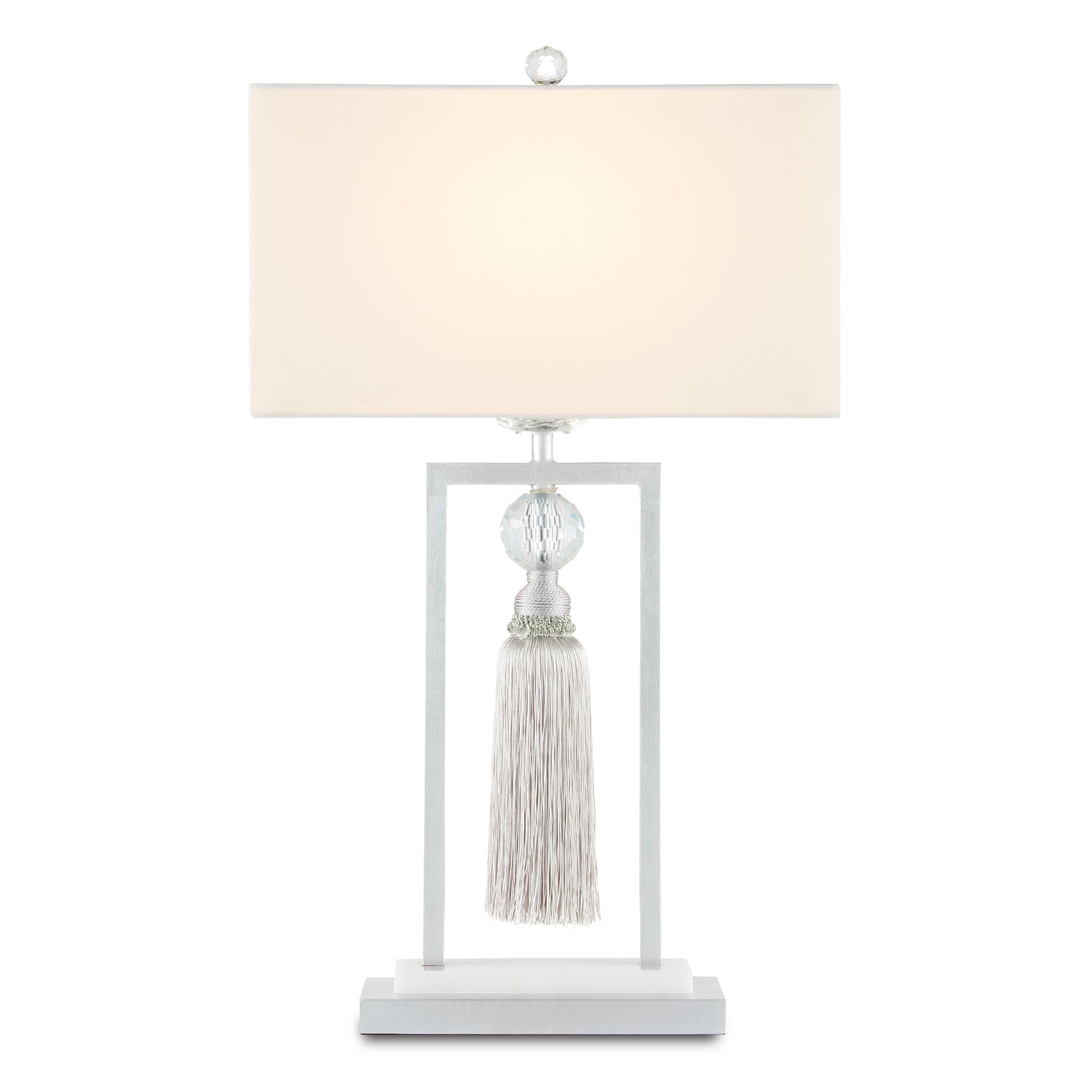 The tassel hanging from the Vitale Table Lamp, which is made of a luxurious thread, is affixed to the lamp by a faceted crystal ball. This adornment brings the magic of a prism to life when the lights are switched on. The silver finish on the metal frame surrounding it and the piece of white marble on the stacked base make this a luminous silver table lamp.