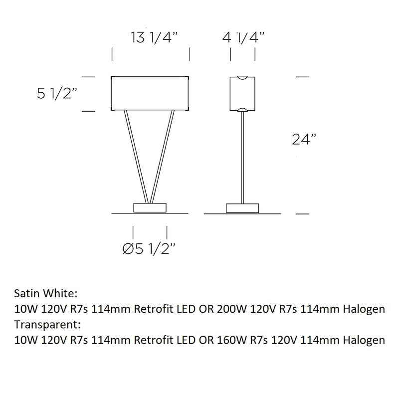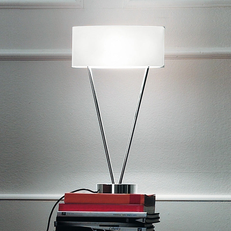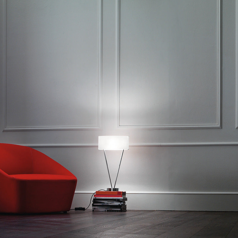 Table lamp providing upward, downward and diffused illumination from its halogen light source. Hand-blown glass diffuser available in satin white.