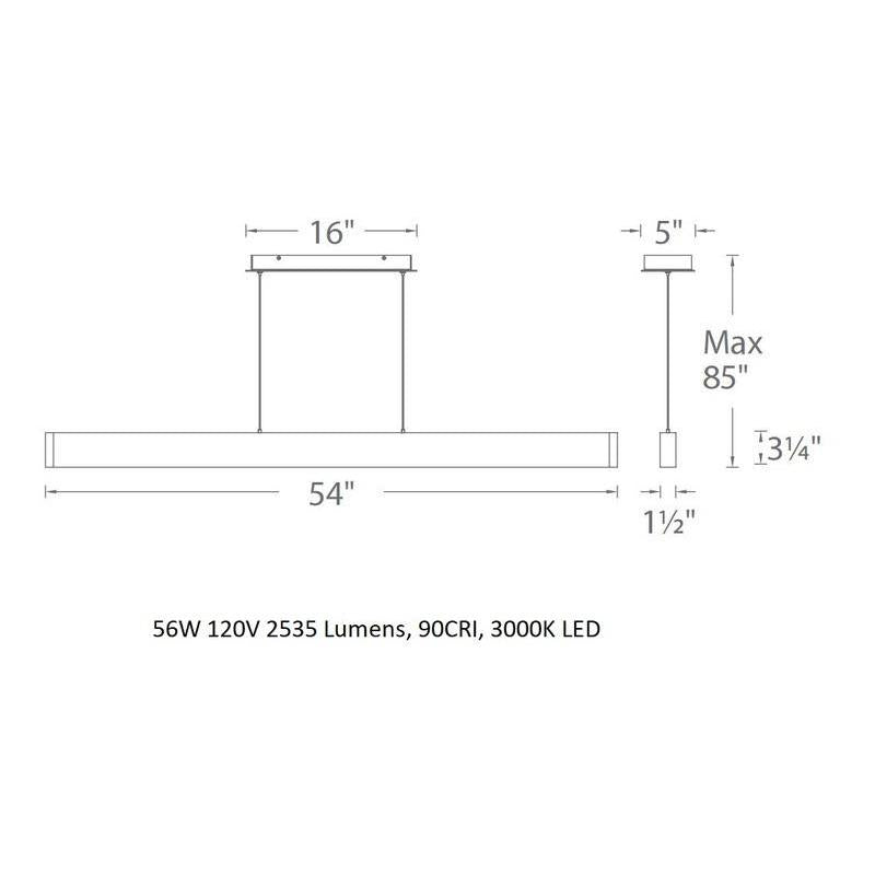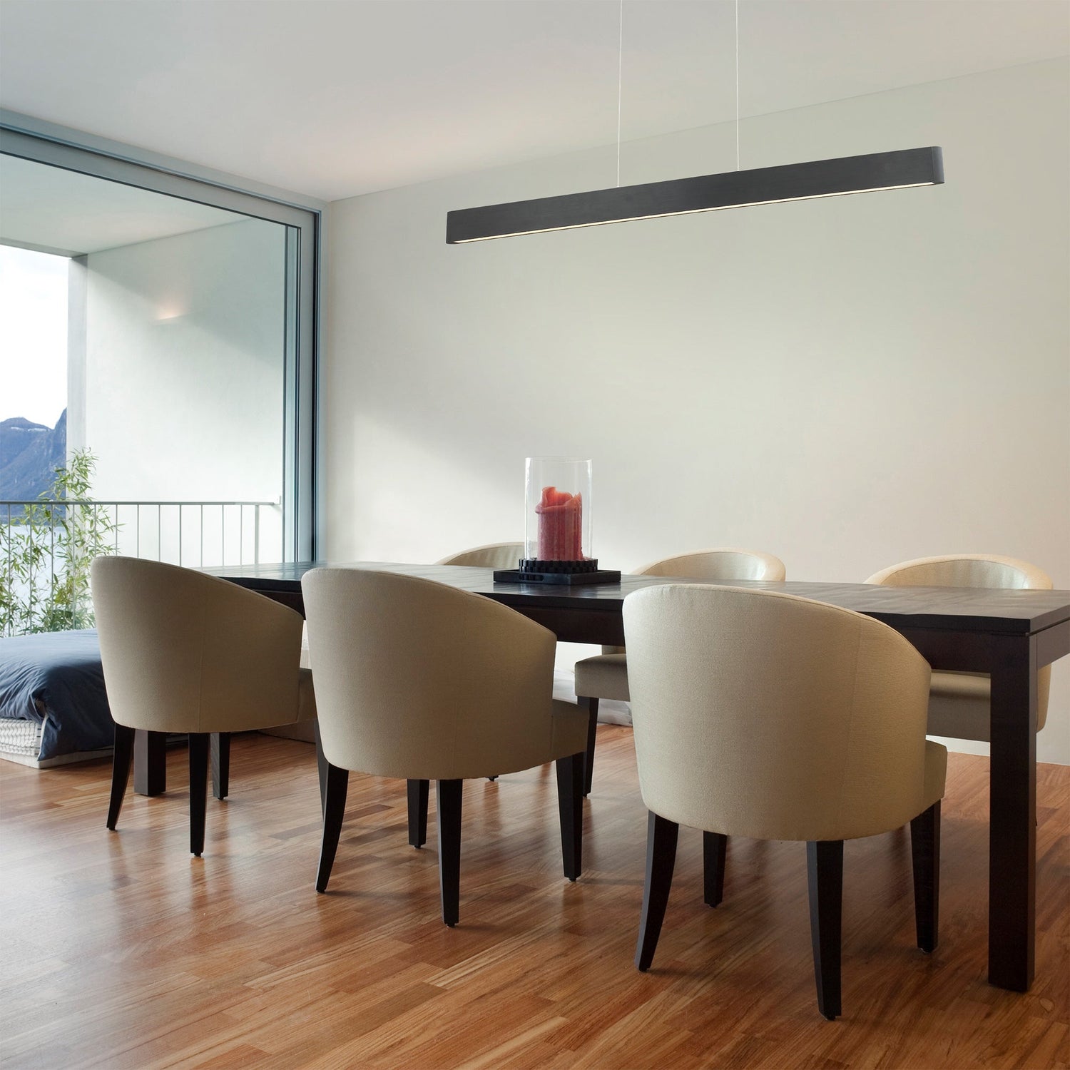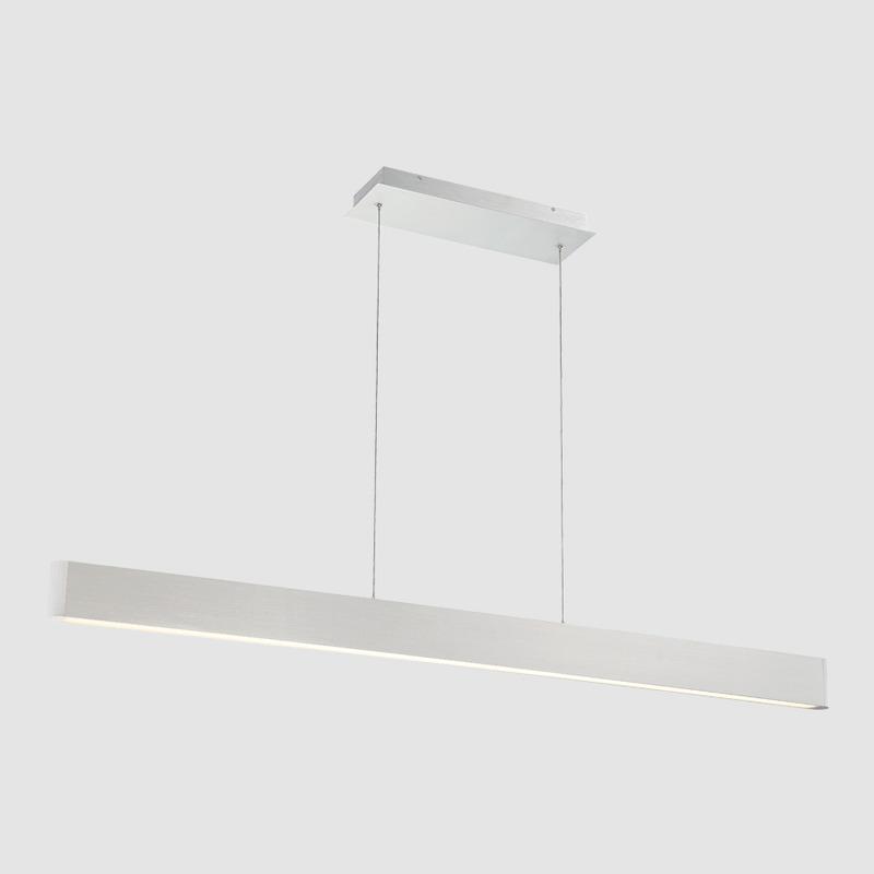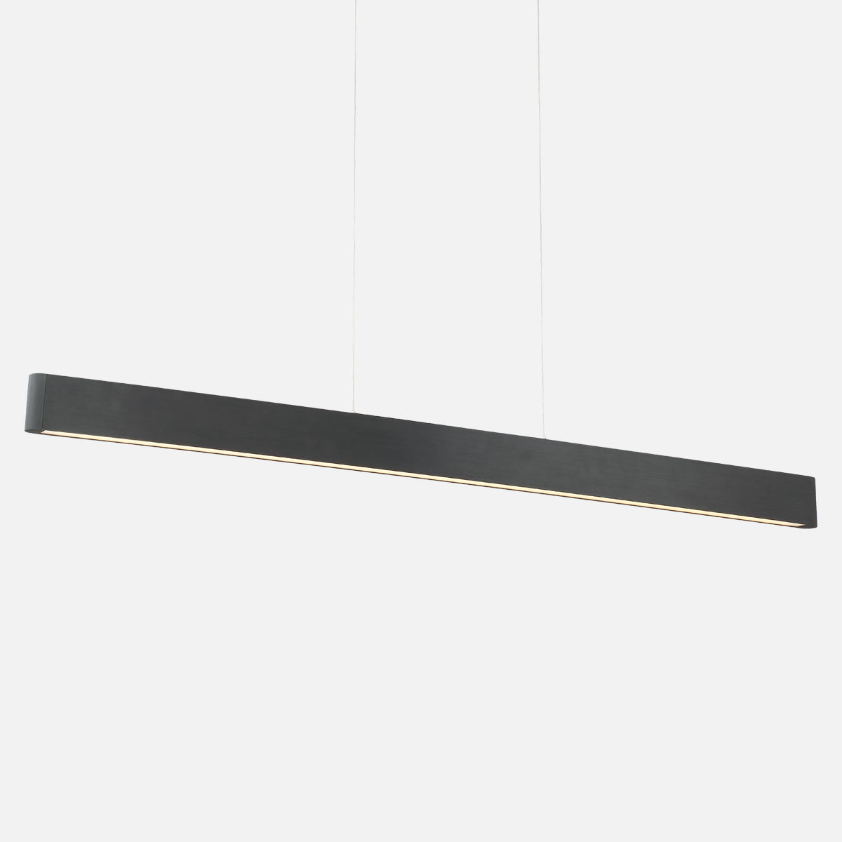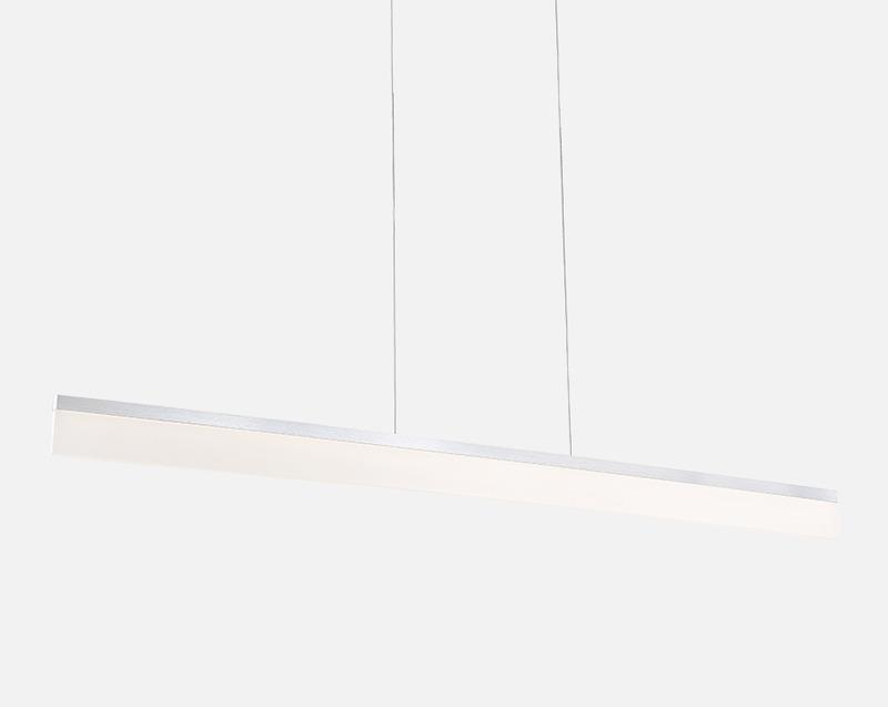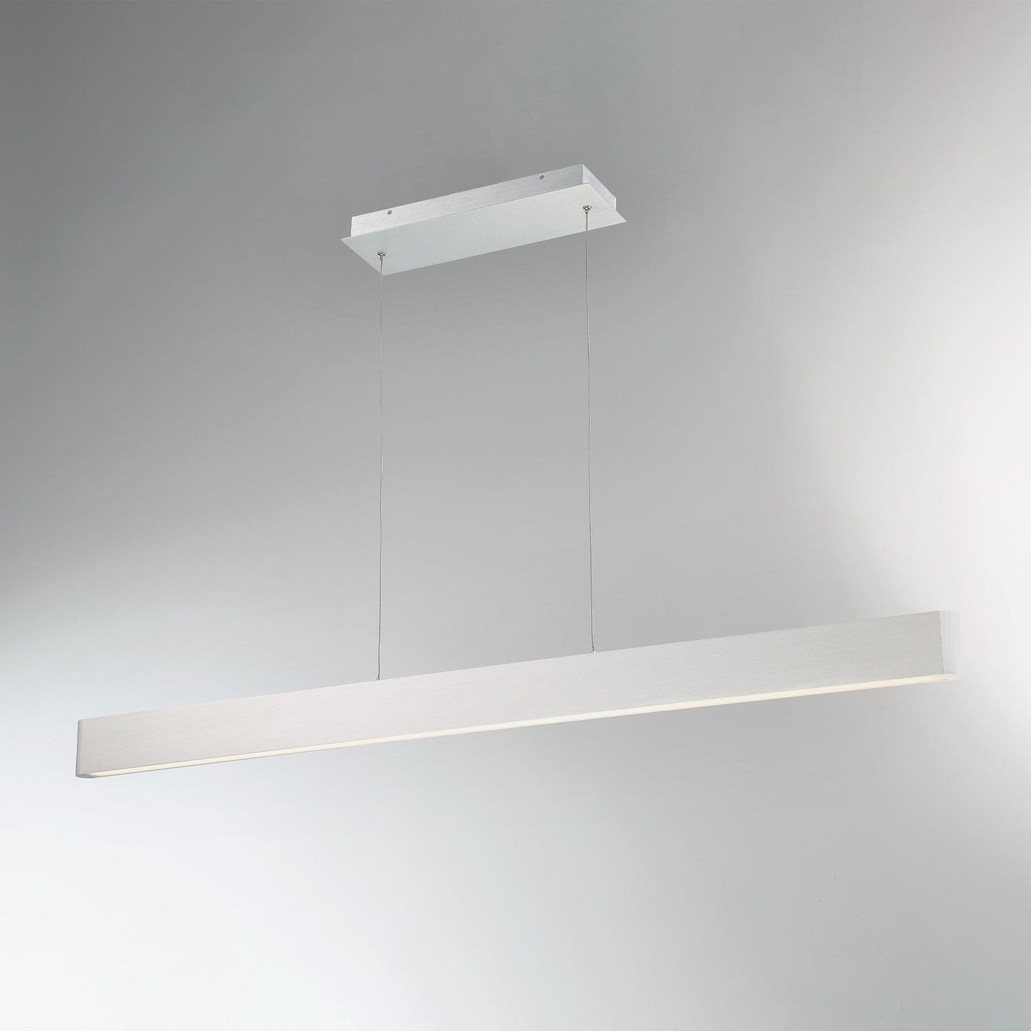 Wishful lighting in a luminous linear chandelier with a handsome brushed metal finish and rounded ends. Ultra thin pendant for the discerning minimalist. Volo is suspended on two thin low profile cables without the need for an additional power cord, lending to a simple and minimalistic design. Adjustable to different lengths through a push-pin locking mechanism at the canopy.