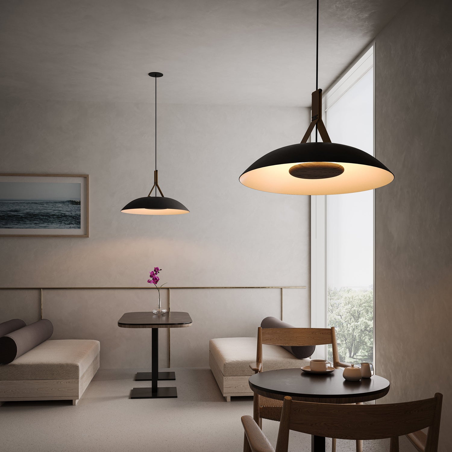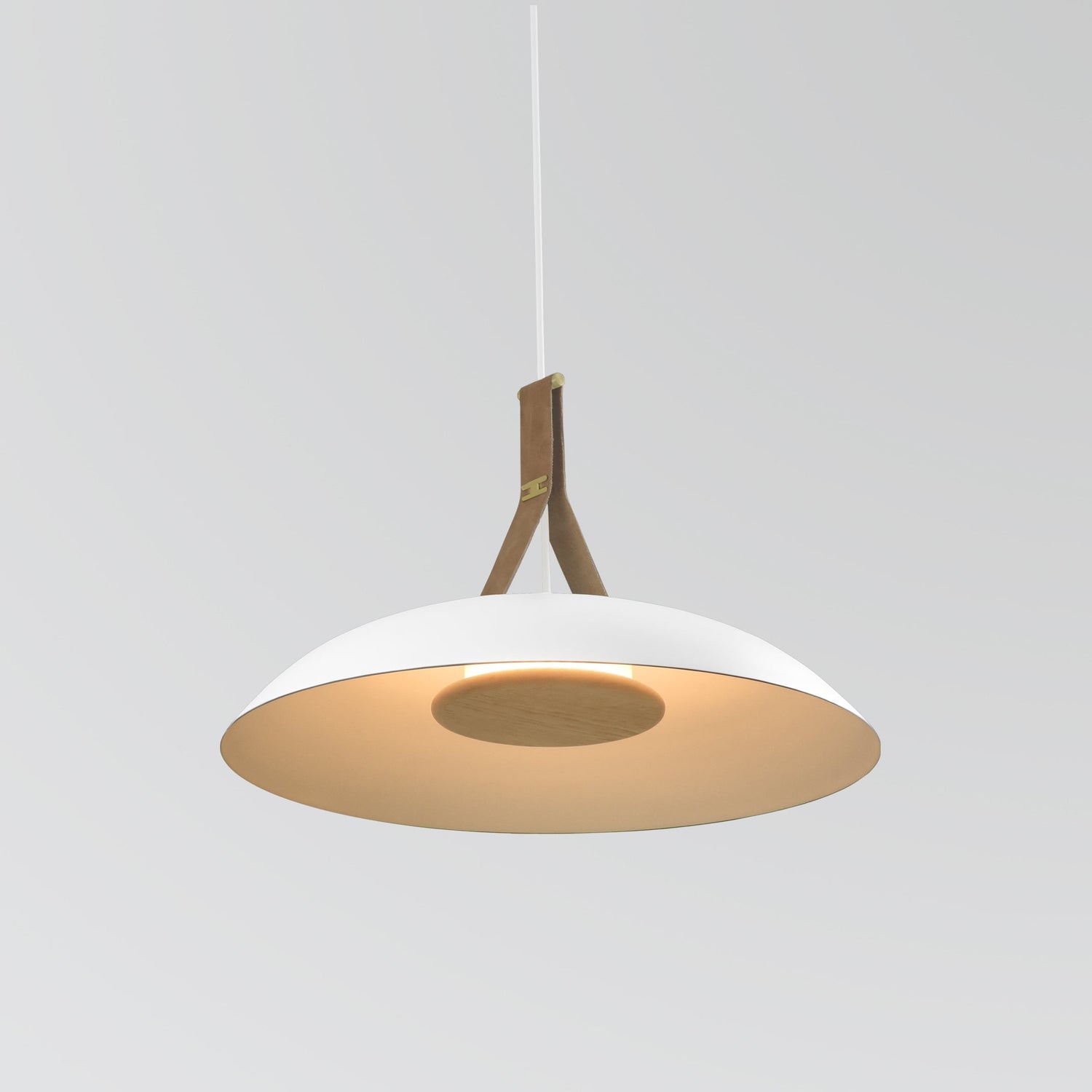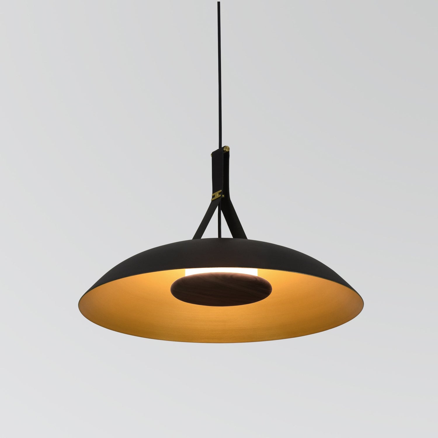 The handcrafted Volo pendant is a celebration of natural materials. The solid hardwood, brass finish, leather, and aluminum showcase the purposeful design that went into each detail. The indirect LED light source emits light of beautiful quality.