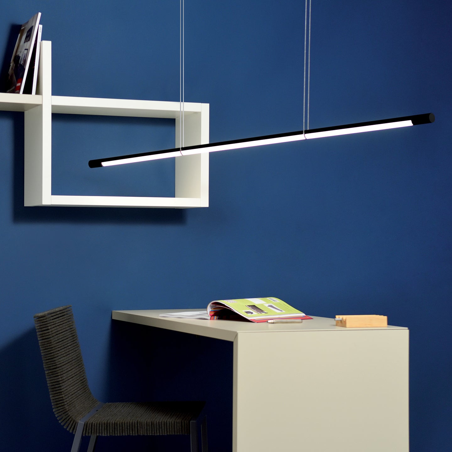 The Volta, by FROM Industrial Design, is an innovative linear suspension lamp that takes state of the art technology and compacts it into a simple form and user experience. The lamp floats on two cables that both power the light and suspend it. The Volta can also rotate 360 degrees around these cords to create up light, downlight or any angle in between. The lamp also subtly houses the dimmer on the end of its body for easy access. It can be hung parallel to the floor, slightly tilted¡ªor in groups to give it a completely different look, from professional to whimsical.