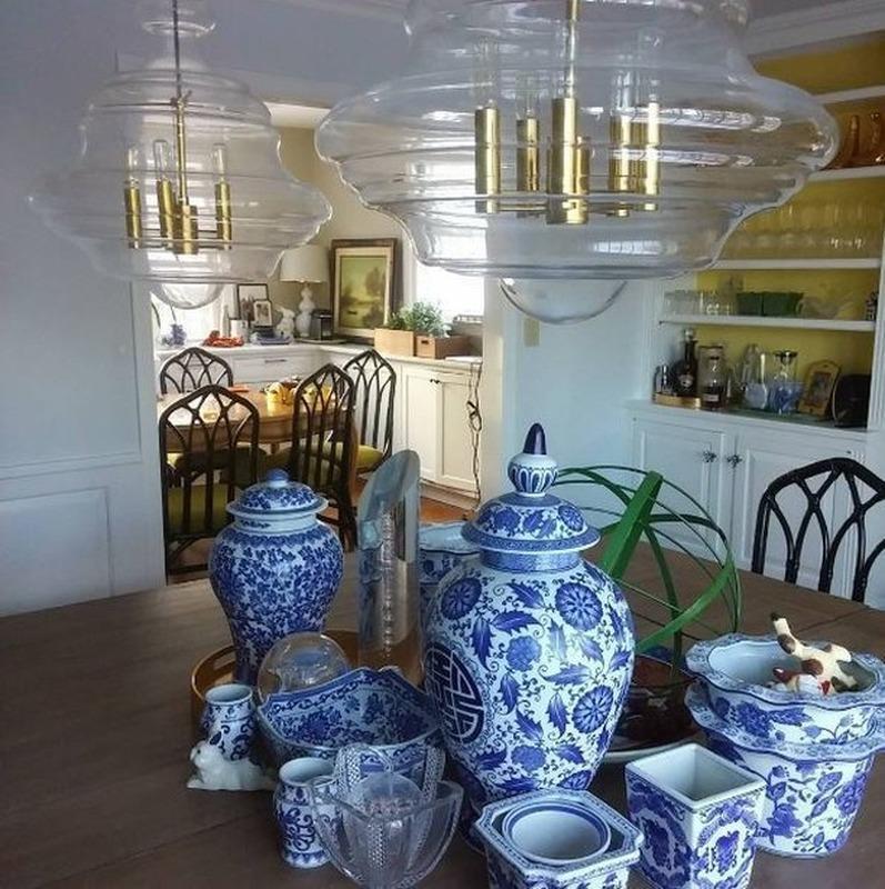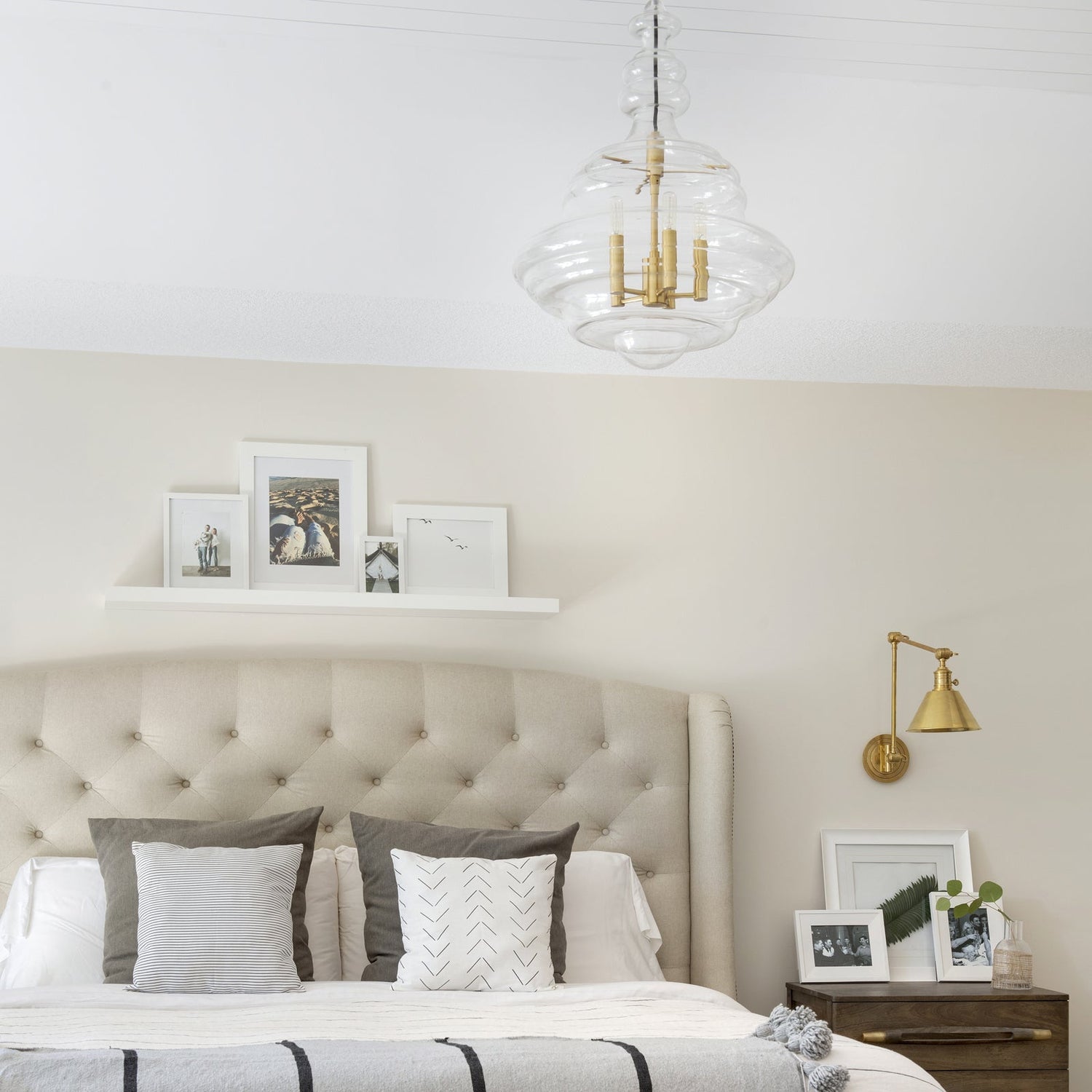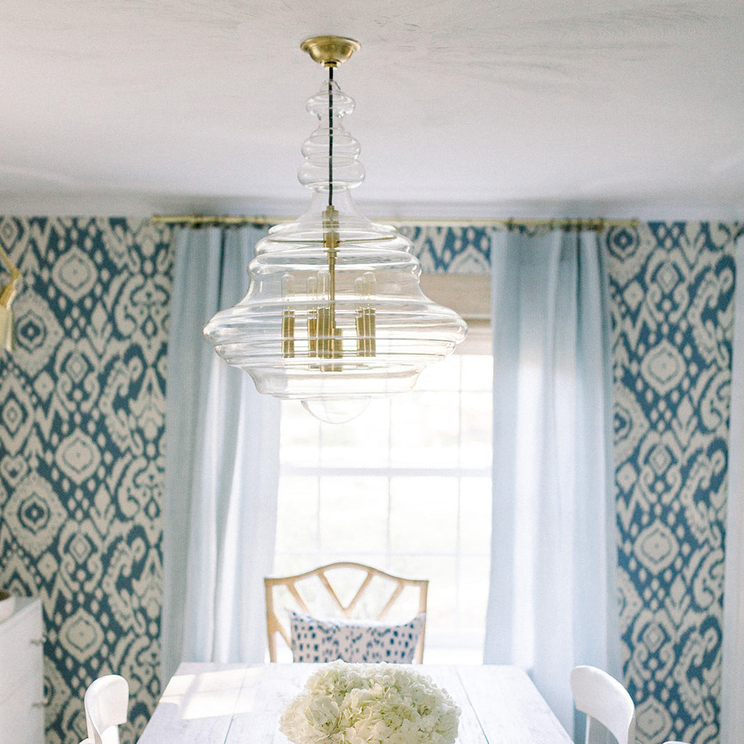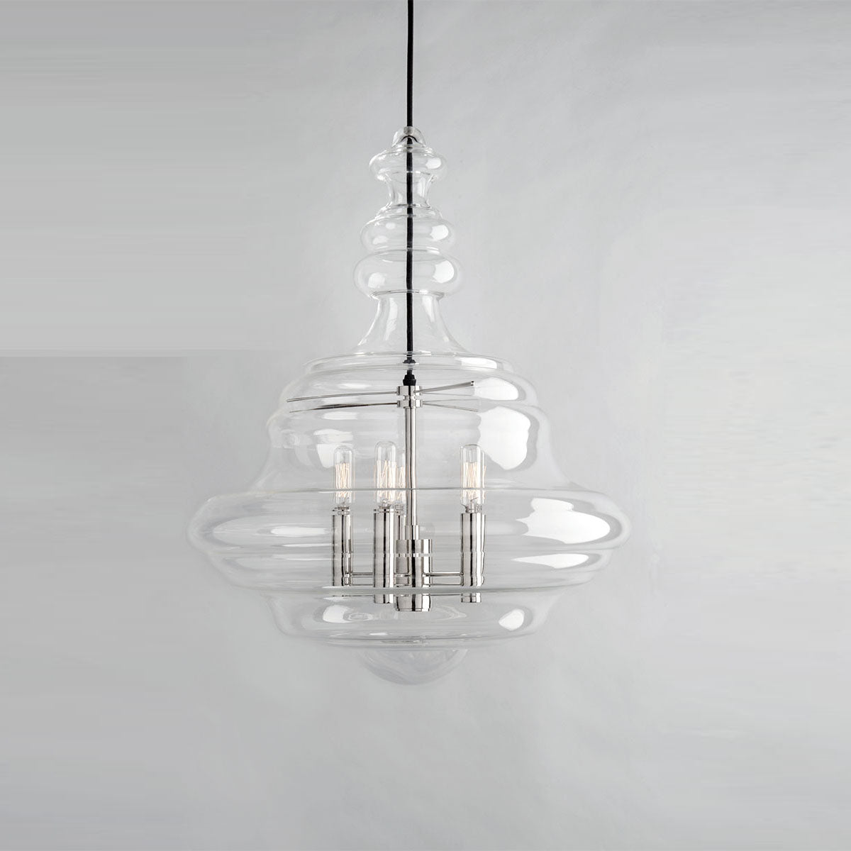 To create Washington's elaborate shape, a skilled artisan works molten glass into a paste mold as an assistant assiduously turns it. With careful timing, the team produces a seamless piece of beautifully figured glasswork. Smooth cylinders of metal sporting exposed-filament bulbs complement the round contours and curves of this breathtaking outer layer of glass.