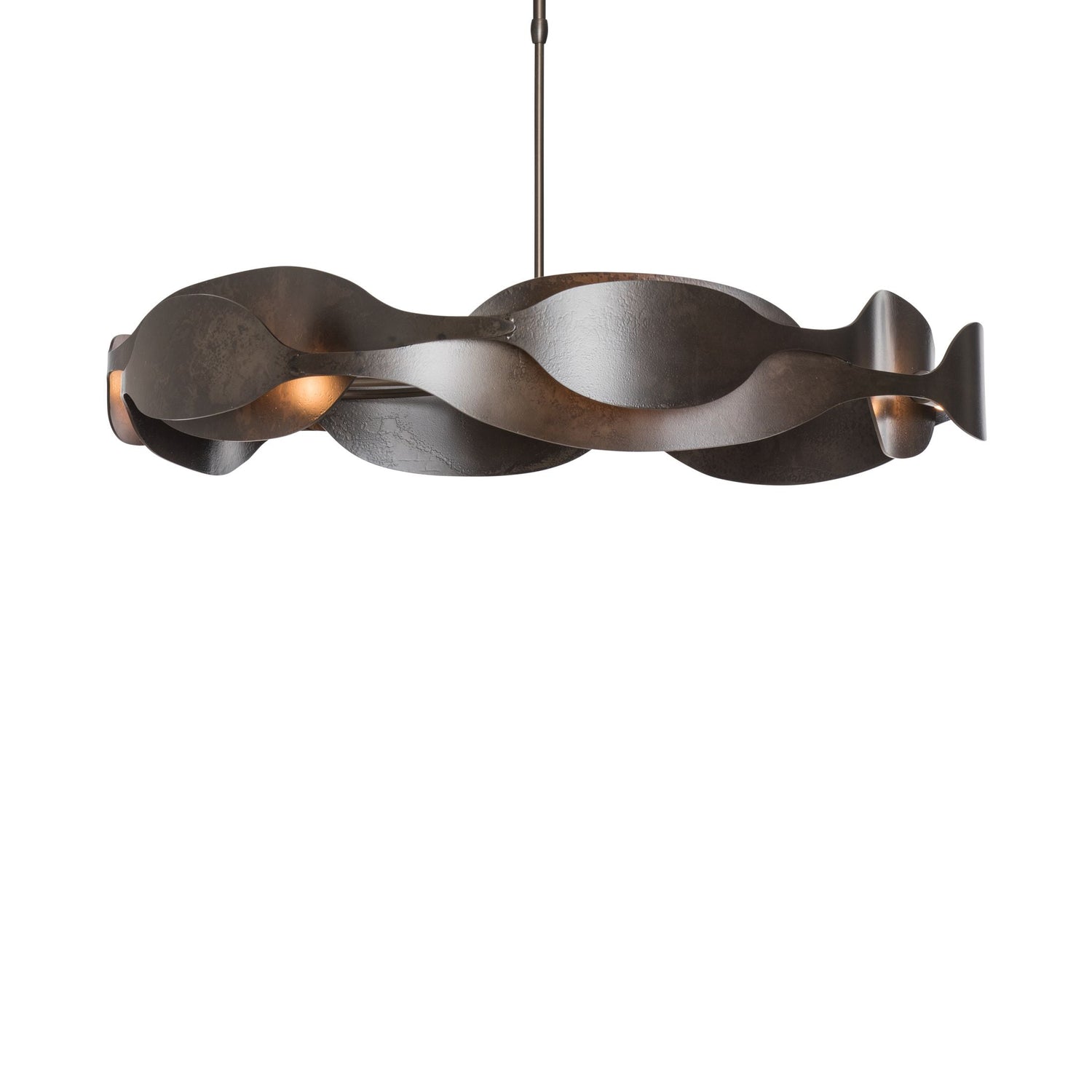 With a sensual interplay of light and shadow, the Waves Pendant suggests a fluidity of motion, an eternal circle of life. Heavily textured steel showcases the skill of the American metal crafters and artisans at the Forge.