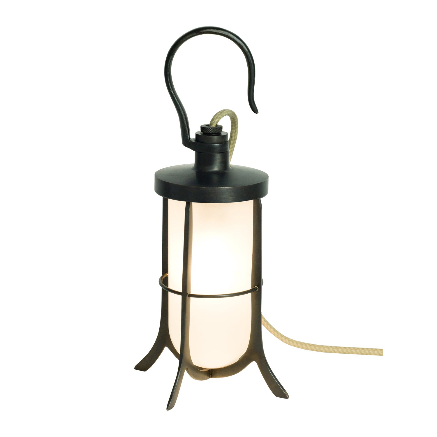 The Well Glass Hook light was designed as a portable hand-held task light. Originally fitted with a long rubber cable for easy transportation and a hook for hanging on ship's decks or stable doors, today, the rubber has been exchanged for a cotton braided cable so the light can be placed on flat surfaces or suspended.