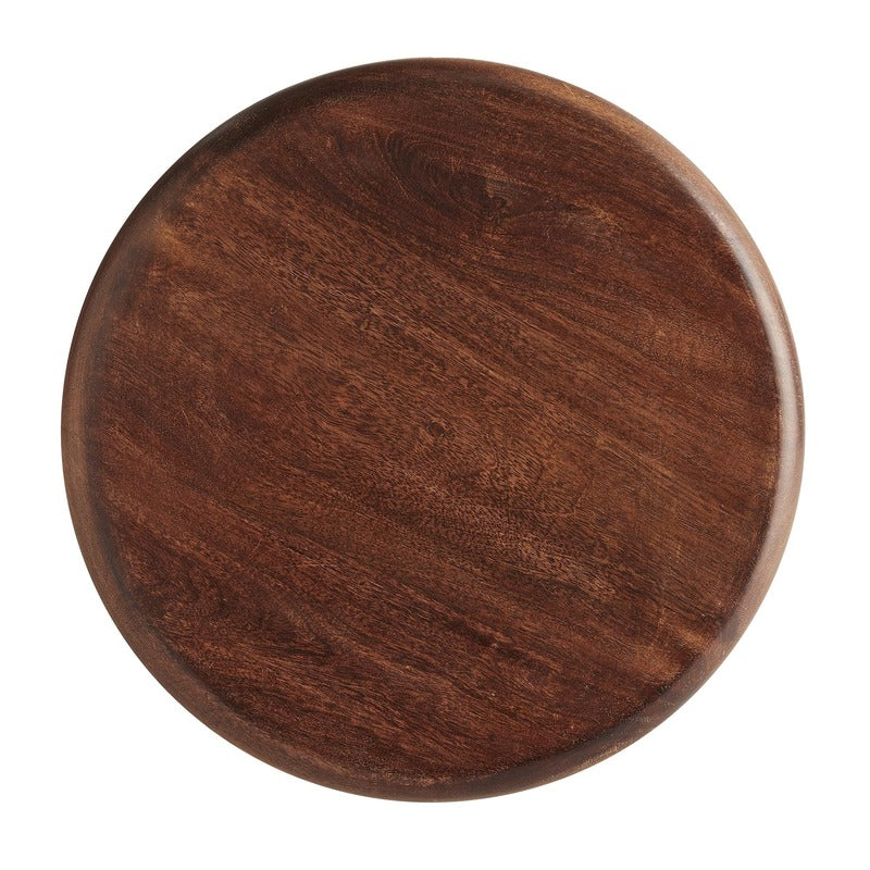 Stool with tube shaped triangular iron legs in vintage brass finish with round wooden swivel seat in distressed wax finish.