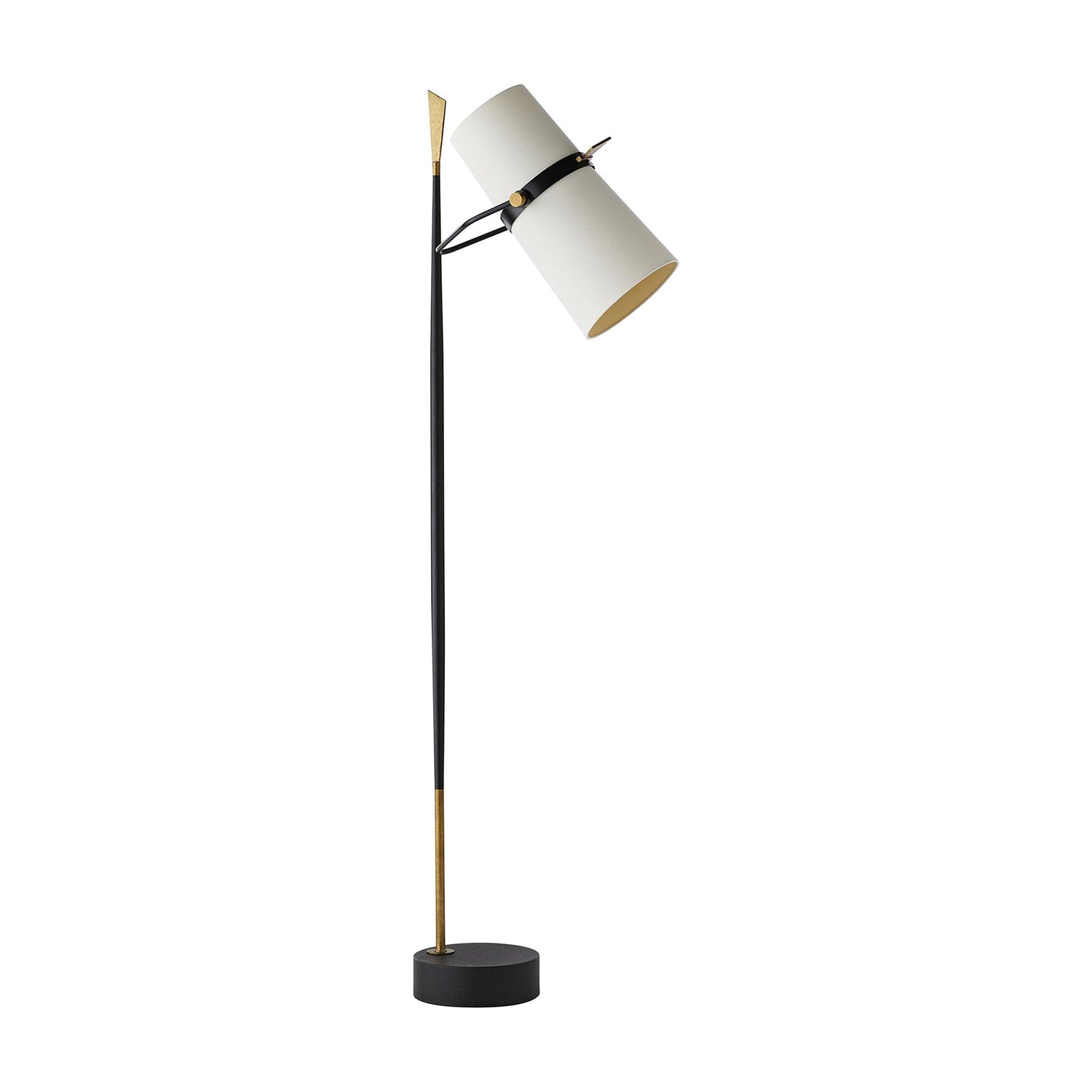 Modern floor lamp with a black iron tapered slender vertical rod and a blade shaped vintage brass finish finial. A white linen cylindrical double shade with off-white cotton lining allows for directing task lighting. Full range dimmer.