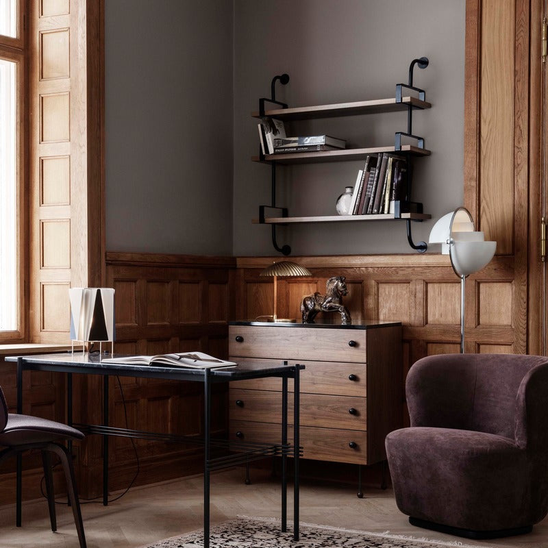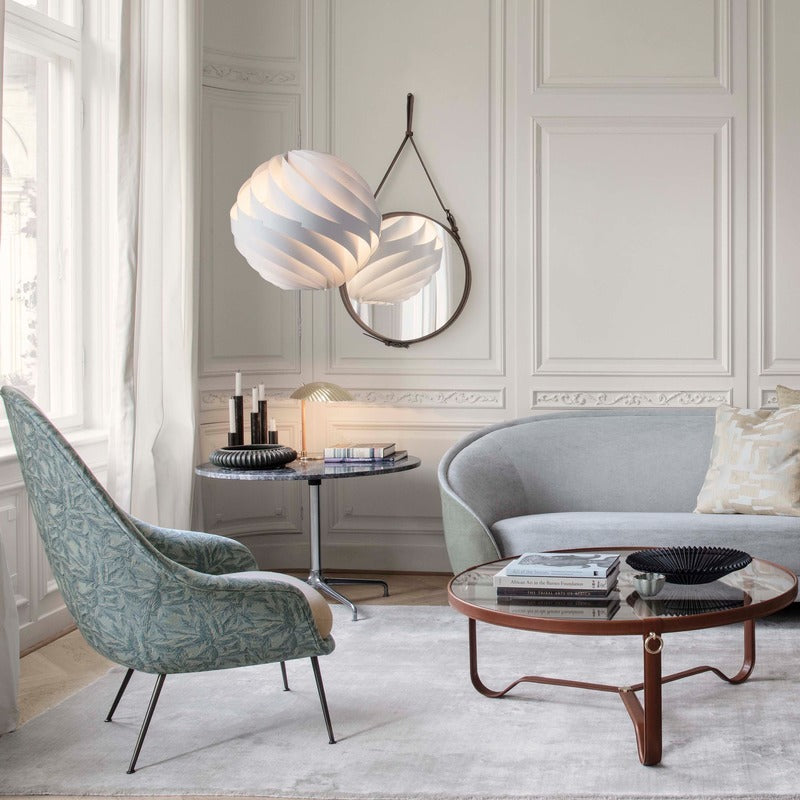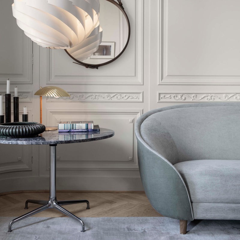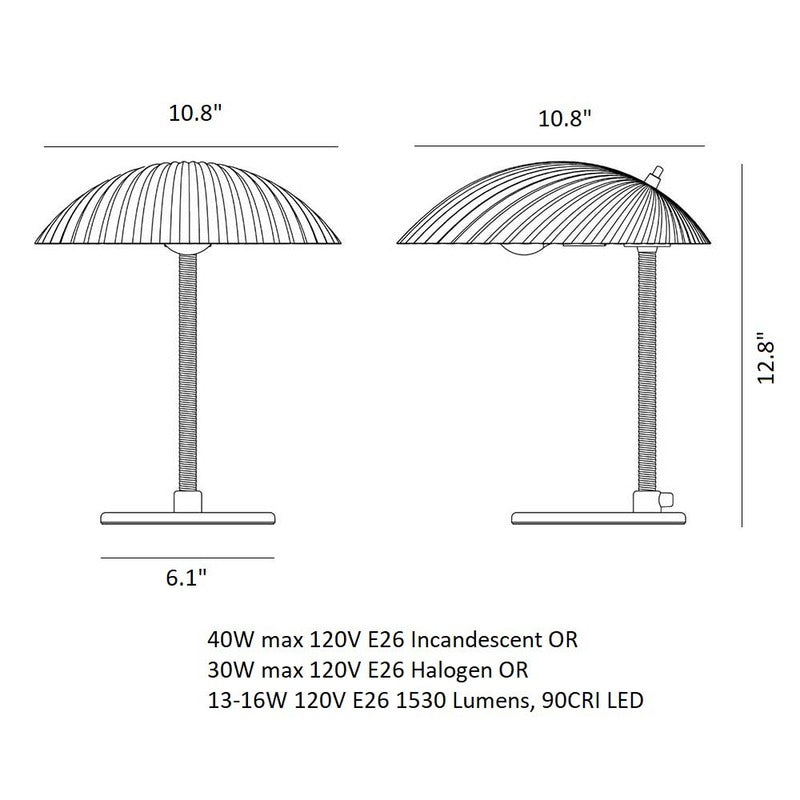 Paavo Tynell's fanciful take on nature is gracefully echoed in the 5321 Table Lamp, designed by the Finnish designer in 1938. Under the distinctive shell-inspired brass shade, the bulb subtly appears from beneath; a picturesque detail resembling the desirable sea shell pearl and making the 5321 Table Lamp a perfect example on how Tynell brought a playful nature and romance to the simplified style of mid-century modernism. Blending timeless aesthetic with a unique sense of form, the 5321 Table Lamp adds an exquisite character to complement any modern space. Both decorative and functional, the lamp is a balance of elegance and curiosity, providing a design that is at once subtle and surprising.