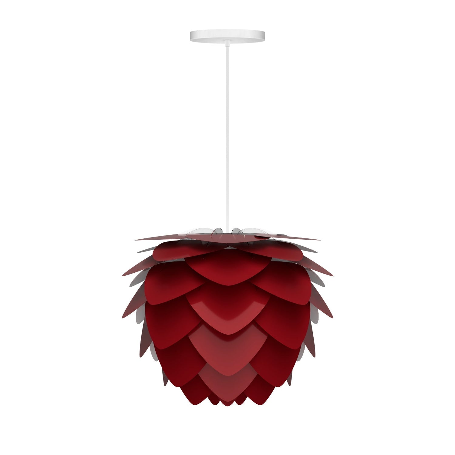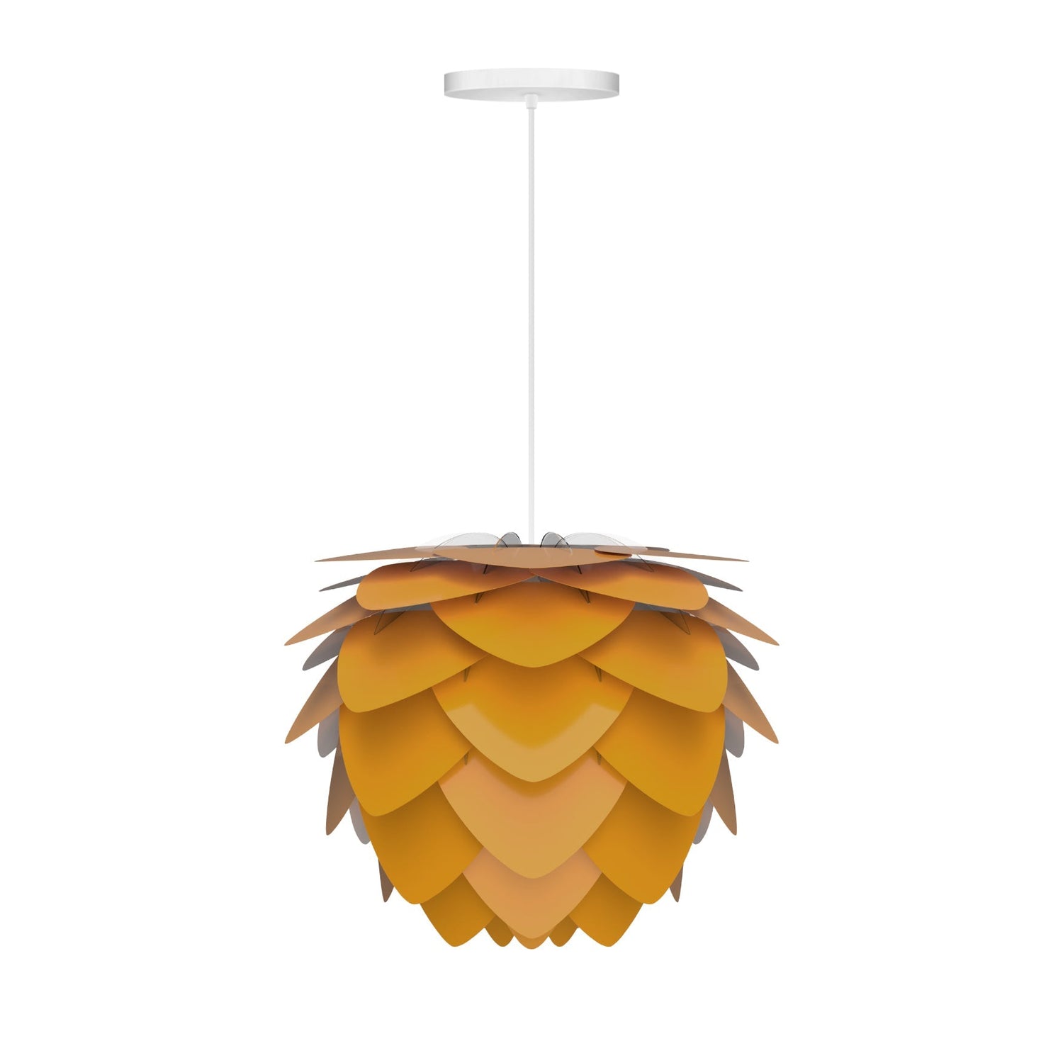 Modern. Elegant. Striking. The Aluvia is an artistic assemblage of 60 precision-cut aluminum leaves, overlapping each other on a durable polycarbonate frame. These metal leaves surround the light source, emitting glare-free, ambient light. The underside of each leaf is painted white for increased light reflection, and the exterior is finished in various colors. Hang over the dining table, position it in a corner, or use as a statement piece anywhere; the Aluvia makes an artistic impact in any room.