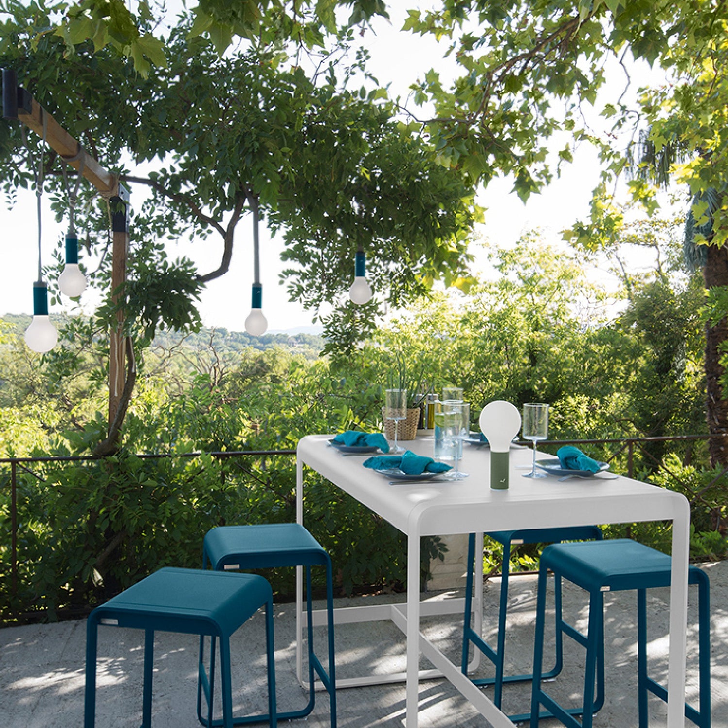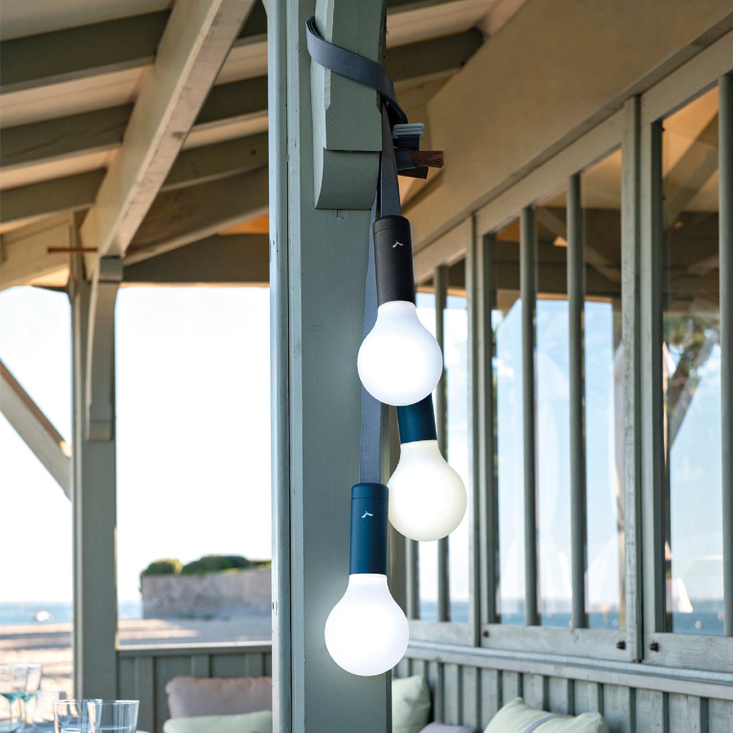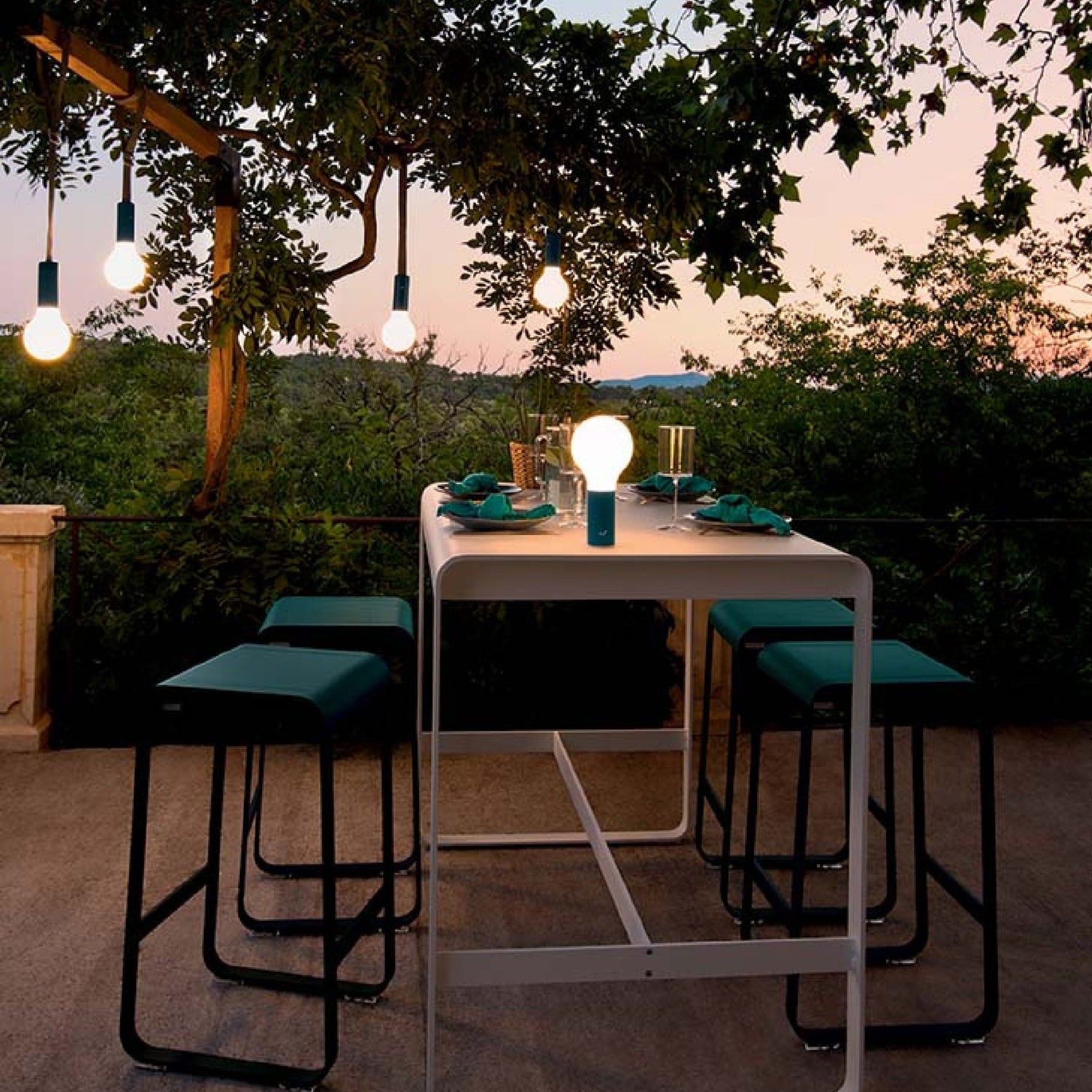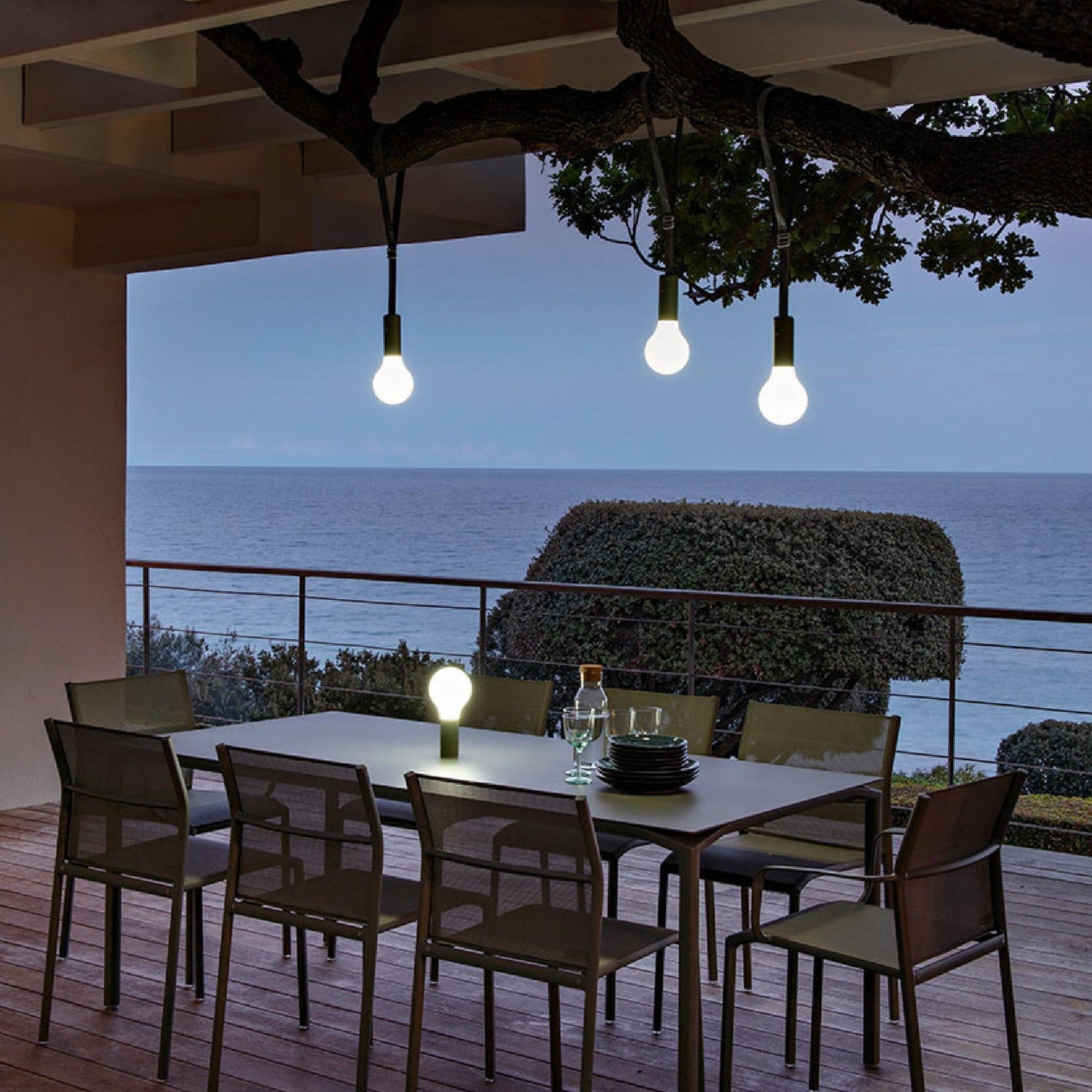 The Aplo Lamp by Fermob showcases equal parts function and style. Its sleek cylindrical body is made entirely of aluminum and is topped with an exposed bulb that has several temperatures and light intensities to adjust its glow. Suitable for both outdoor and indoor use, this piece is finished in an anti-UV coating that comes in array of color options. It can stand alone as a table lamp, or transform into a sconce or pendant when paired with a wall bracket or suspension strap accessory.