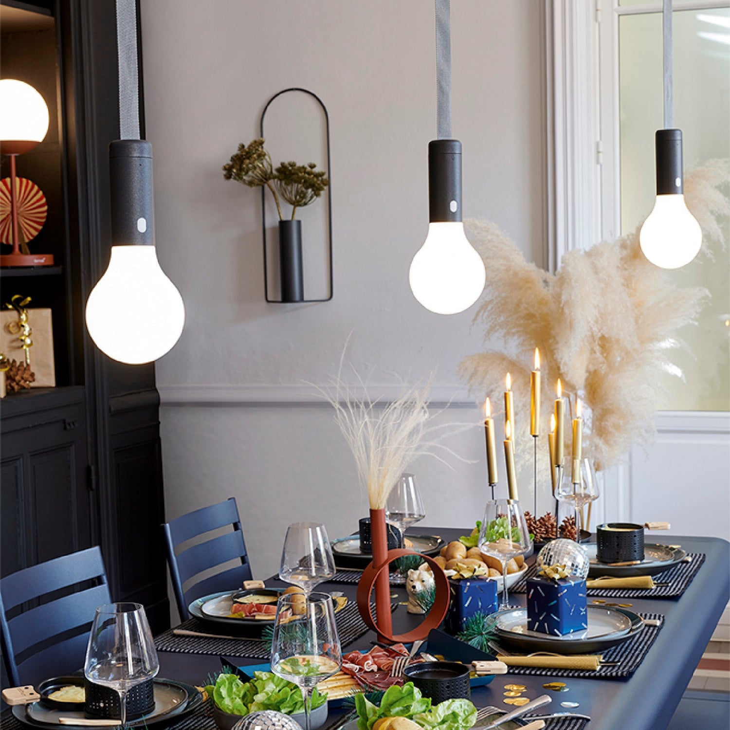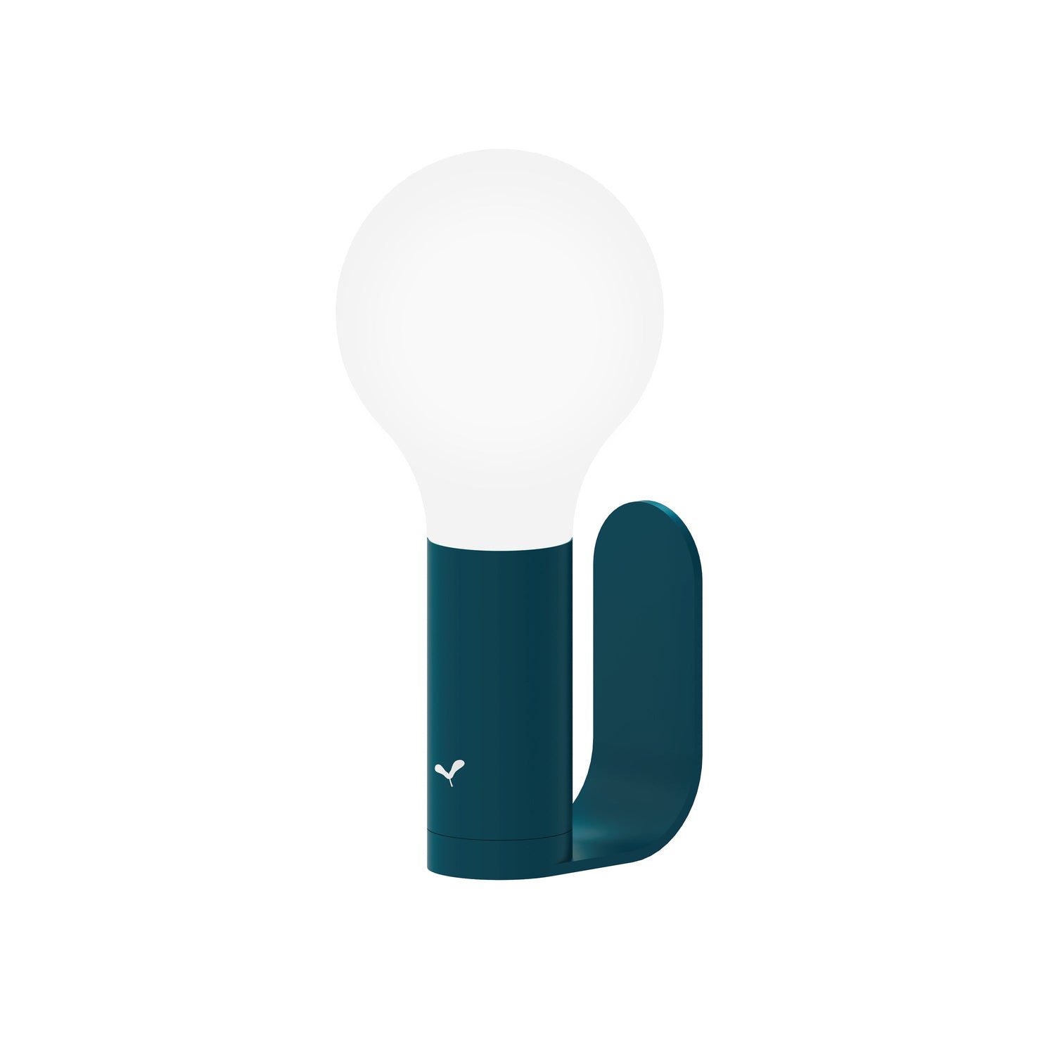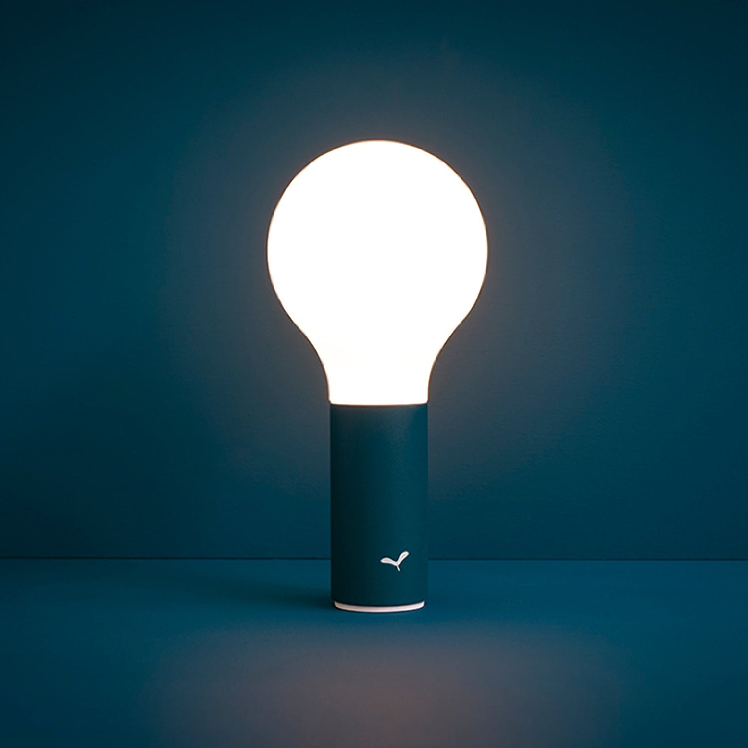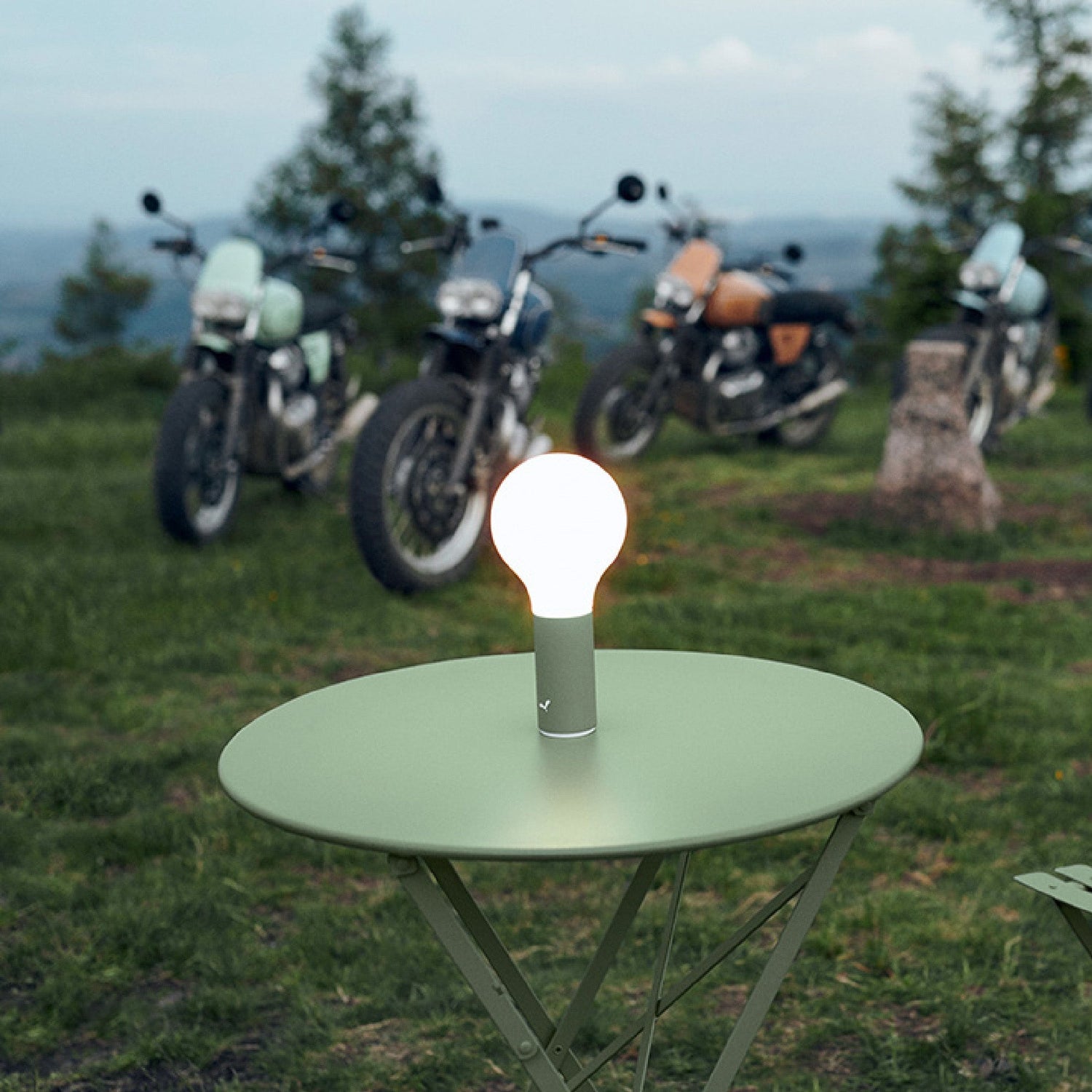 The Aplo Lamp by Fermob showcases equal parts function and style. Its sleek cylindrical body is made entirely of aluminum and is topped with an exposed bulb that has several temperatures and light intensities to adjust its glow. Suitable for both outdoor and indoor use, this piece is finished in an anti-UV coating that comes in array of color options. It can stand alone as a table lamp, or transform into a sconce or pendant when paired with a wall bracket or suspension strap accessory.