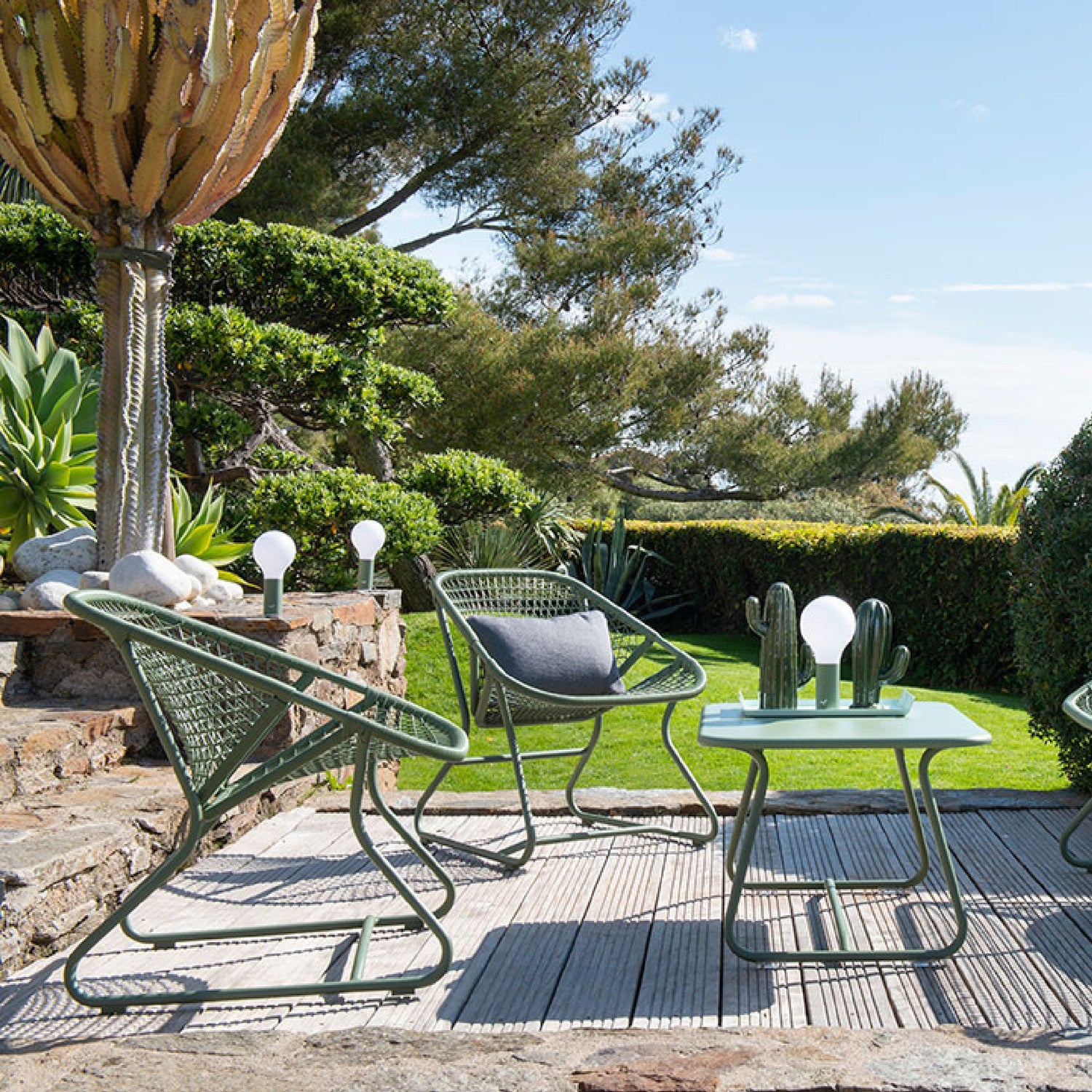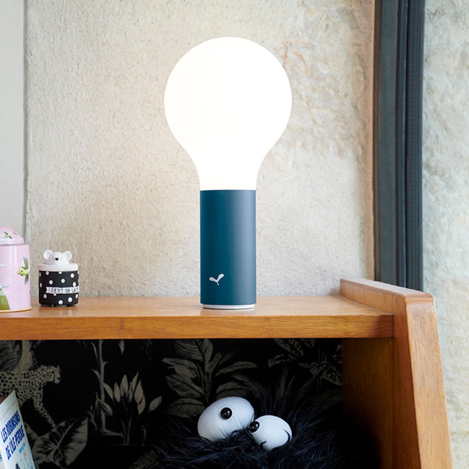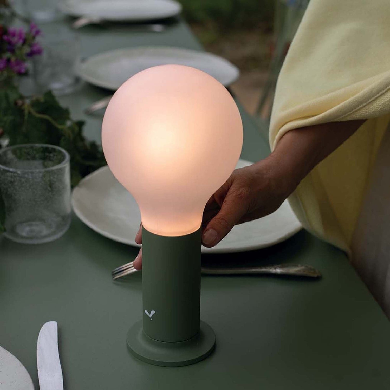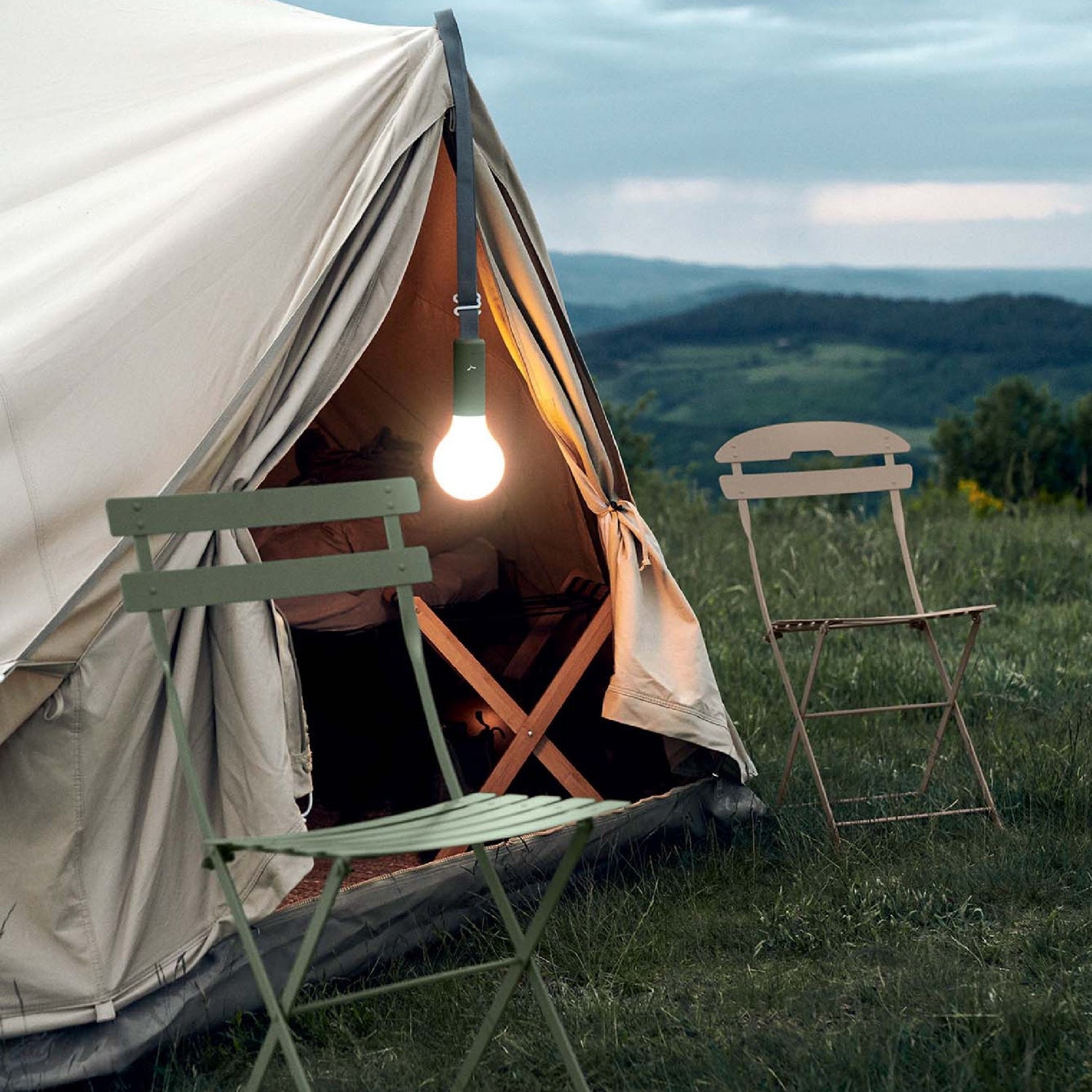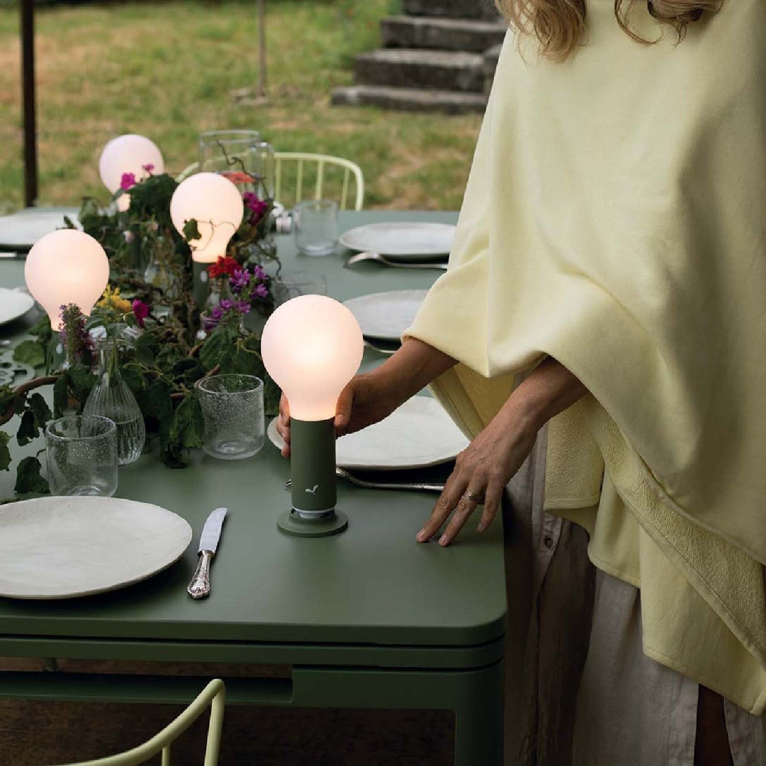 The Aplo Lamp by Fermob showcases equal parts function and style. Its sleek cylindrical body is made entirely of aluminum and is topped with an exposed bulb that has several temperatures and light intensities to adjust its glow. Suitable for both outdoor and indoor use, this piece is finished in an anti-UV coating that comes in array of color options. It can stand alone as a table lamp, or transform into a sconce or pendant when paired with a wall bracket or suspension strap accessory.