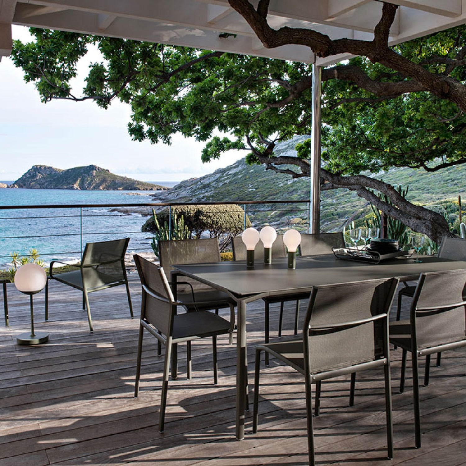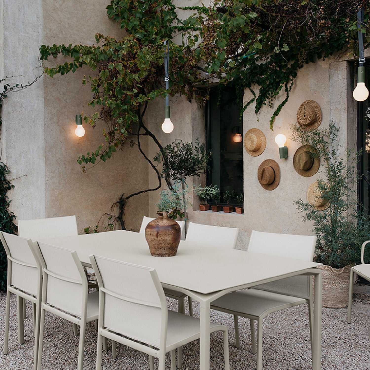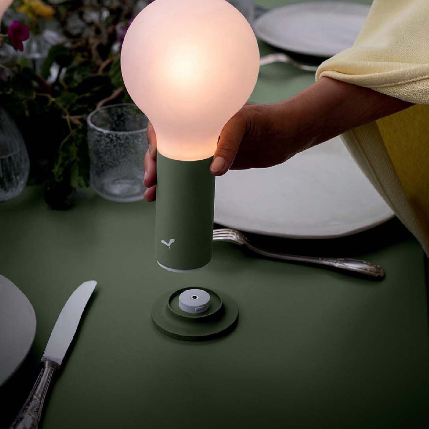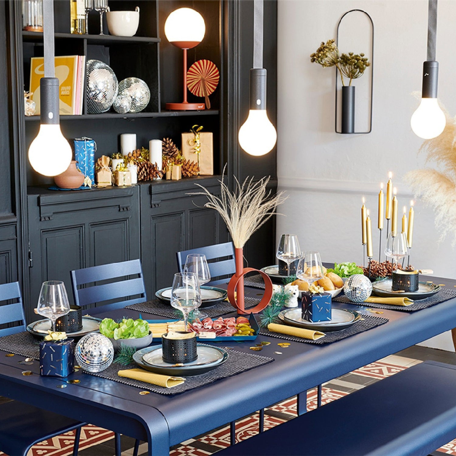 The Aplo Lamp by Fermob showcases equal parts function and style. Its sleek cylindrical body is made entirely of aluminum and is topped with an exposed bulb that has several temperatures and light intensities to adjust its glow. Suitable for both outdoor and indoor use, this piece is finished in an anti-UV coating that comes in array of color options. It can stand alone as a table lamp, or transform into a sconce or pendant when paired with a wall bracket or suspension strap accessory.