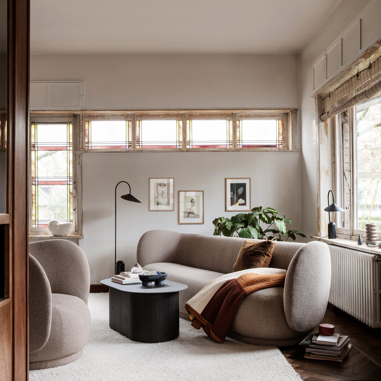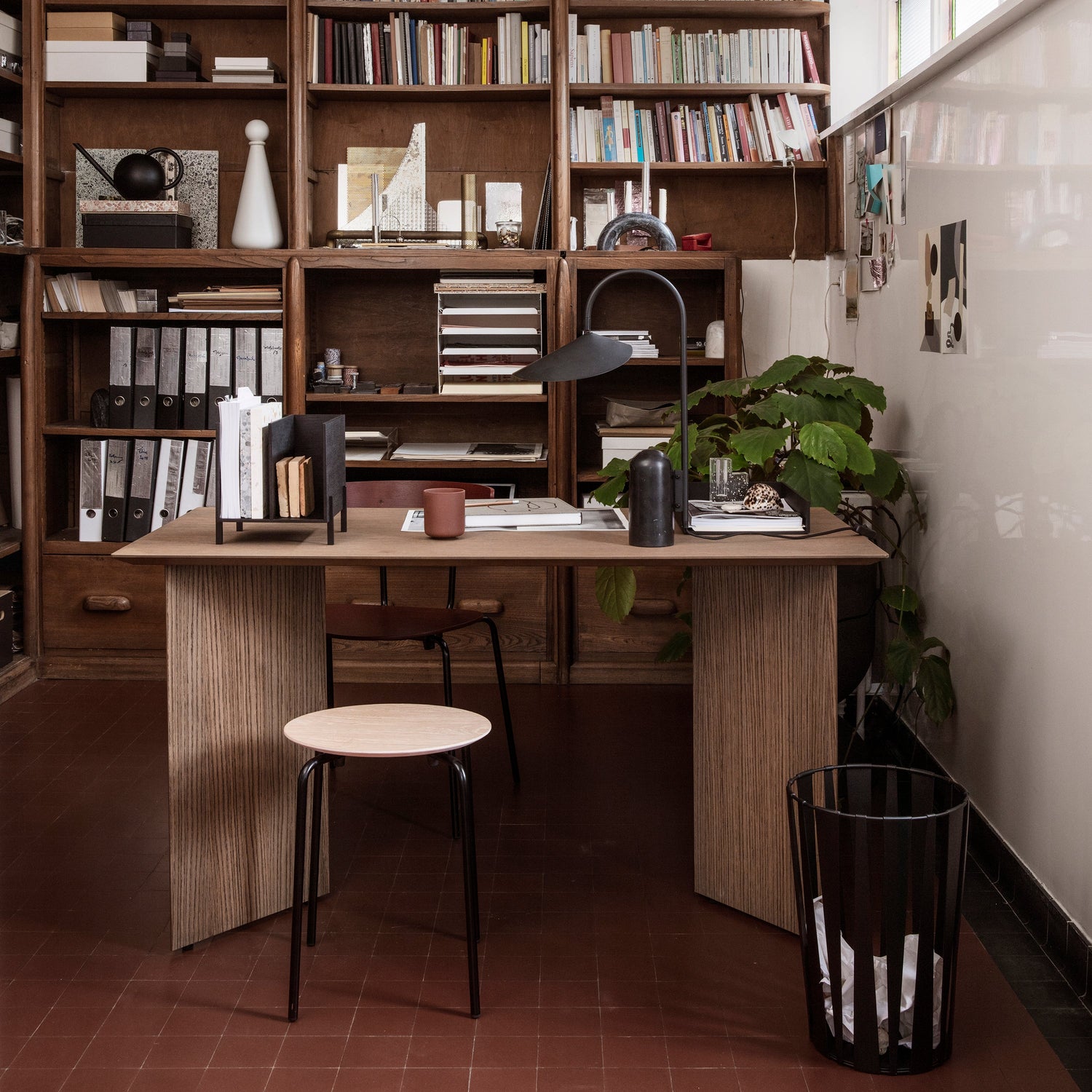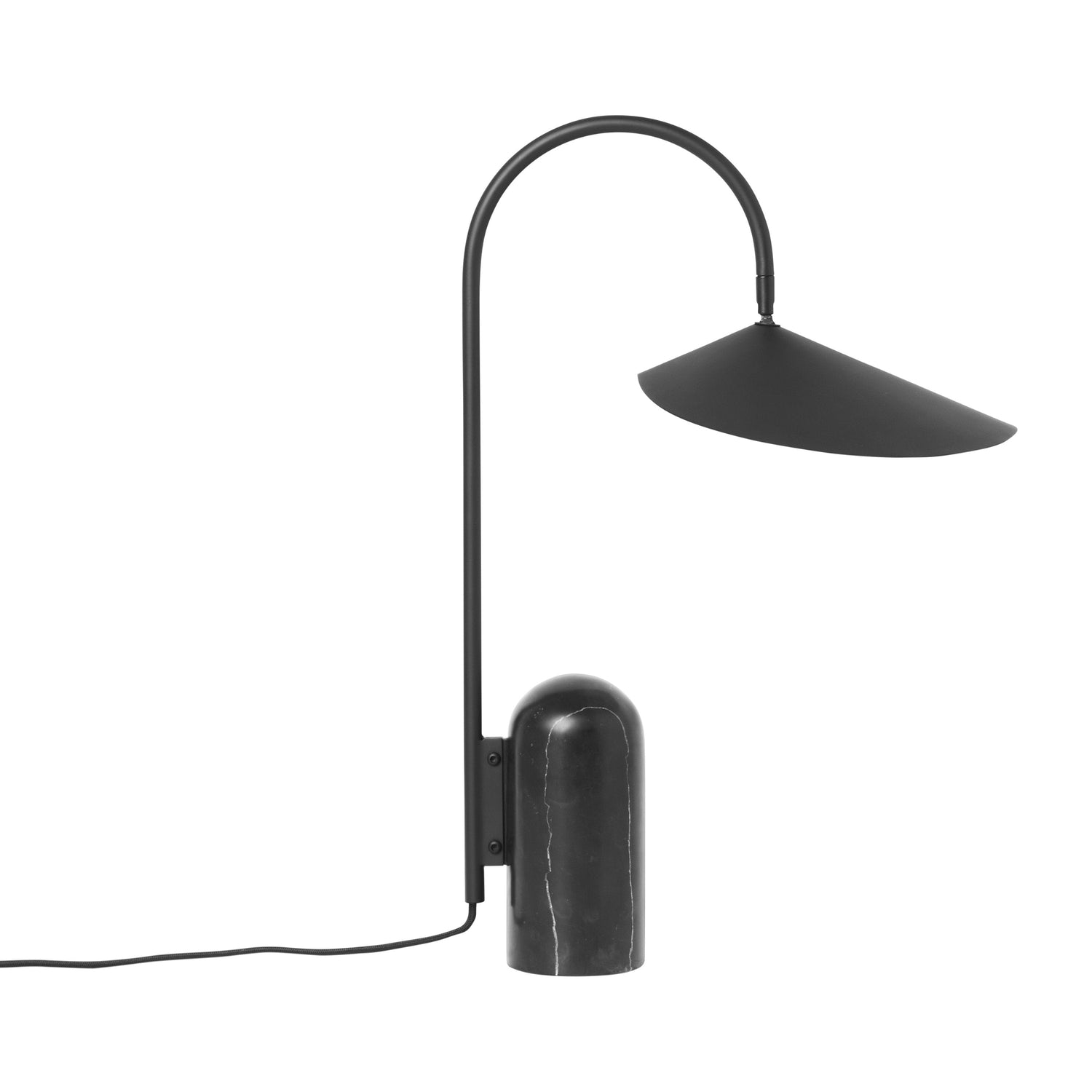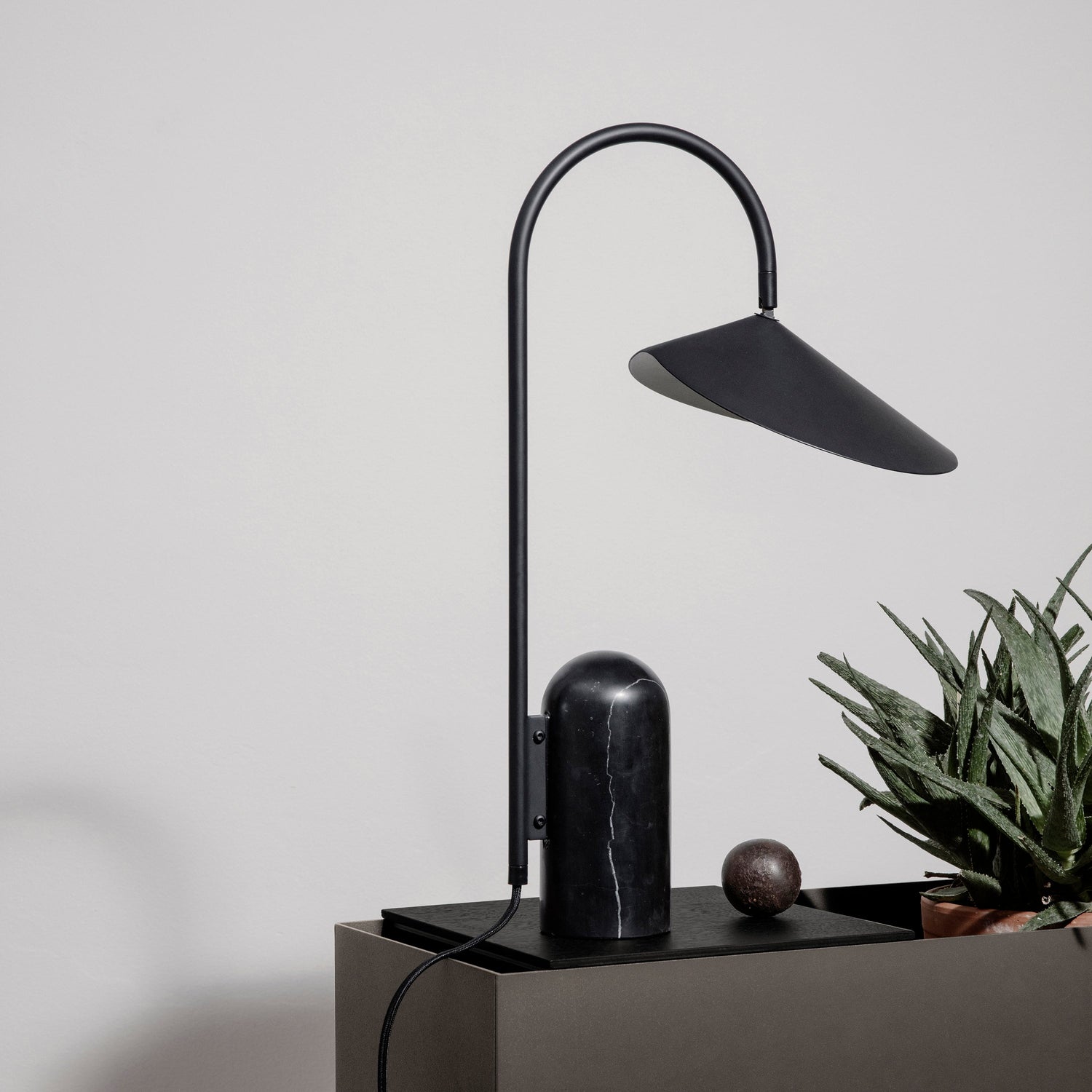 The Arum Table Lamp is characterised by the black solid marble base combined with the organically shaped lampshade. Achieving the perfect balance in the off-centre structure of the lamp, the black marble foot counterweighs the gentle way the lampshade is suspended from the curved metal arch in a leaf-like manner. With the mattee, off-white inside of the shade, the lamp provides a soft, evenly distributed light, and the lampshade can be adjusted to ensure optimal light conditions in all situations.