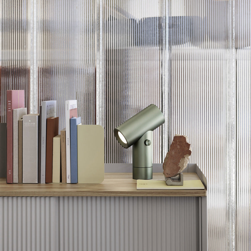 Beam Lamp is a versatile table lamp with a modern expression and intuitive user-friendliness. With light omitted from both ends of a cylinder shape, the user can alter the volume of light in each end through the turn of a playful dial. The Beam Lamp can be altered for any position with its rotational base and sleek body of anodized aluminum, whether it be as direct lighting or for an ambient glow in any home, offices, hotel room and educational areas.