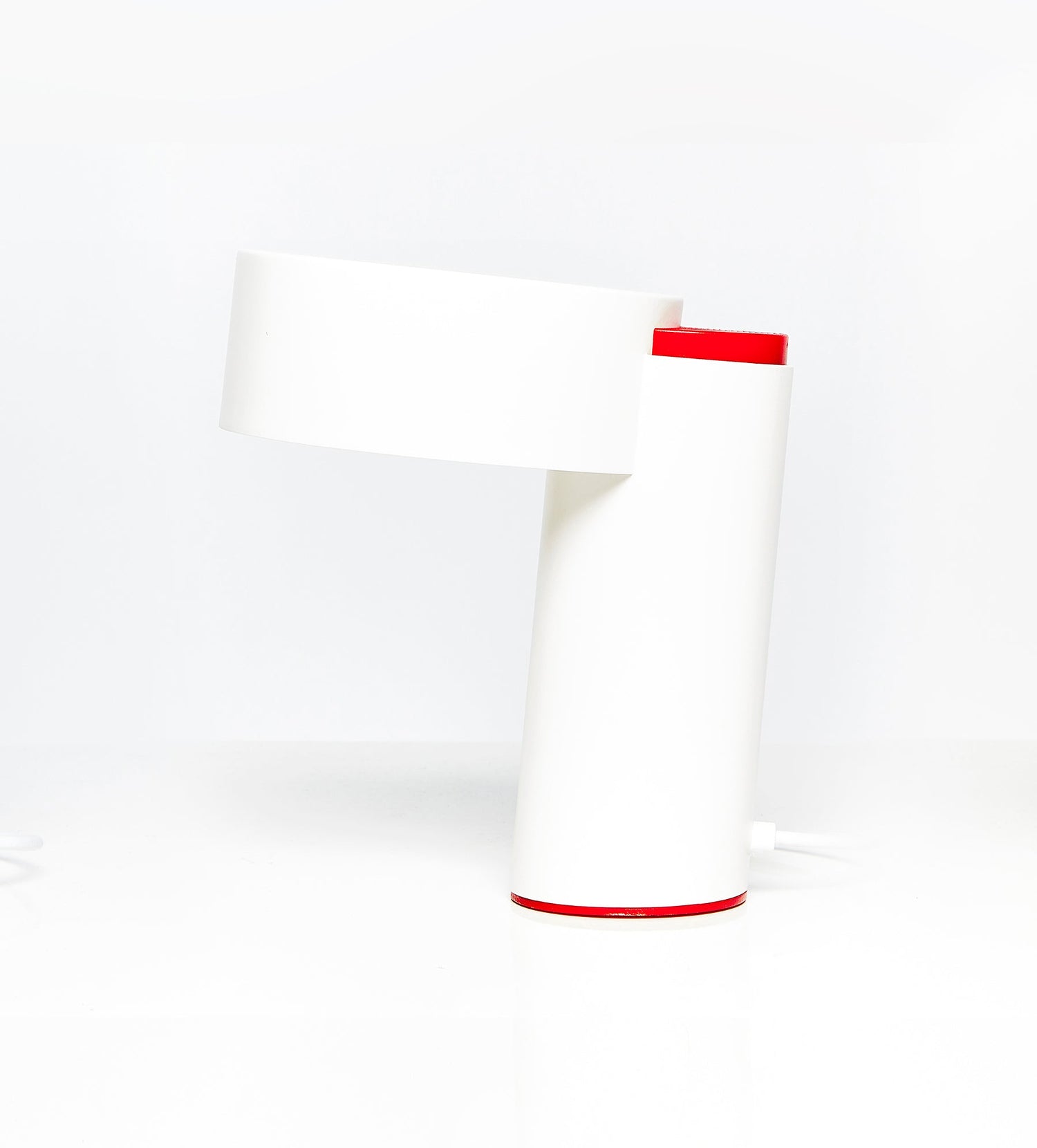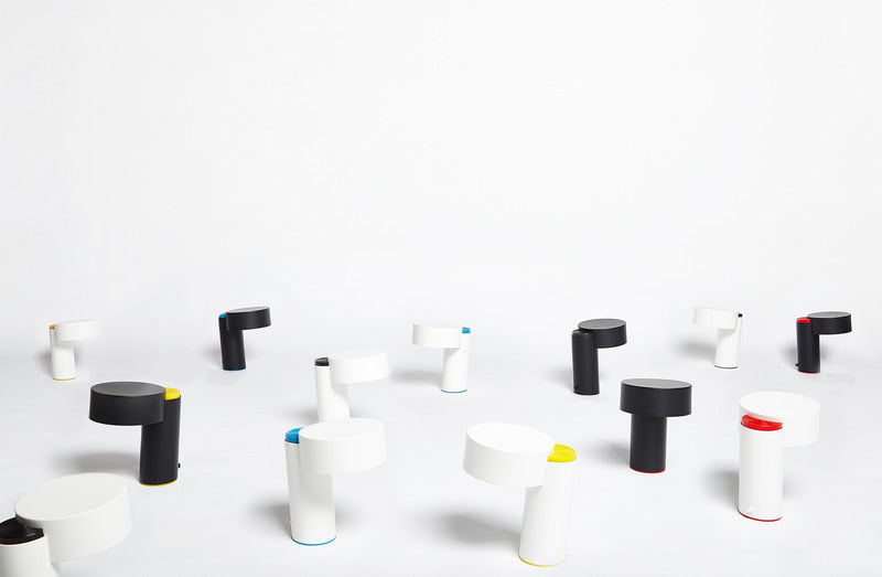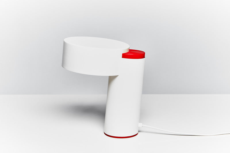 Big Switch is a table light that makes what is often a hidden element into its defining feature. Its crescent-shaped button with a ridged surface clicks down to activate. The switch and base are cast in red, yellow, blue, or black polyurethane like you would find in a skateboard wheel.