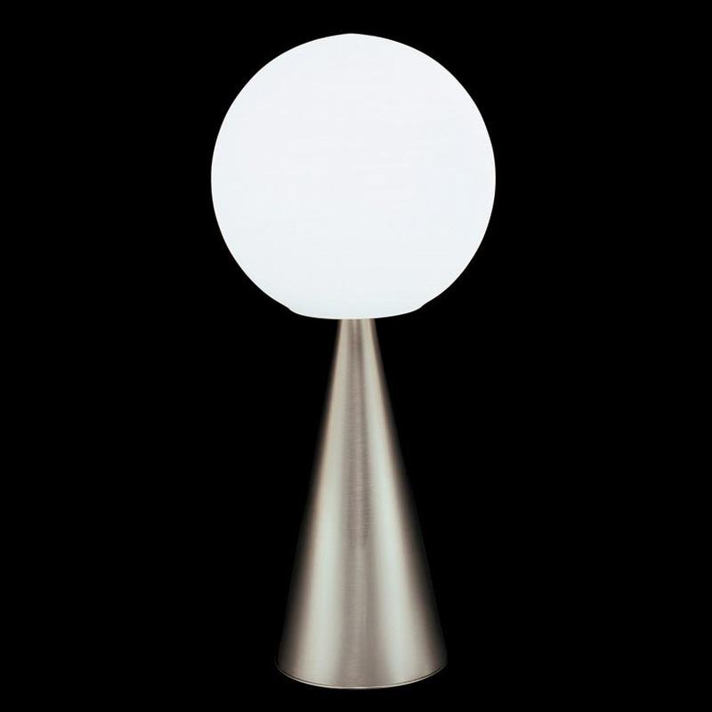 A cone and a sphere: two essential, recognizable geometric shapes. An unpretentious composition, enriched by the extraordinary balance of its proportions and the stylish discretion of non-reflective materials: the diffuser is in frosted blown glass, the frame in brushed nickel-plated metal.