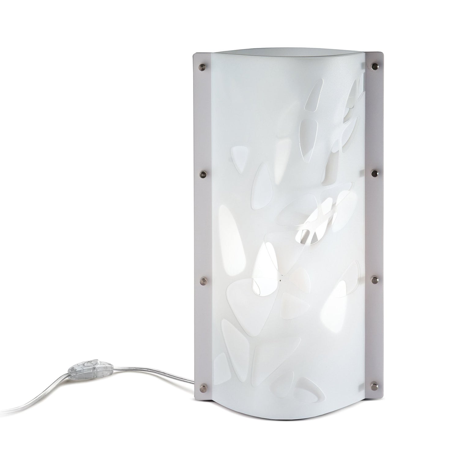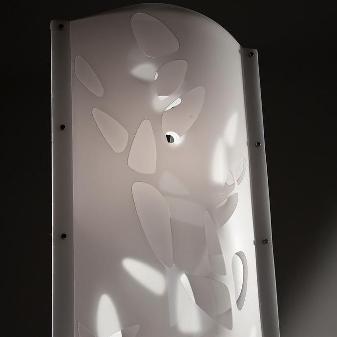 A soft and naturalistic design for a linear lamp with tone-on-tone decoration. Two layers of Opalflex with irregular holes suggest the complex voids in many natural materials. The lamp allows light to filter through its layers, creating suggestive shadows and reflections.