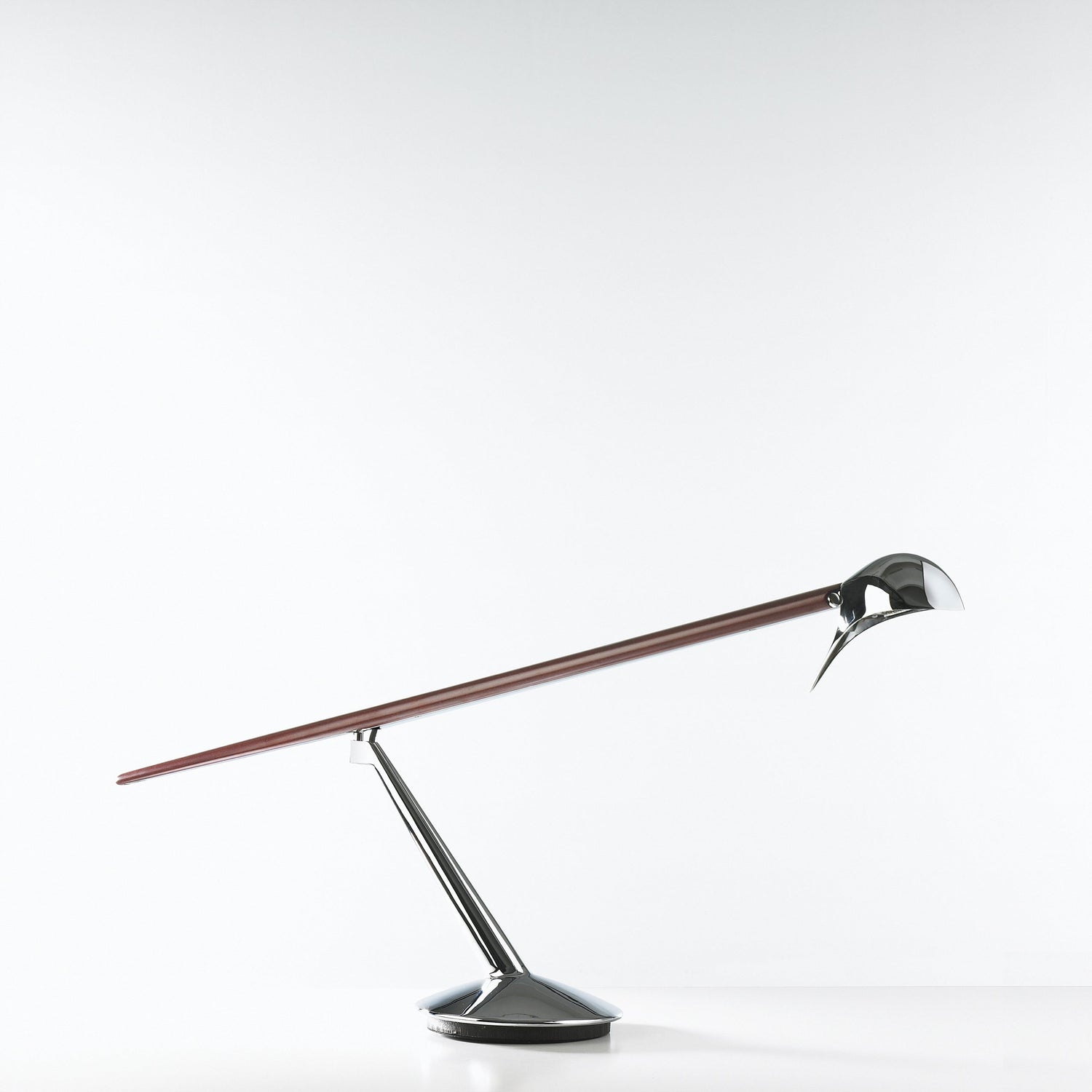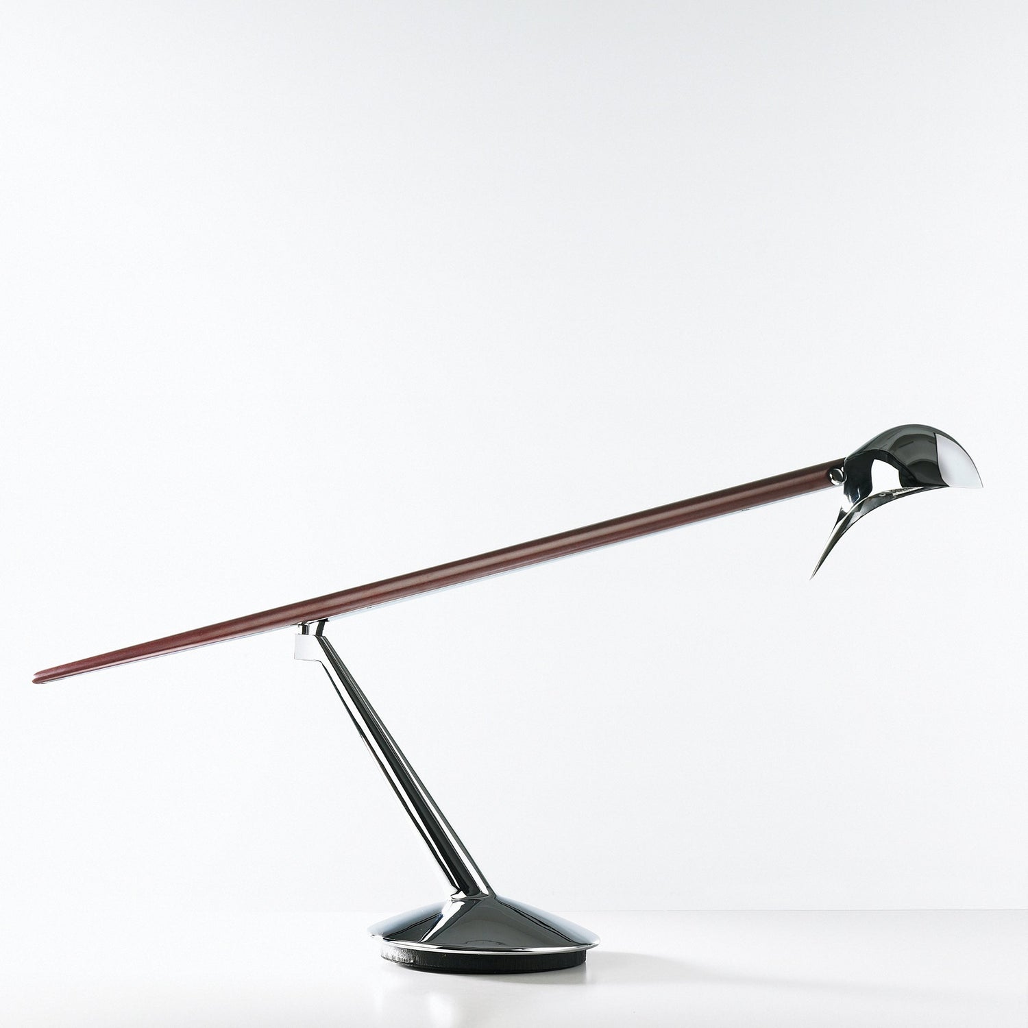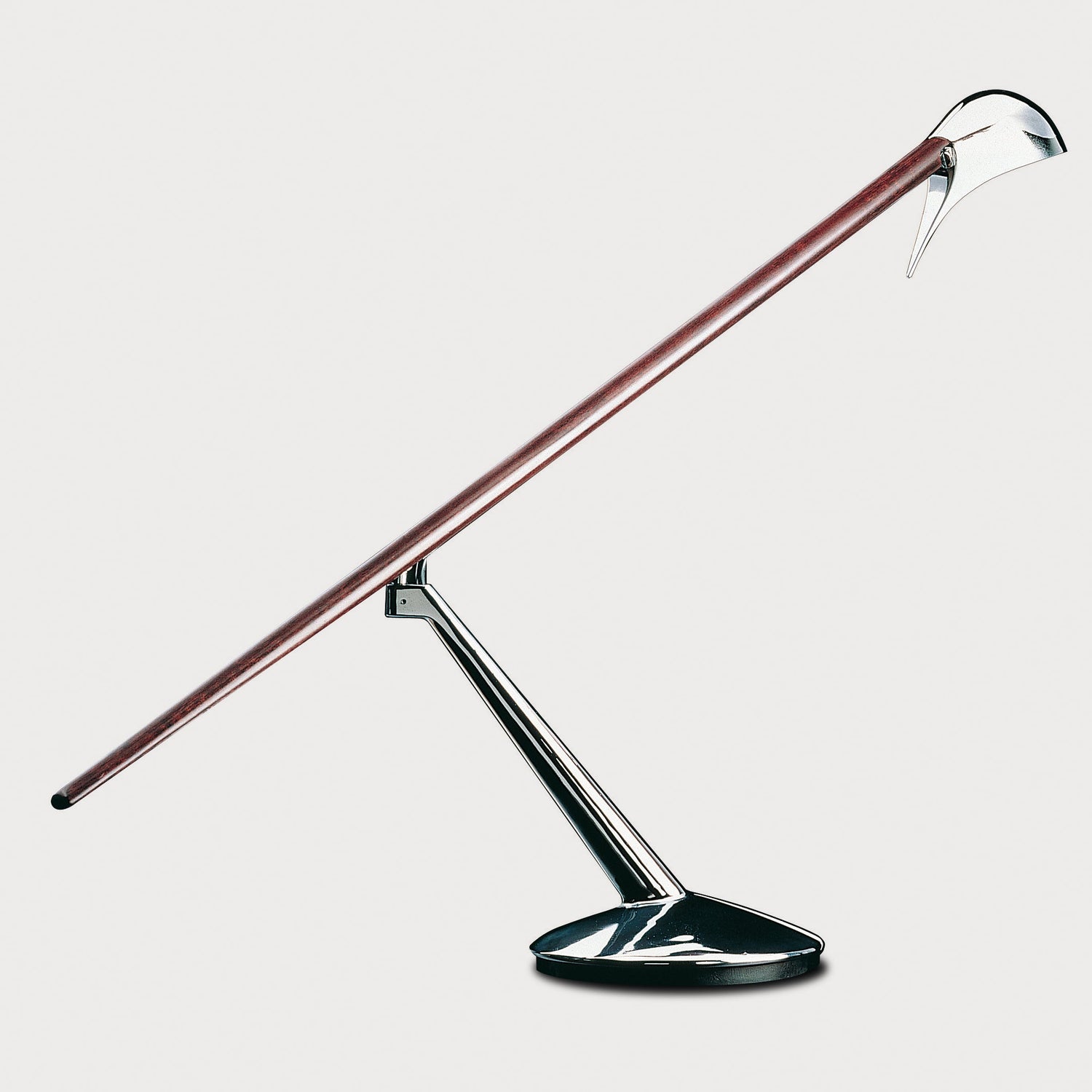Designed by Jorge Pensi, a single balanced piece of lacquered mahogany swivels on a base of polished chrome creating a stylish fully pivoting table lamp.