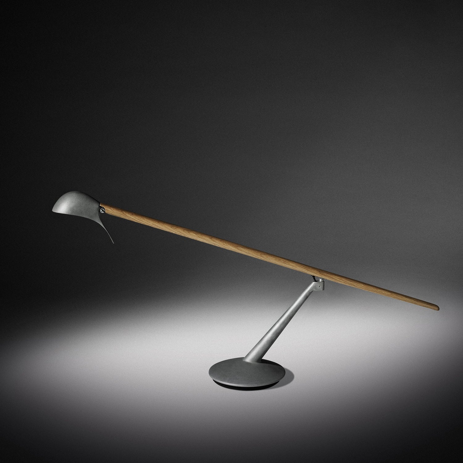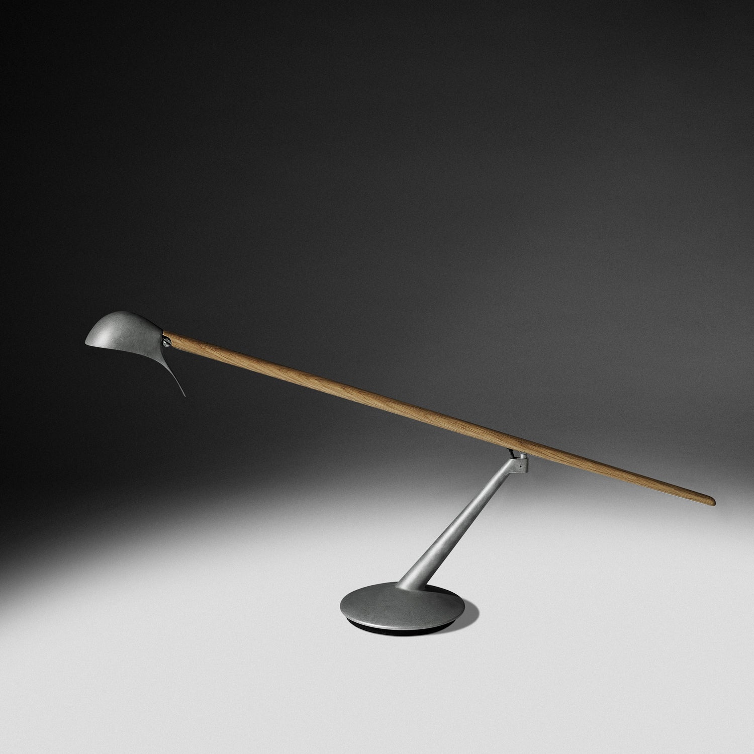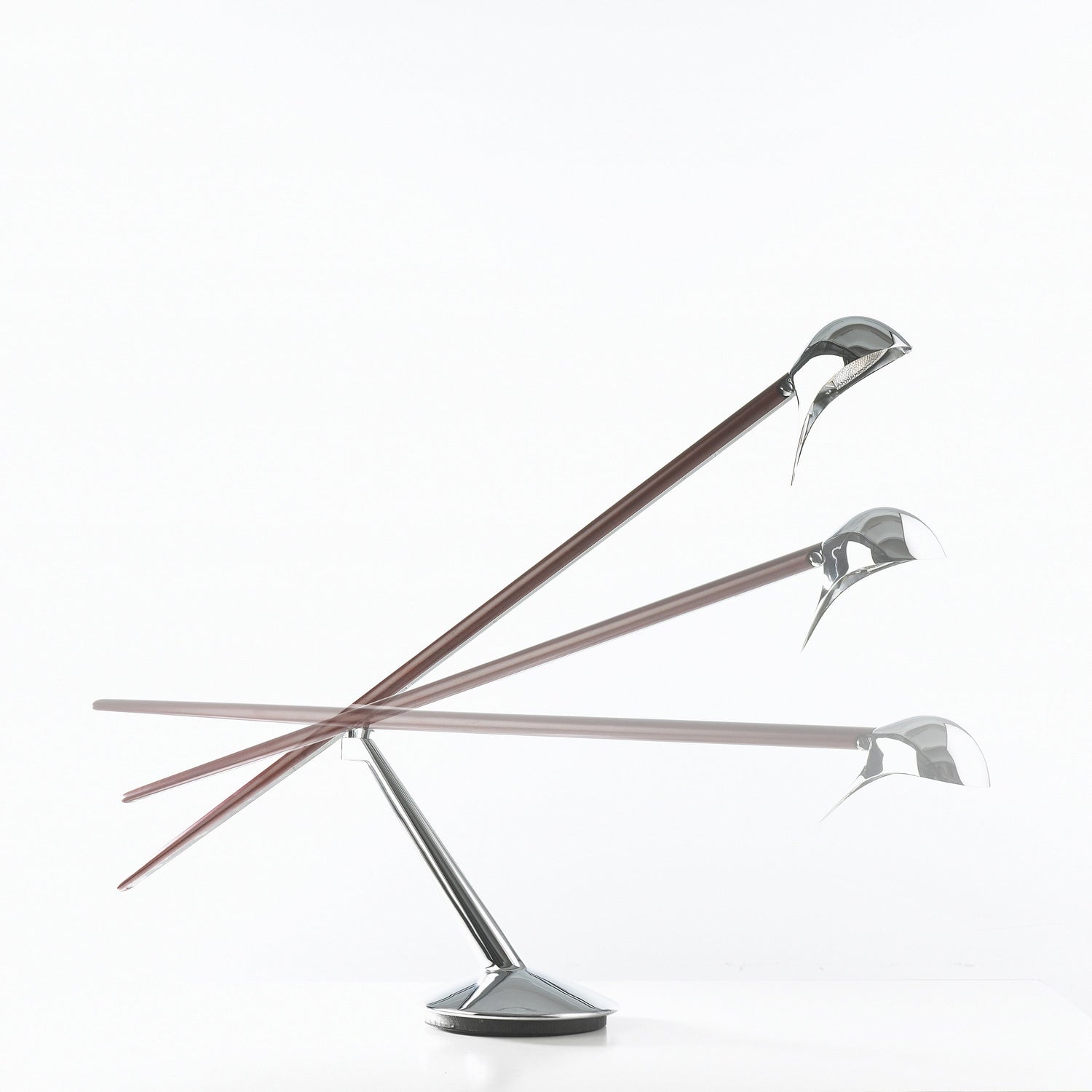Designed by Jorge Pensi, a single balanced piece of lacquered mahogany swivels on a base of polished chrome creating a stylish fully pivoting table lamp.