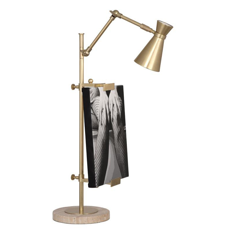 - Available in Antique Brass finish with Honed Travertine base